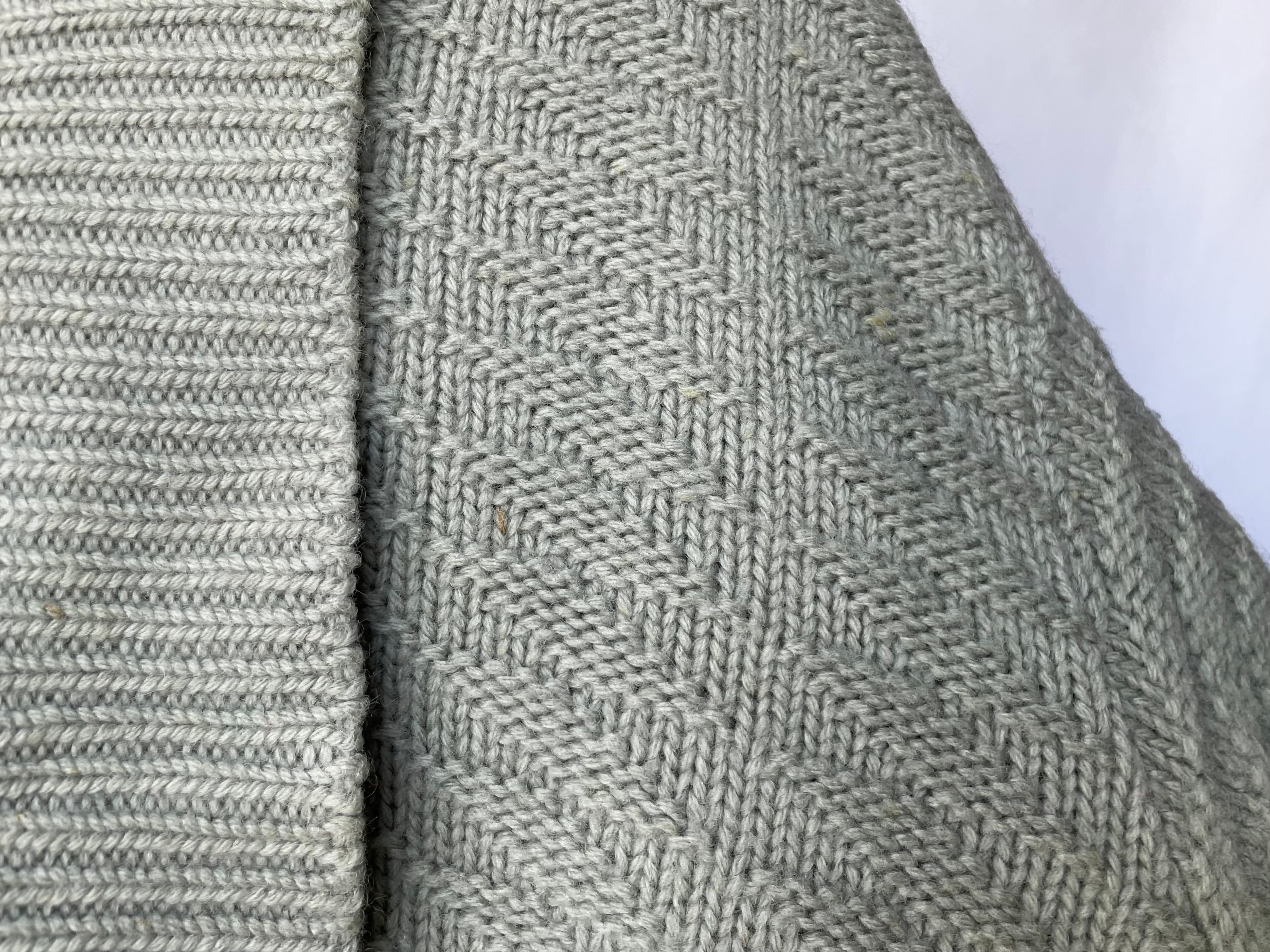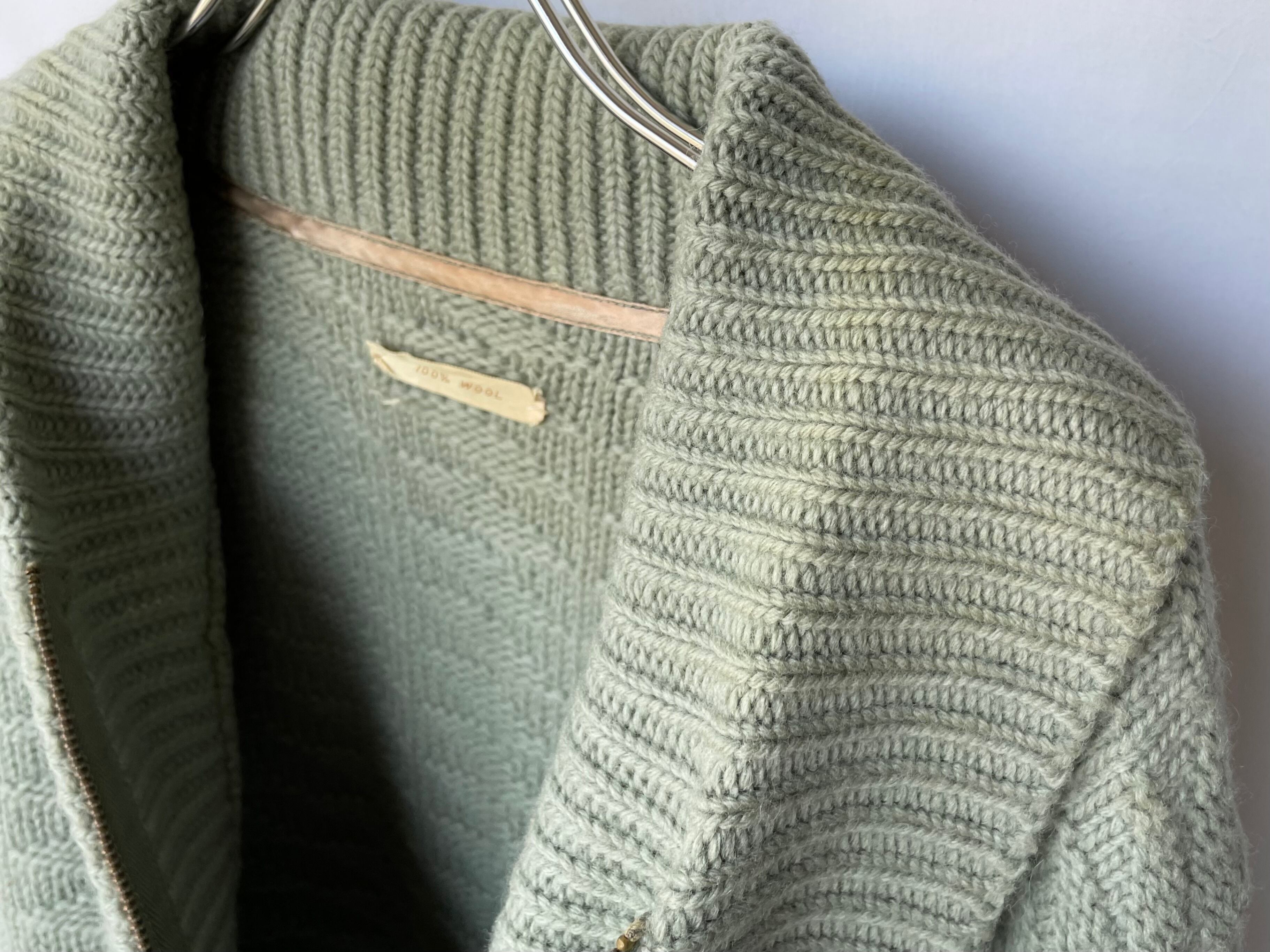 胸元で生地を折り返すことにより角が生まれる、変則的なショールカラーデザイン。