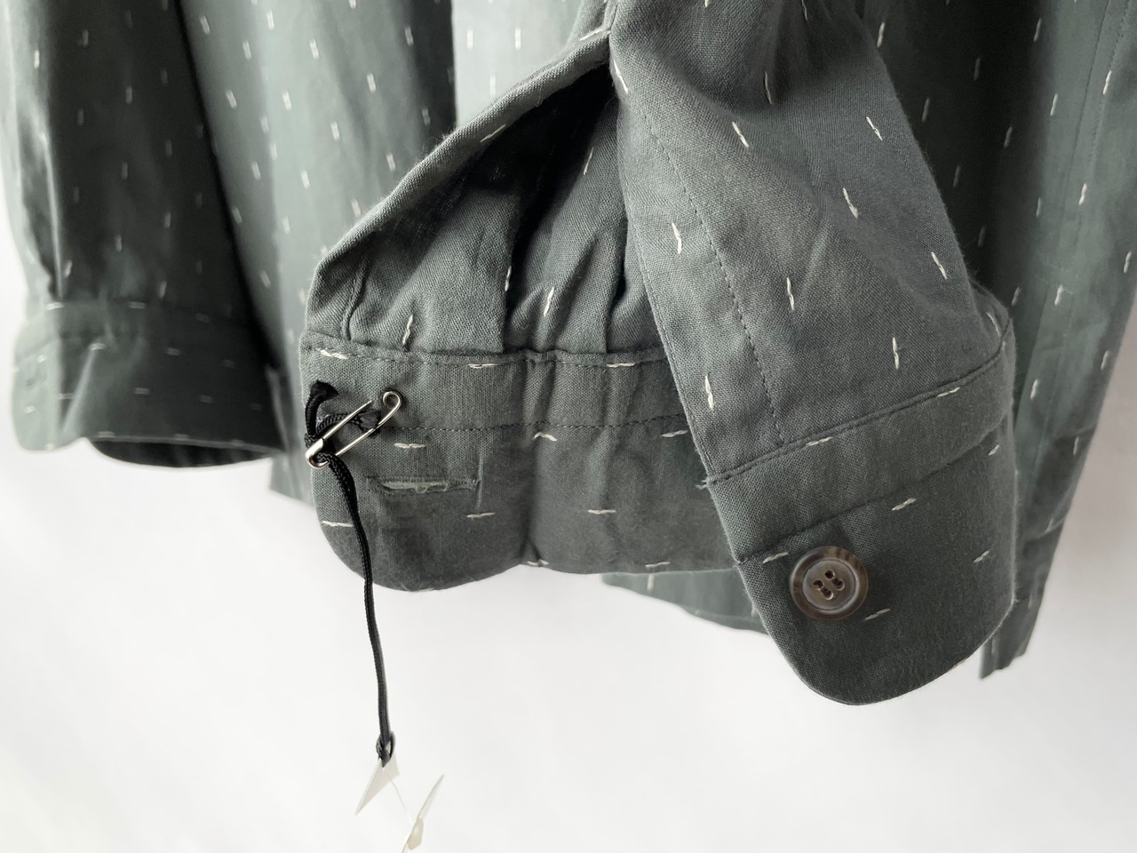 ボタン留めのパッチポケット、シャツアイテムにおいてのやや大ぶりなフロントボタン。