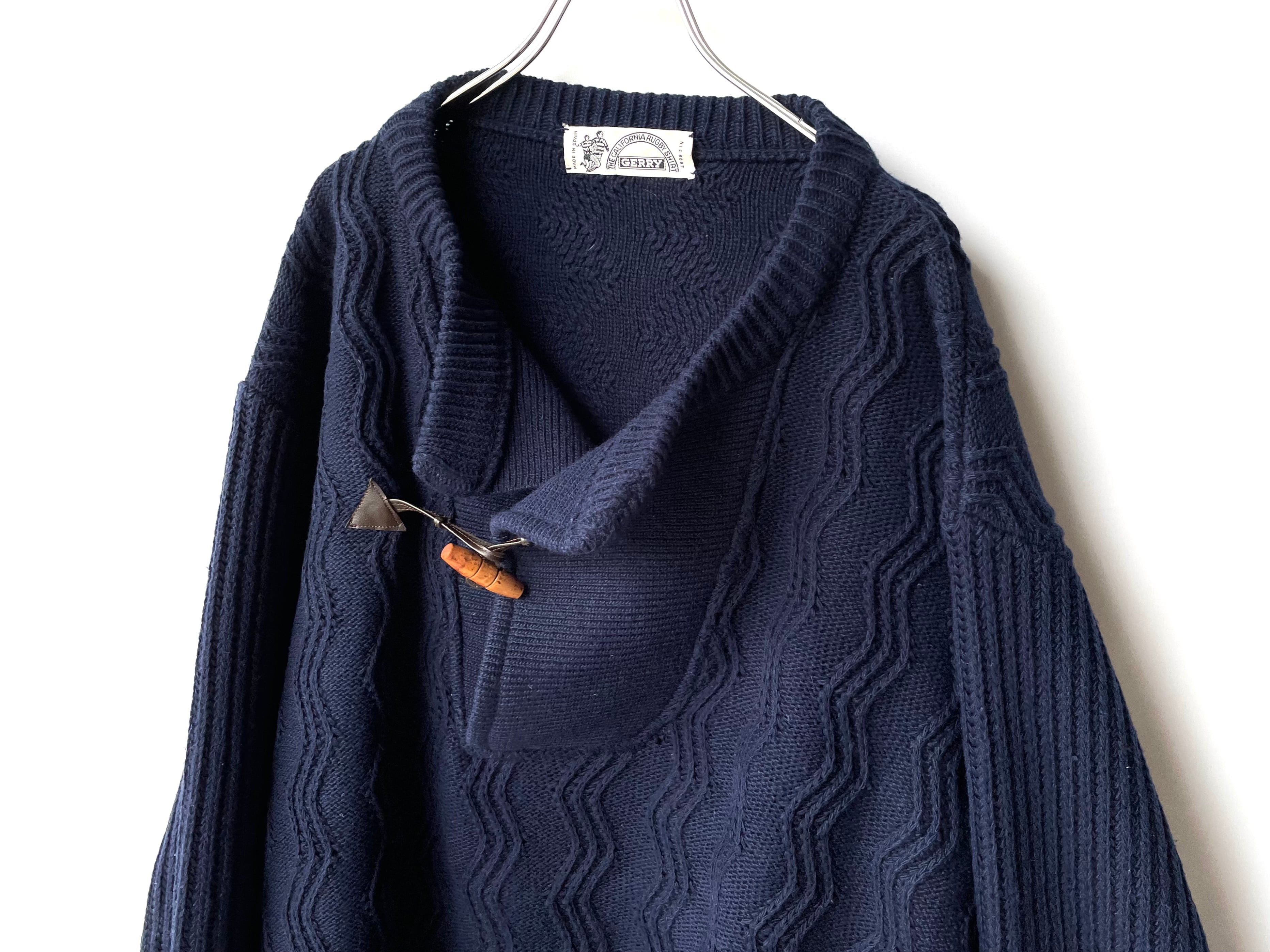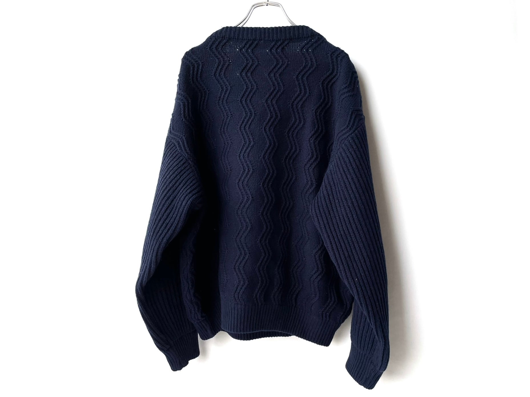 深い濃紺のボディカラー、身頃/袖/ブザムでの3種の編み柄切り替え。