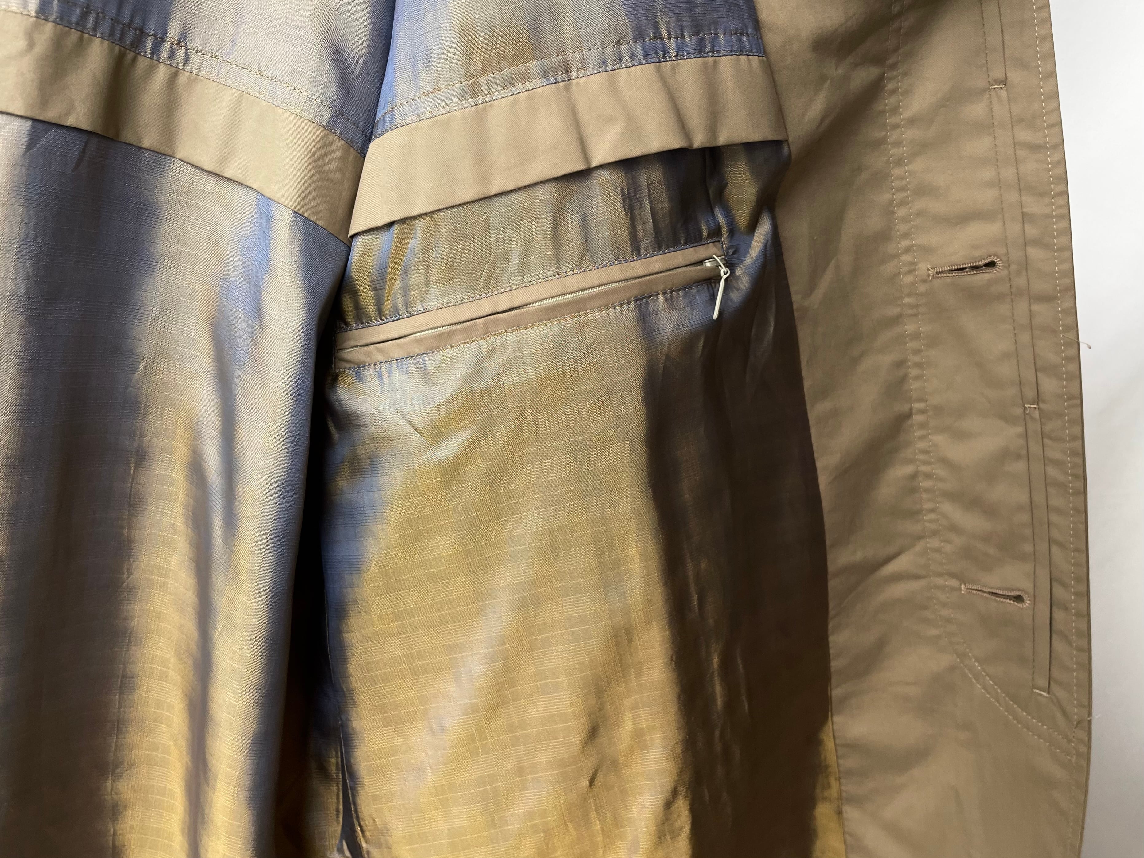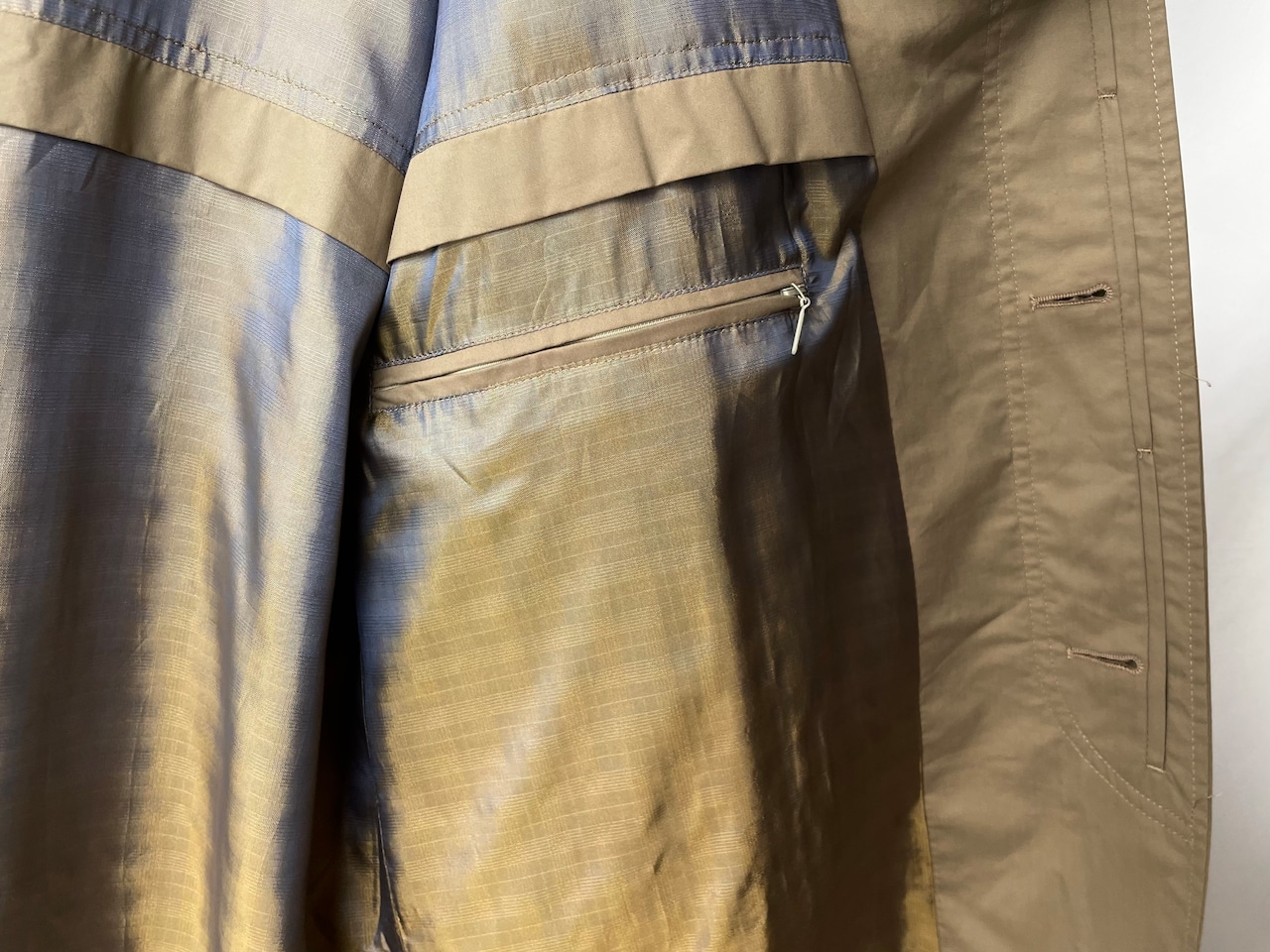 襟裏やボタンホール、カフスなど、随所に見られる静かなブラウンレザー切り替え。