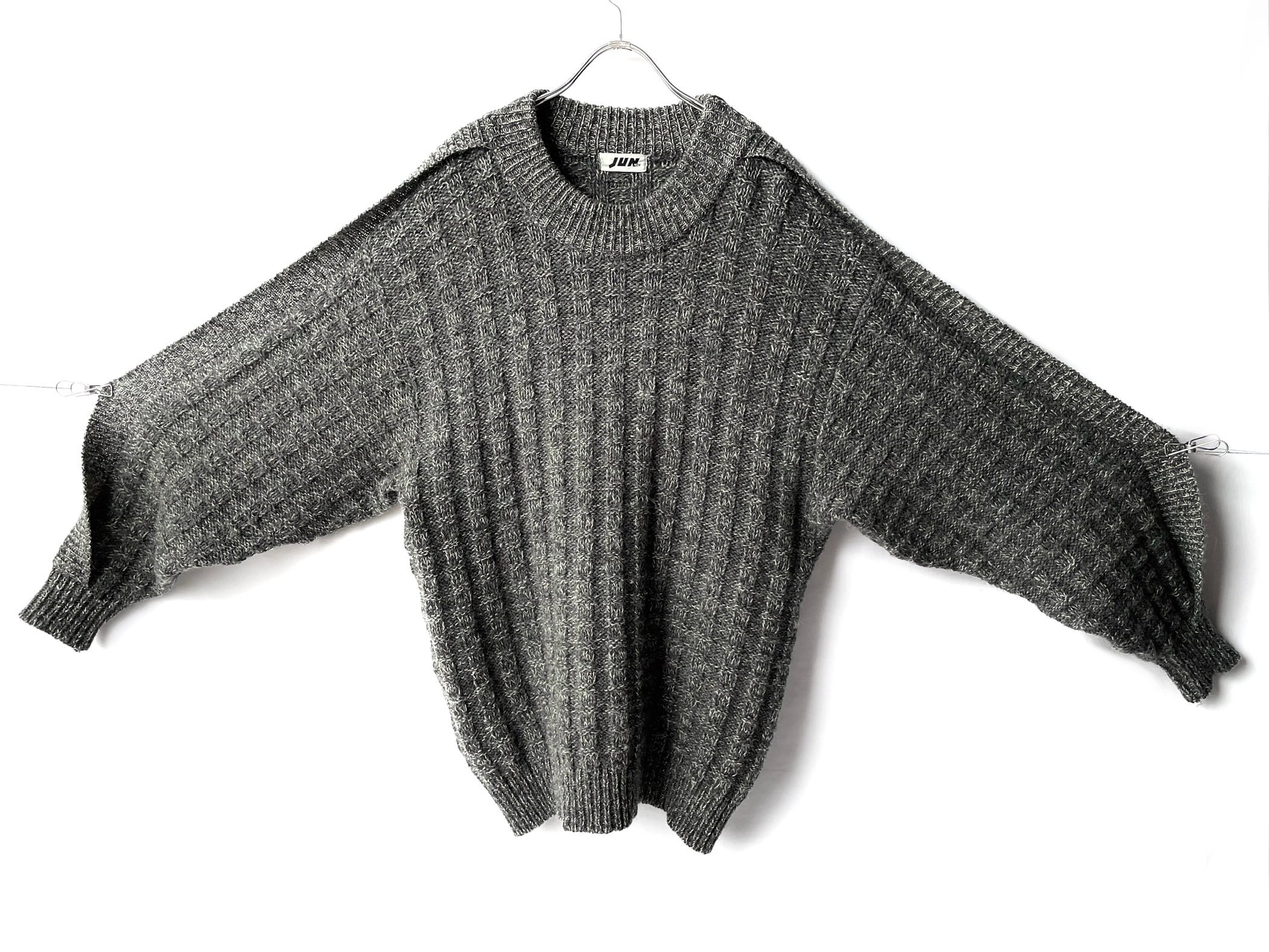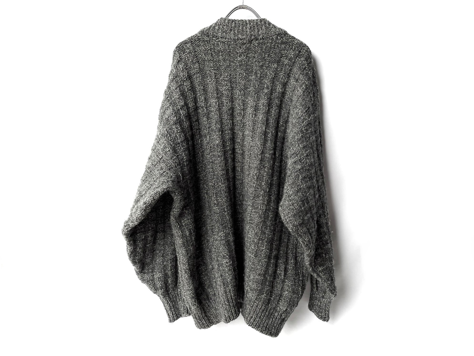グレー/アイボリーの毛糸が混じる斑らな編み模様。