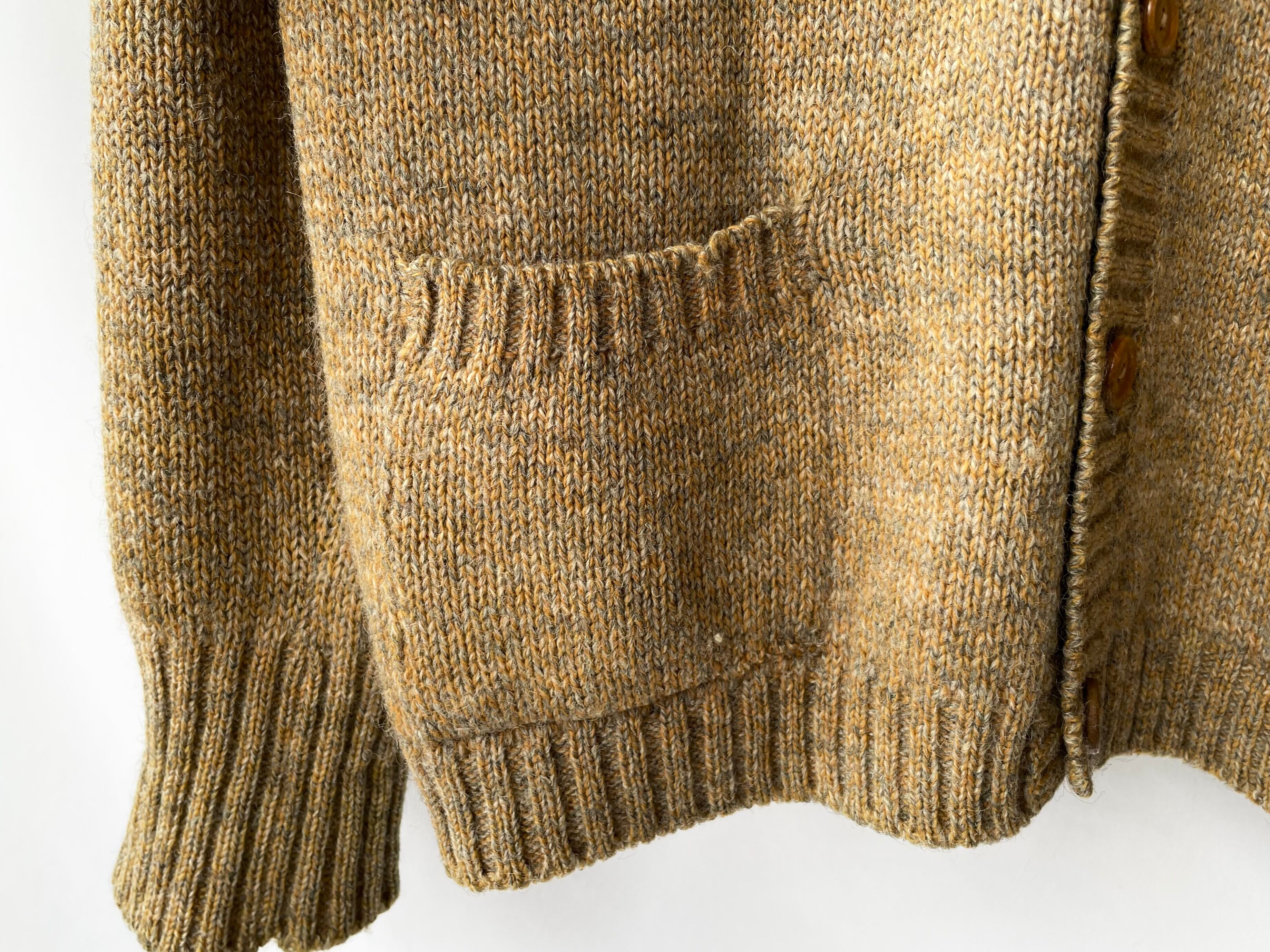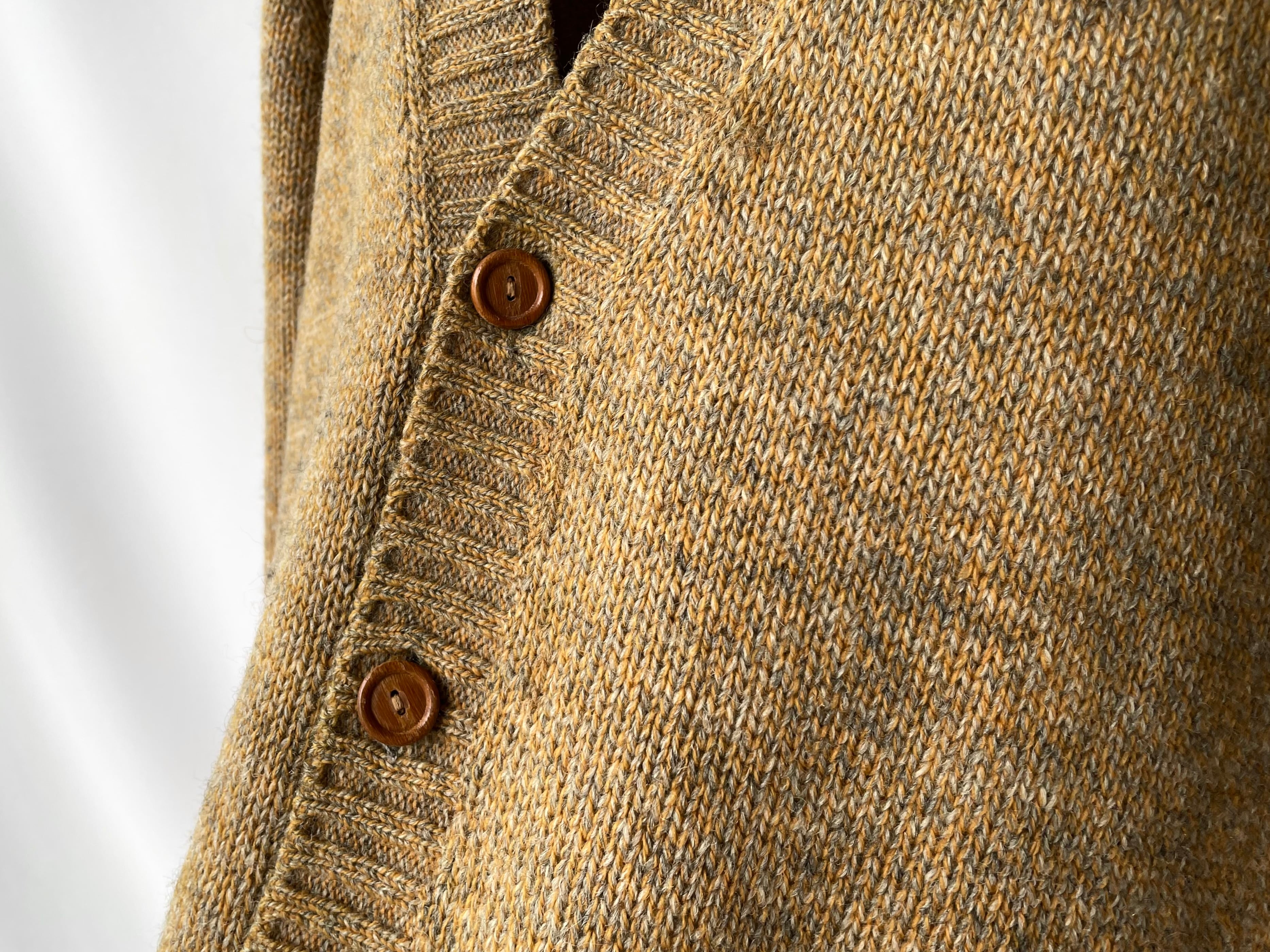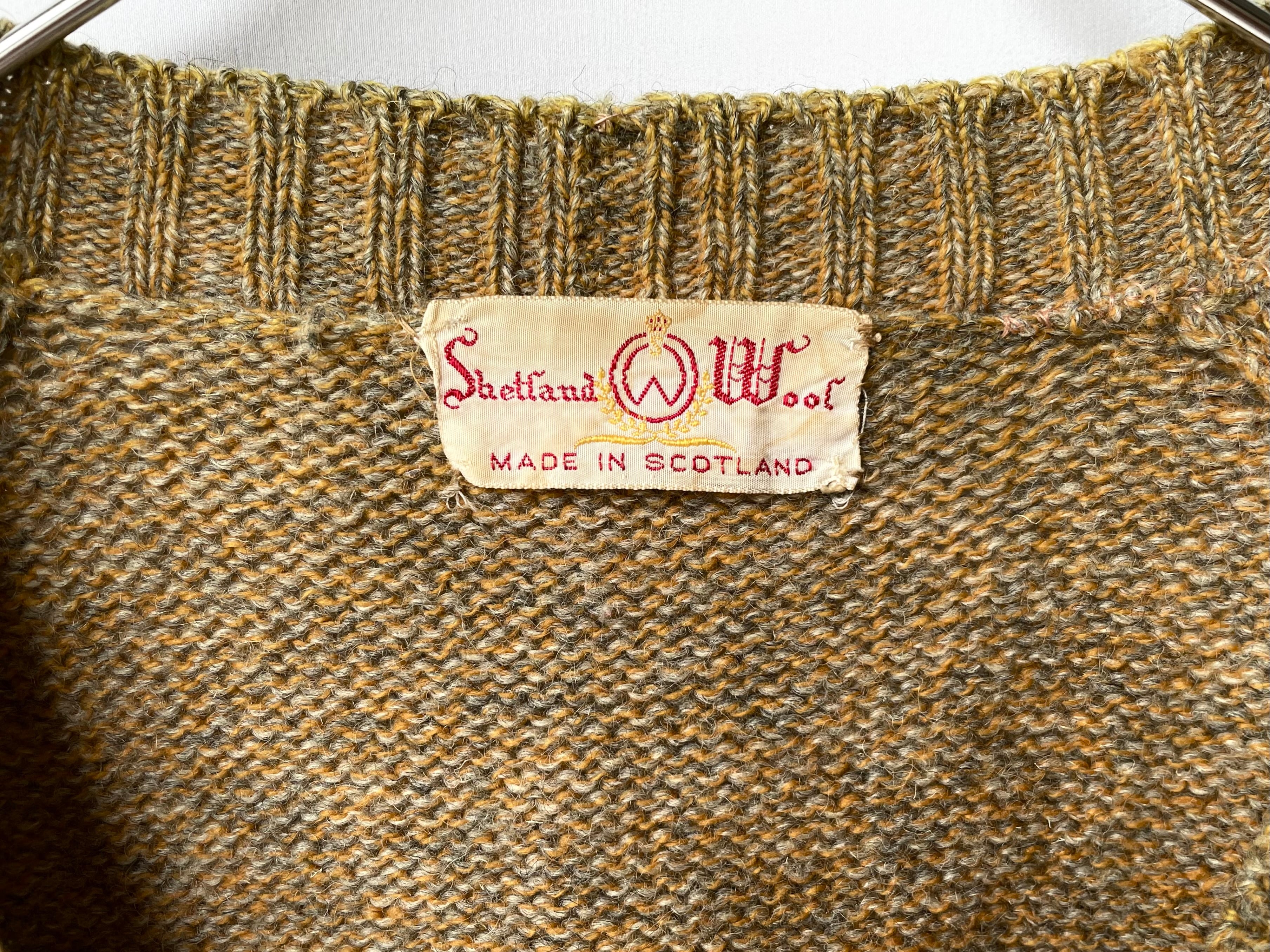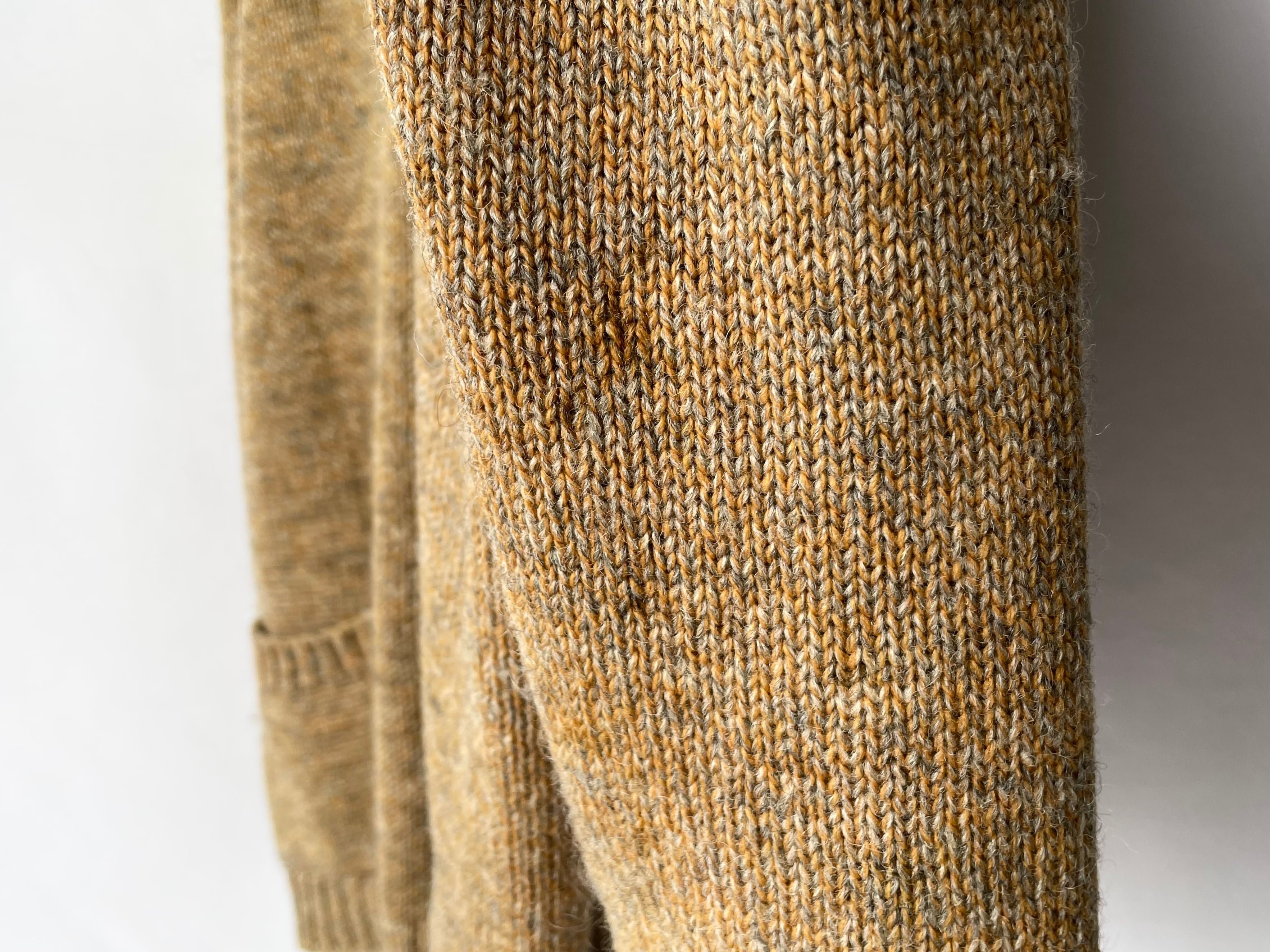 古い個体ならではの雰囲気のある乾いた質感のシェットランドウールに、二つ穴の素朴な木製ボタン。