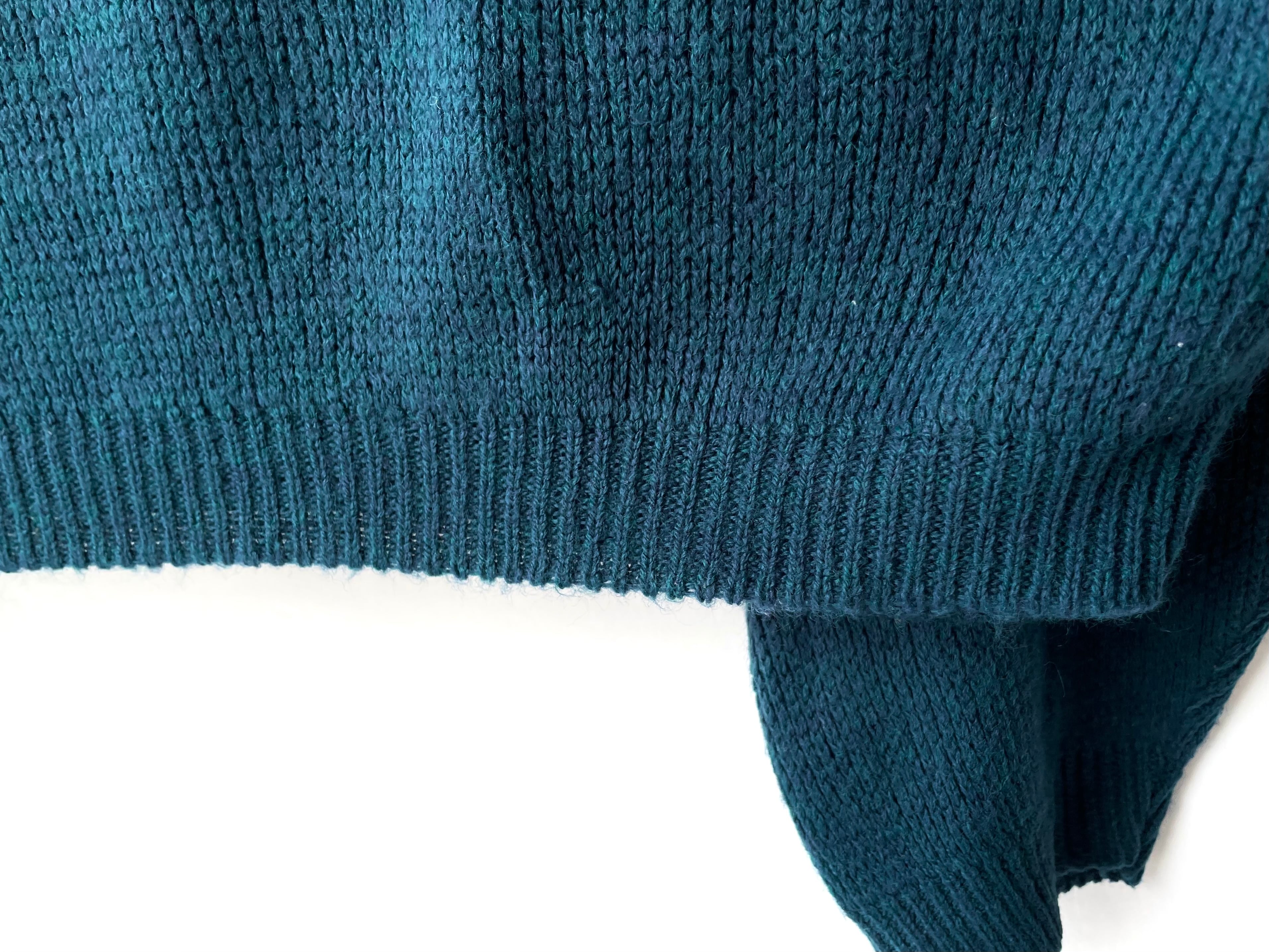 深いブルーグリーン×青紫の2色の毛糸が混じる奥行きのある編み地。