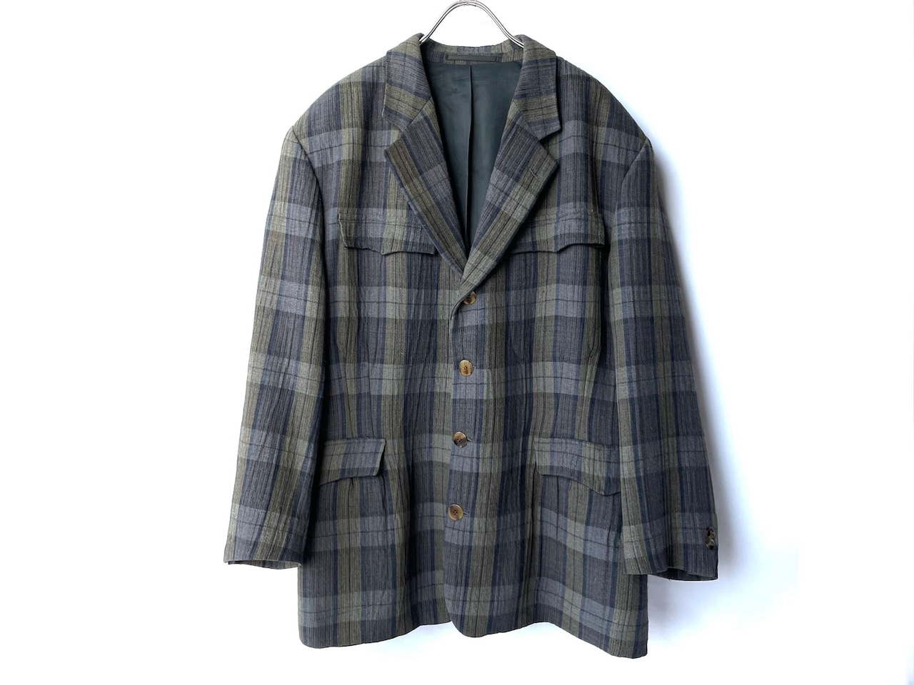 ネイビーブルーからグレー、カーキグリーンの糸が重なり合うオーバーチェック。