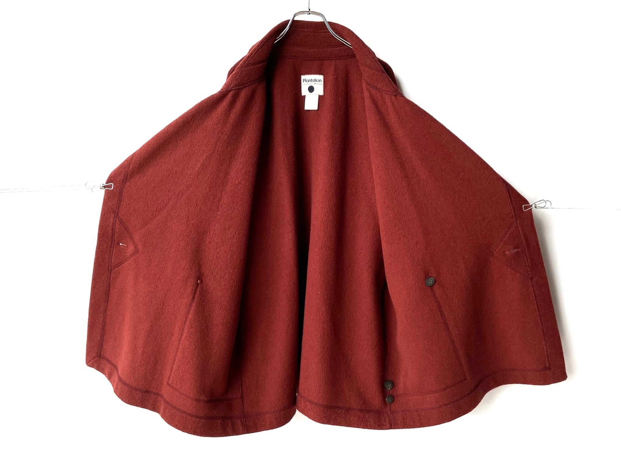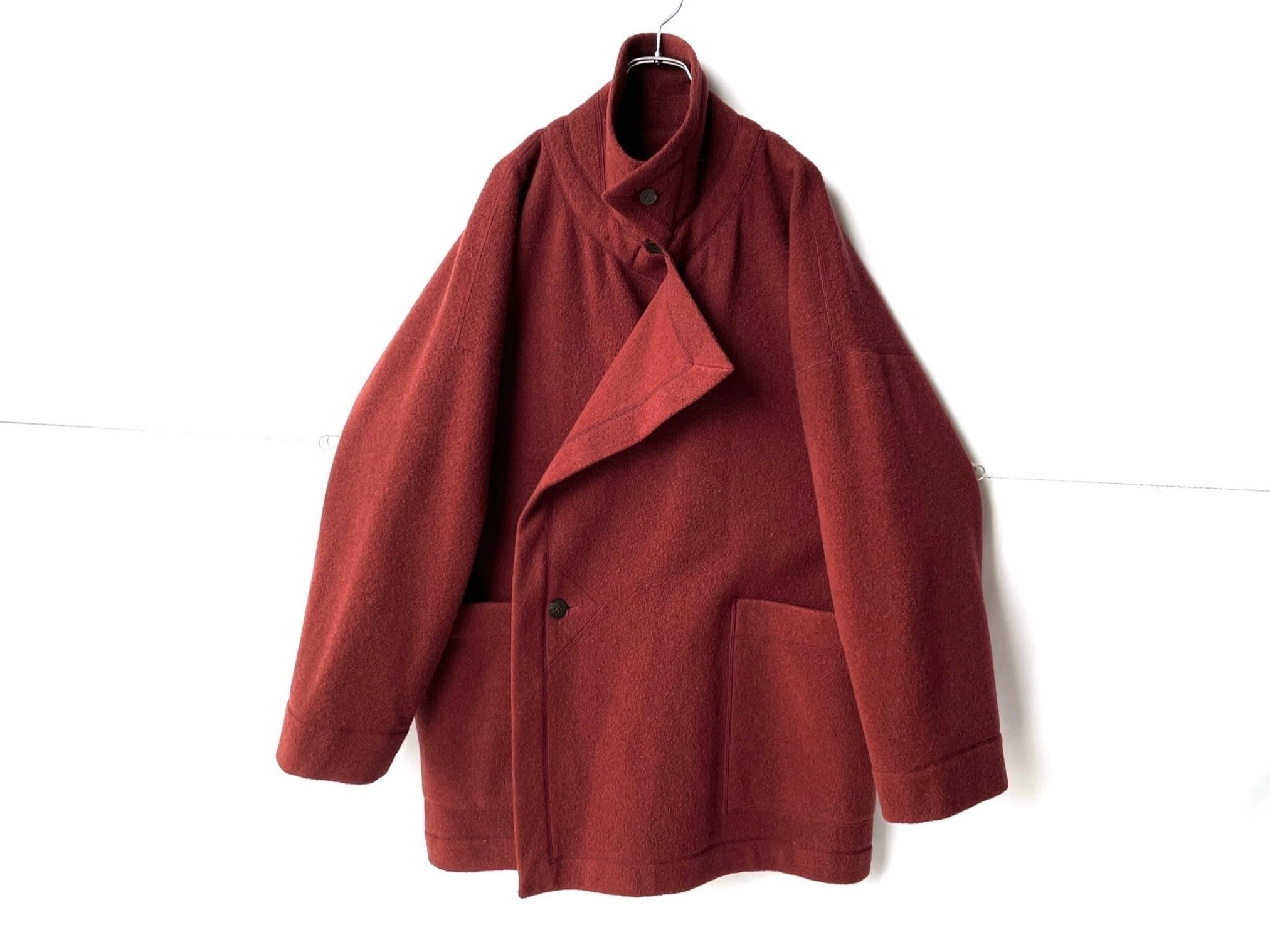 腹部のボタン、首元に三角のステッチが入る特殊なスタンドカラーデザイン。