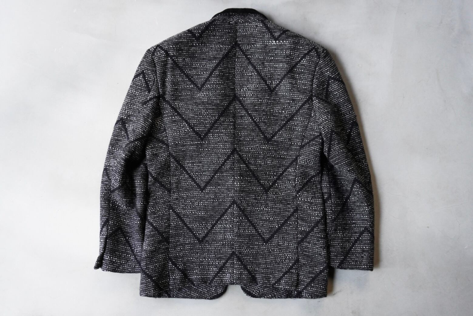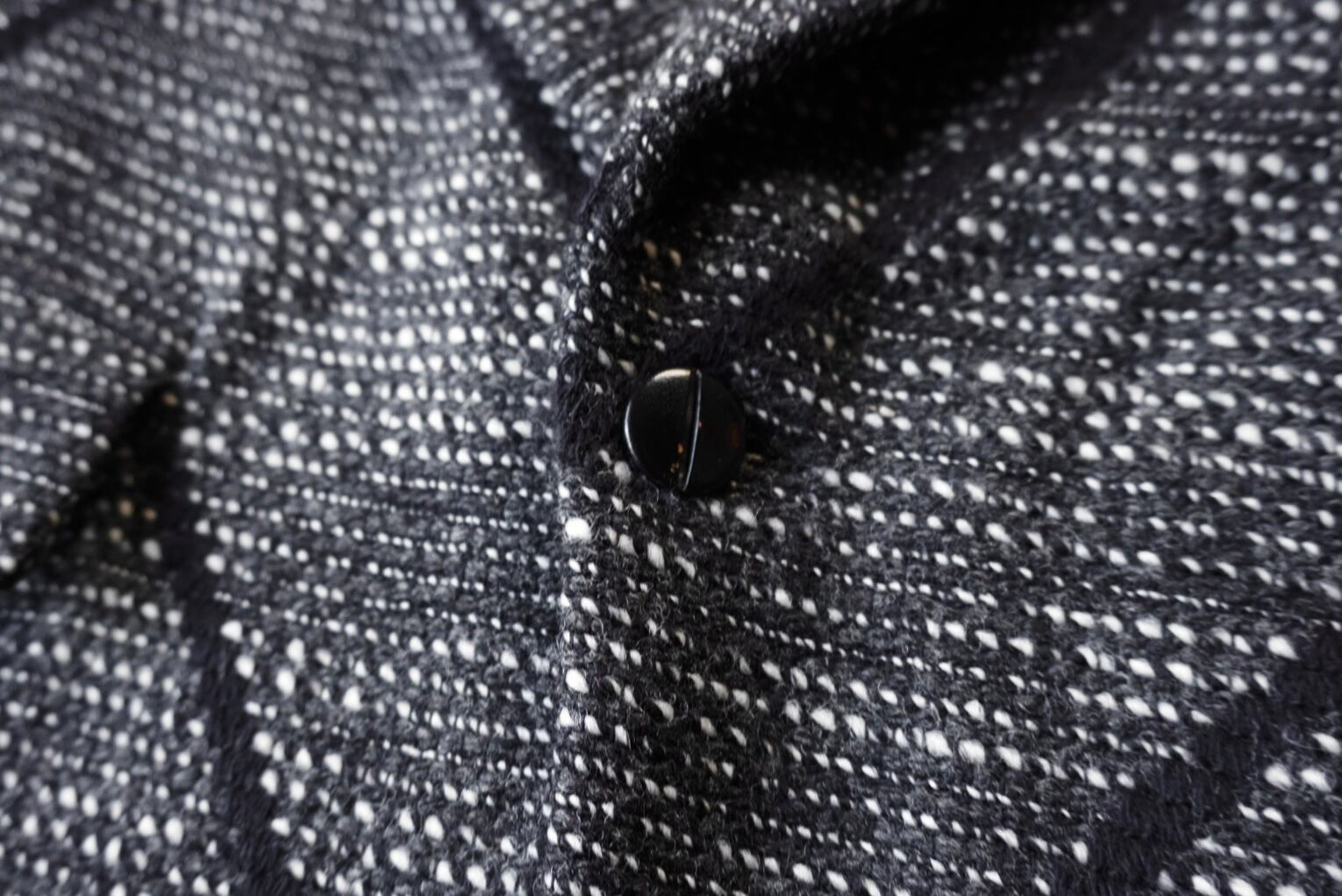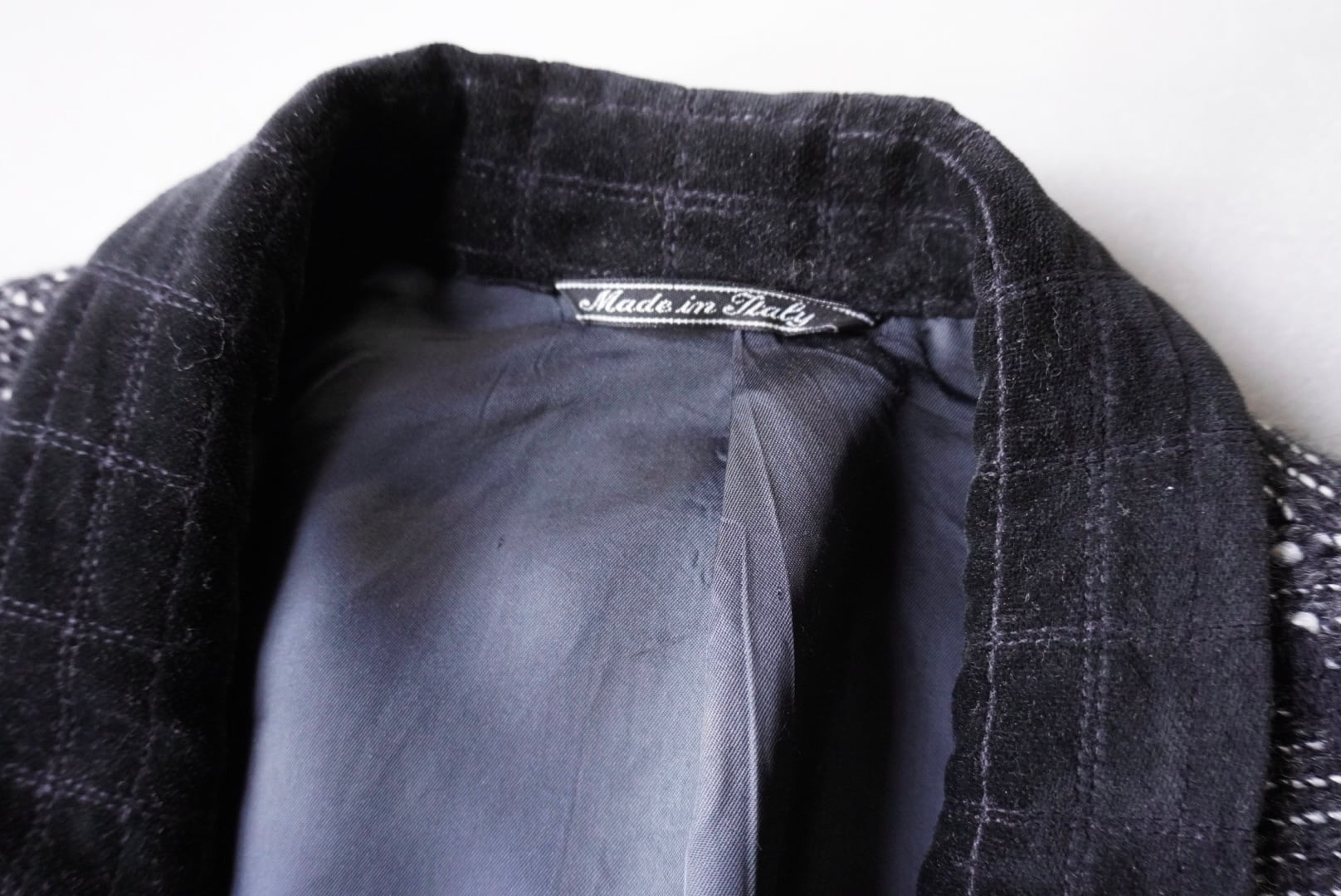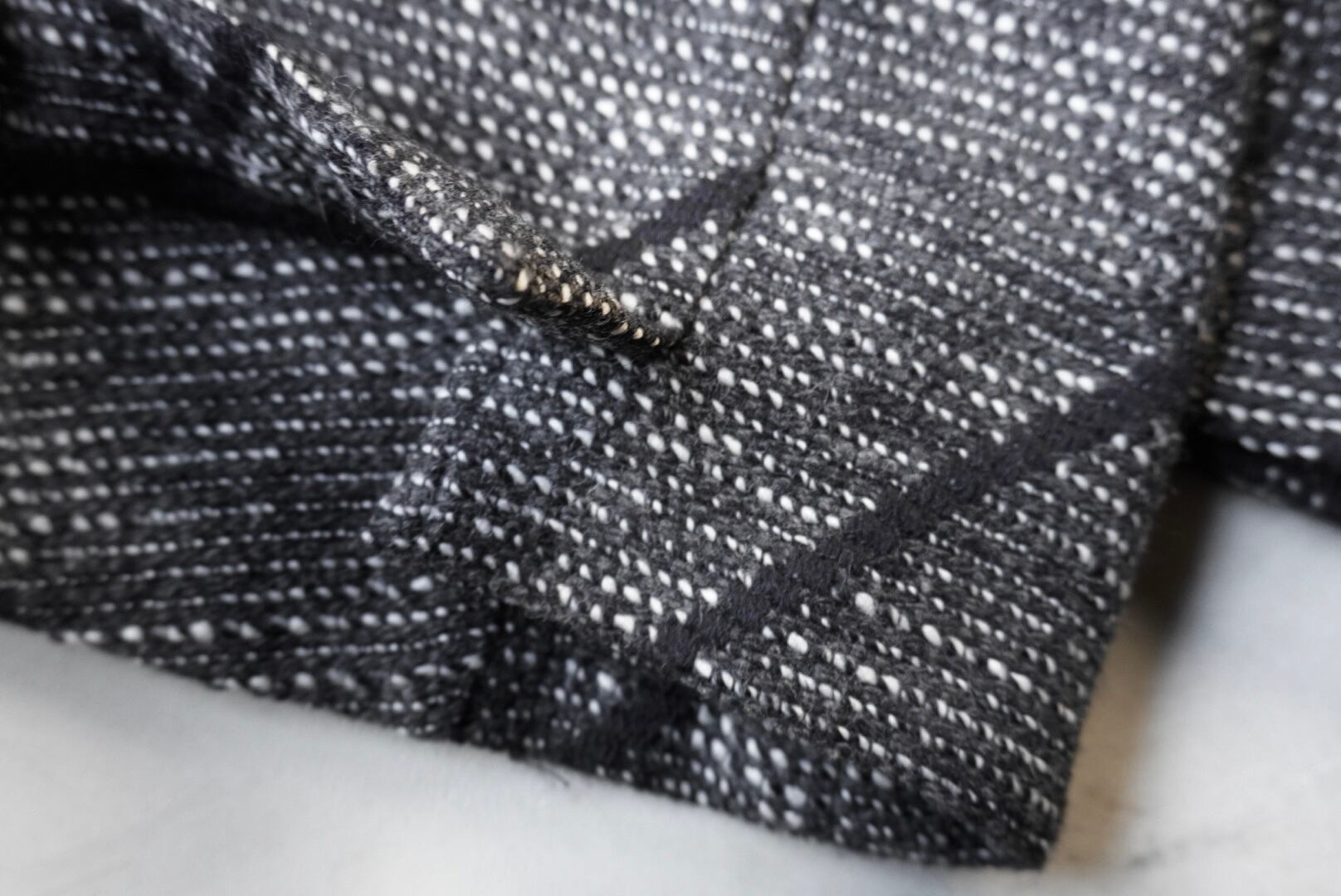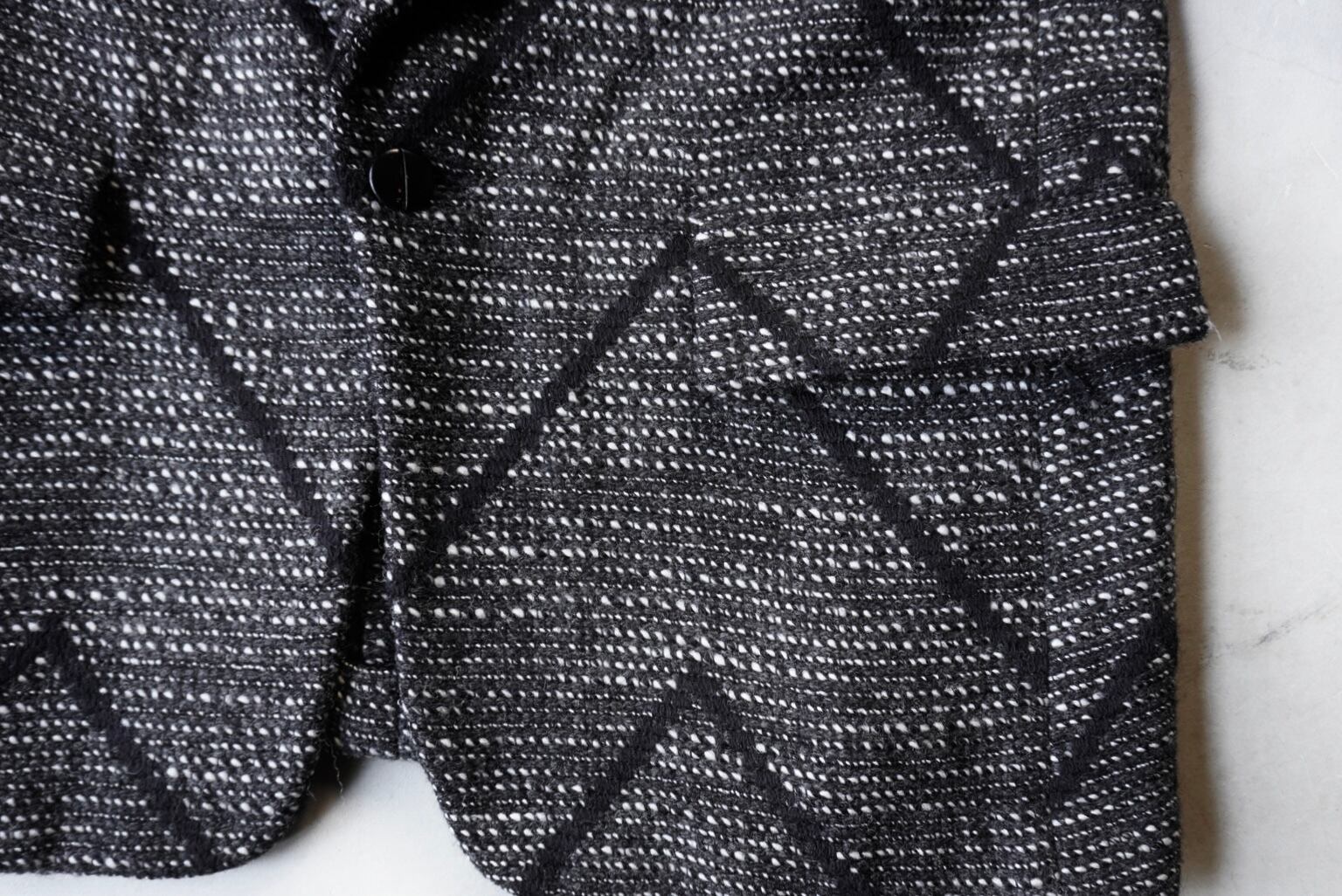 迫力のある白黒大判なギザギザの織柄生地に、細かな格子のステッチが乗ったブラックベロアの切り替え。