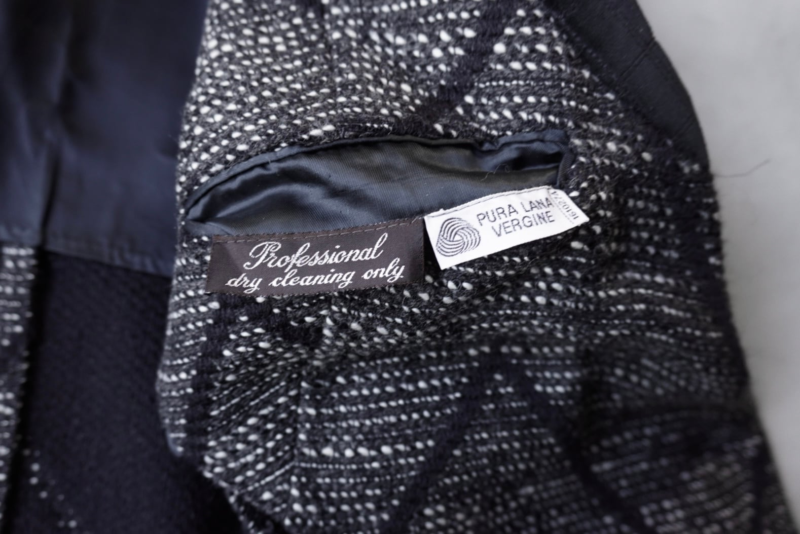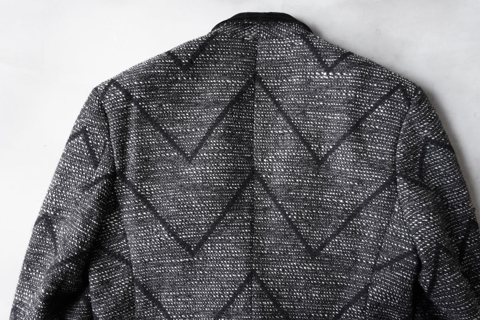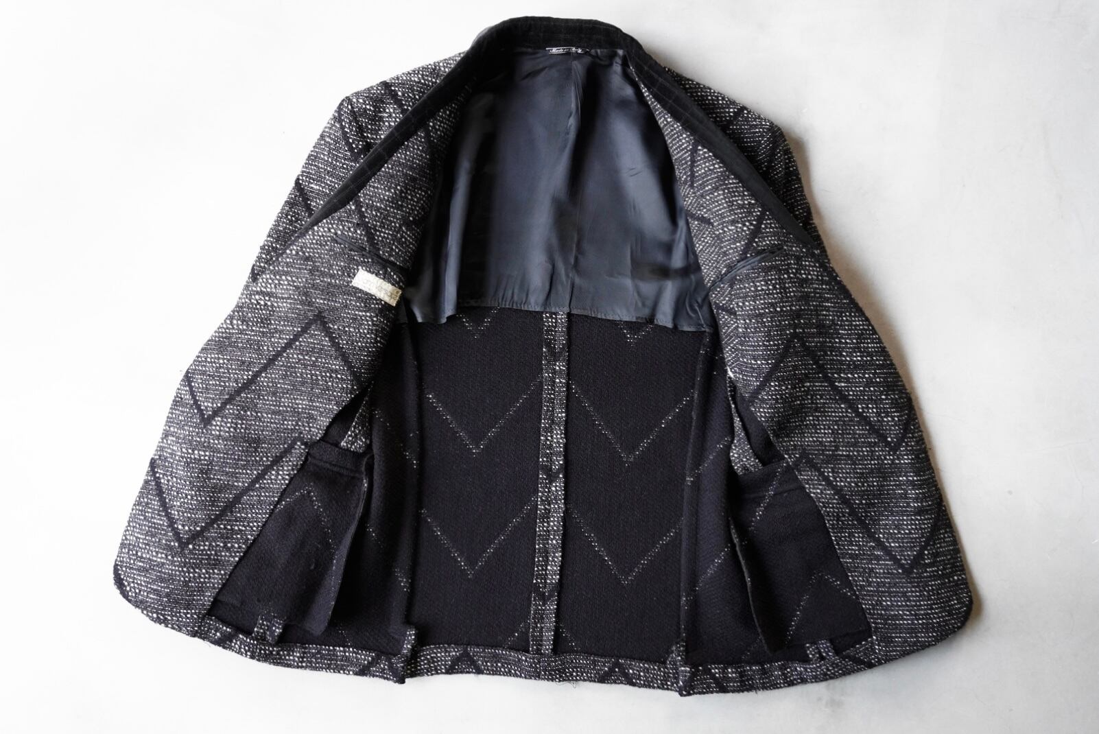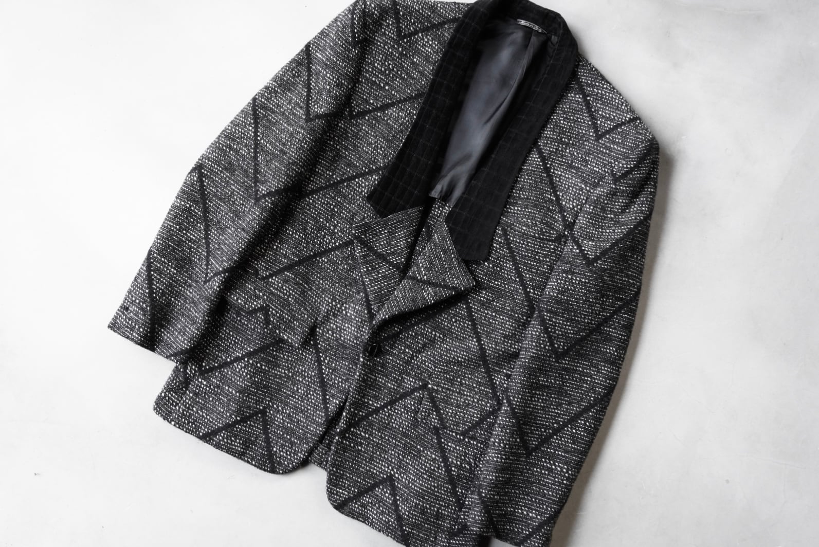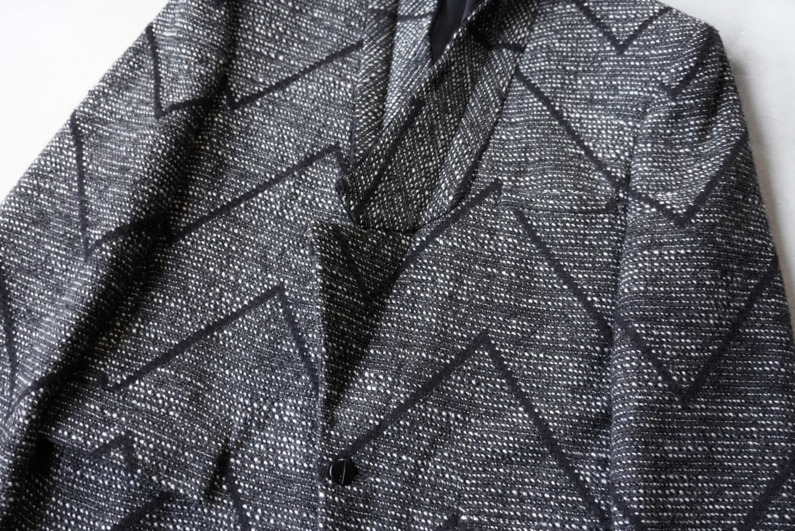 迫力のある白黒大判なギザギザの織柄生地に、細かな格子のステッチが乗ったブラックベロアの切り替え。