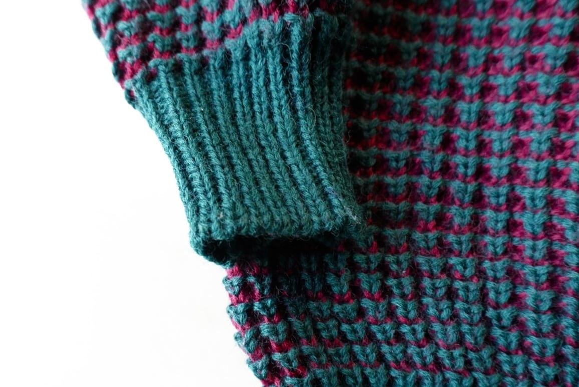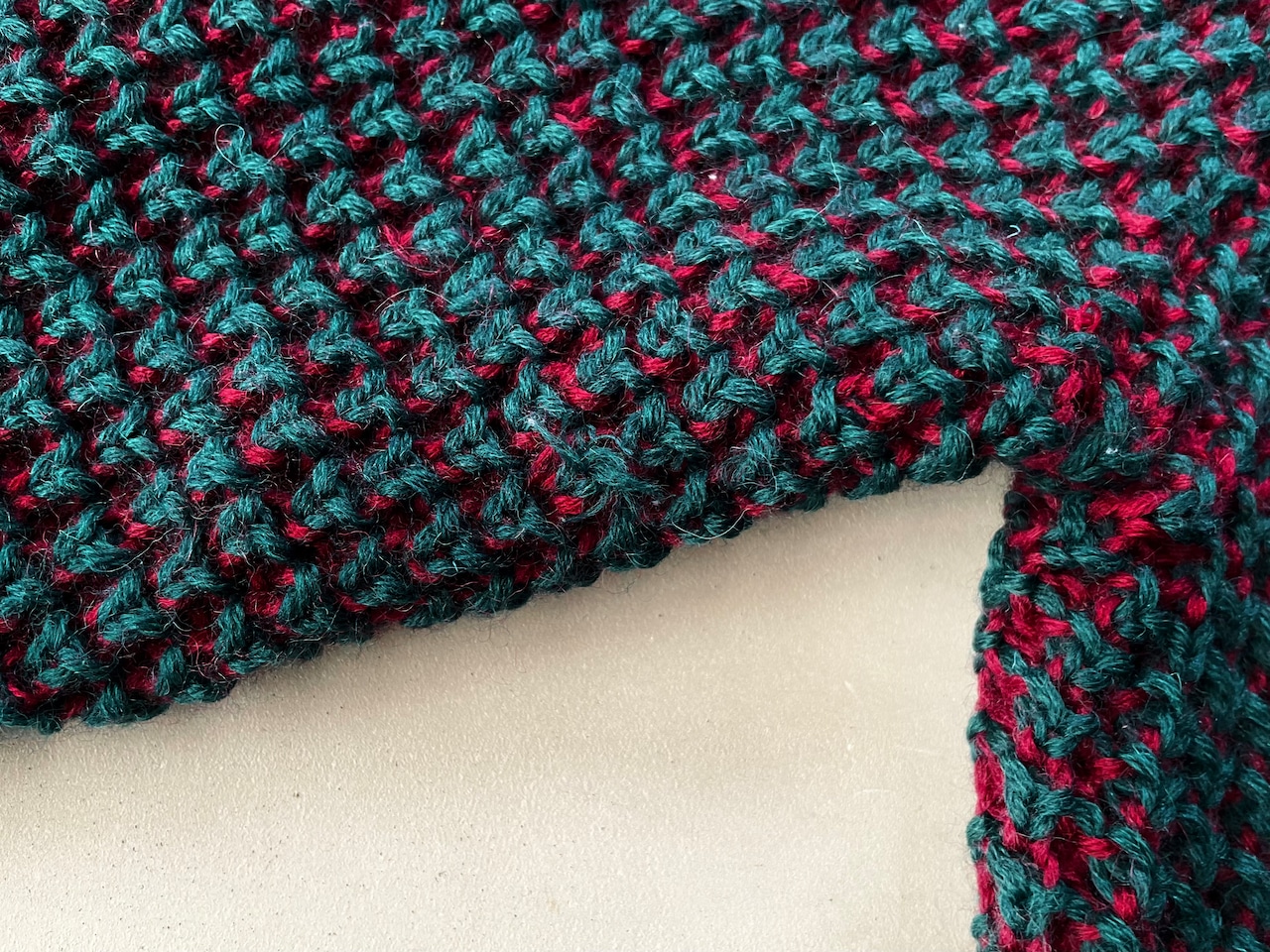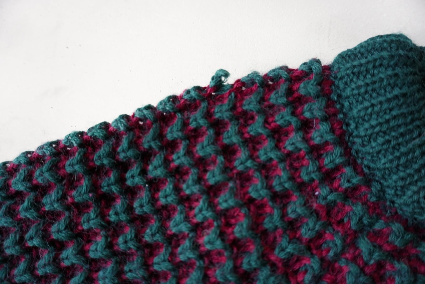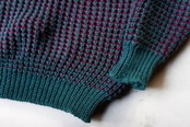 生地の伸縮で奥の深赤が見え隠れする、素晴らし表情の編み生地です。