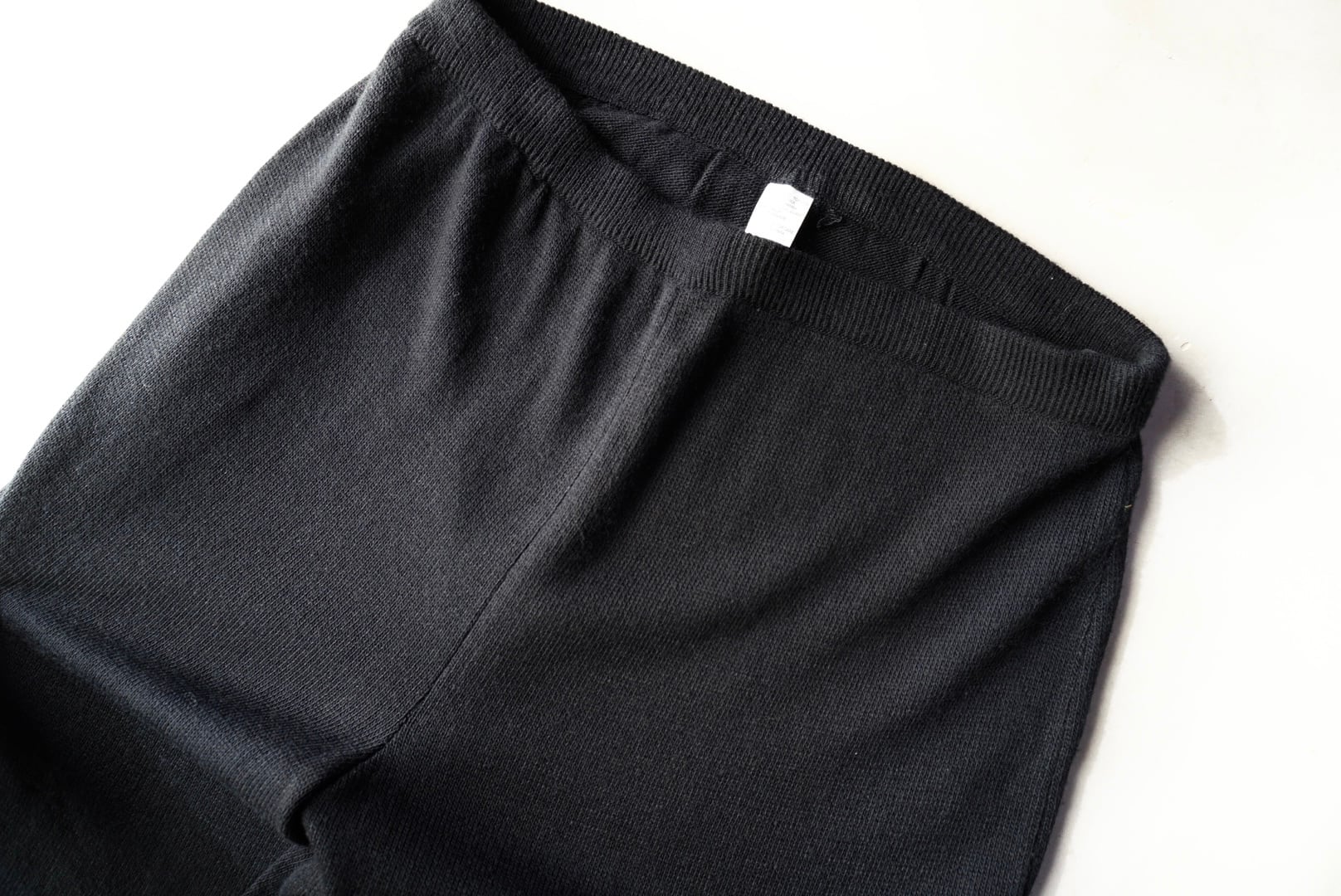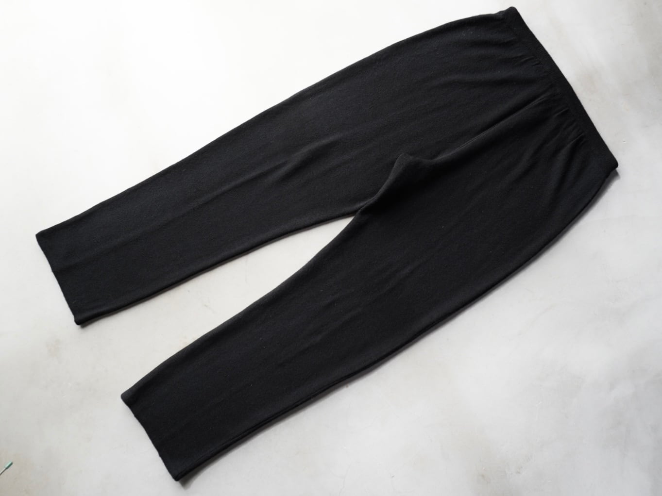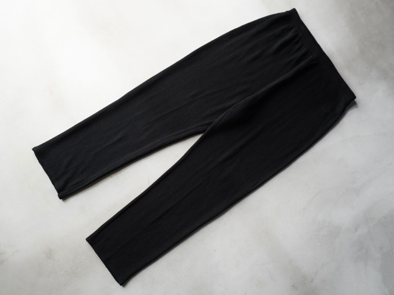 リブ無し、ワイドストレートシルエットのニットパンツ。