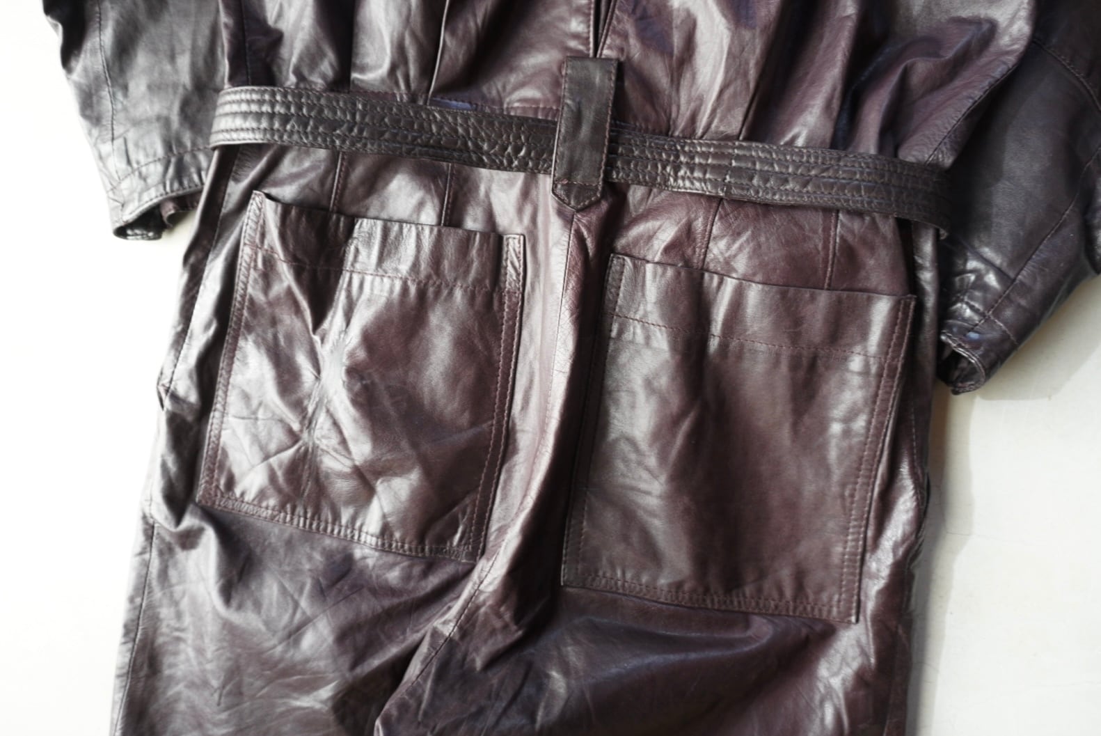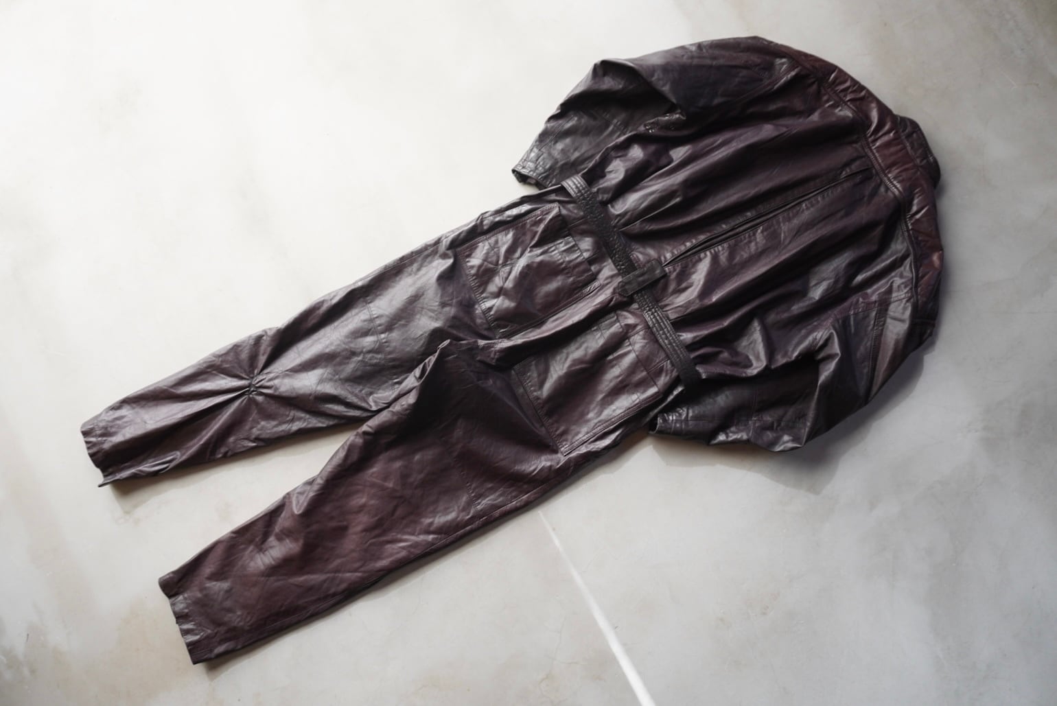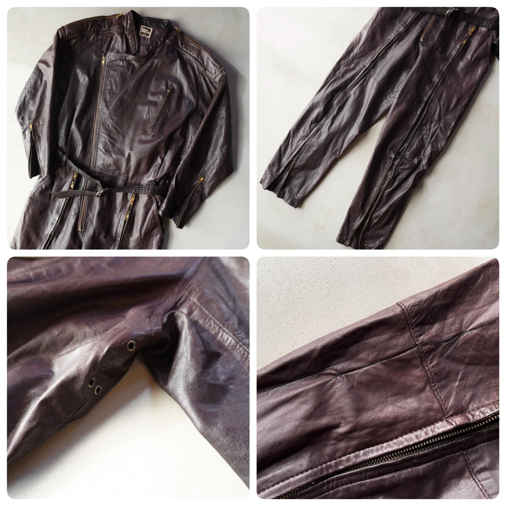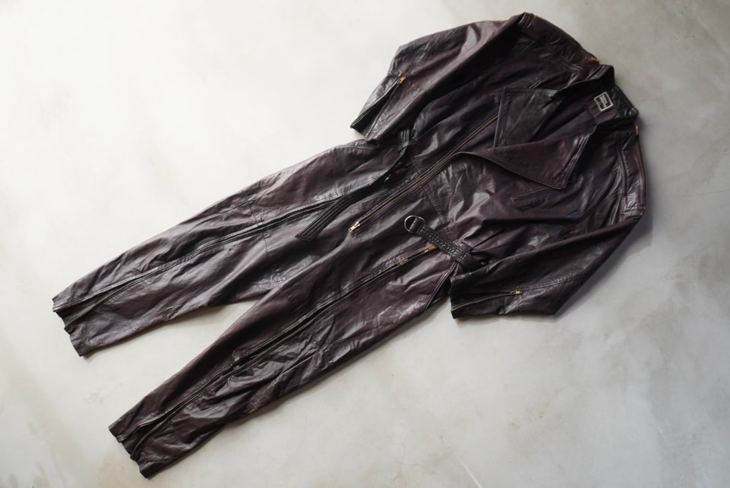 ほんのり赤みのあるブラウンレザーが使用された、ダブルのライダース仕様のスペシャルなジャンプスーツ。