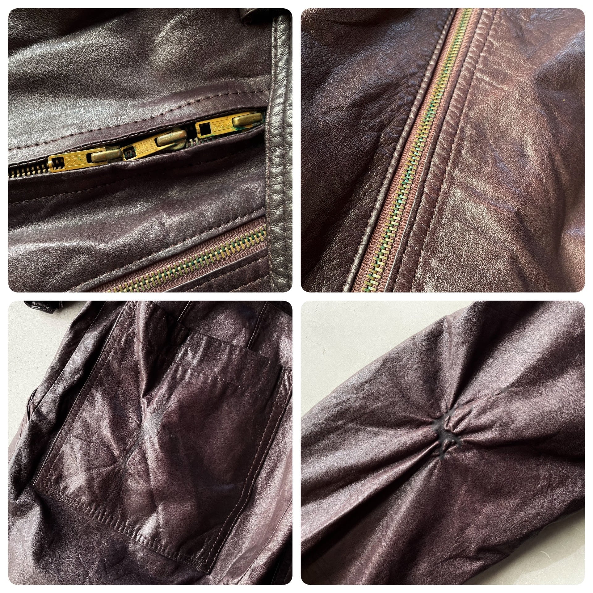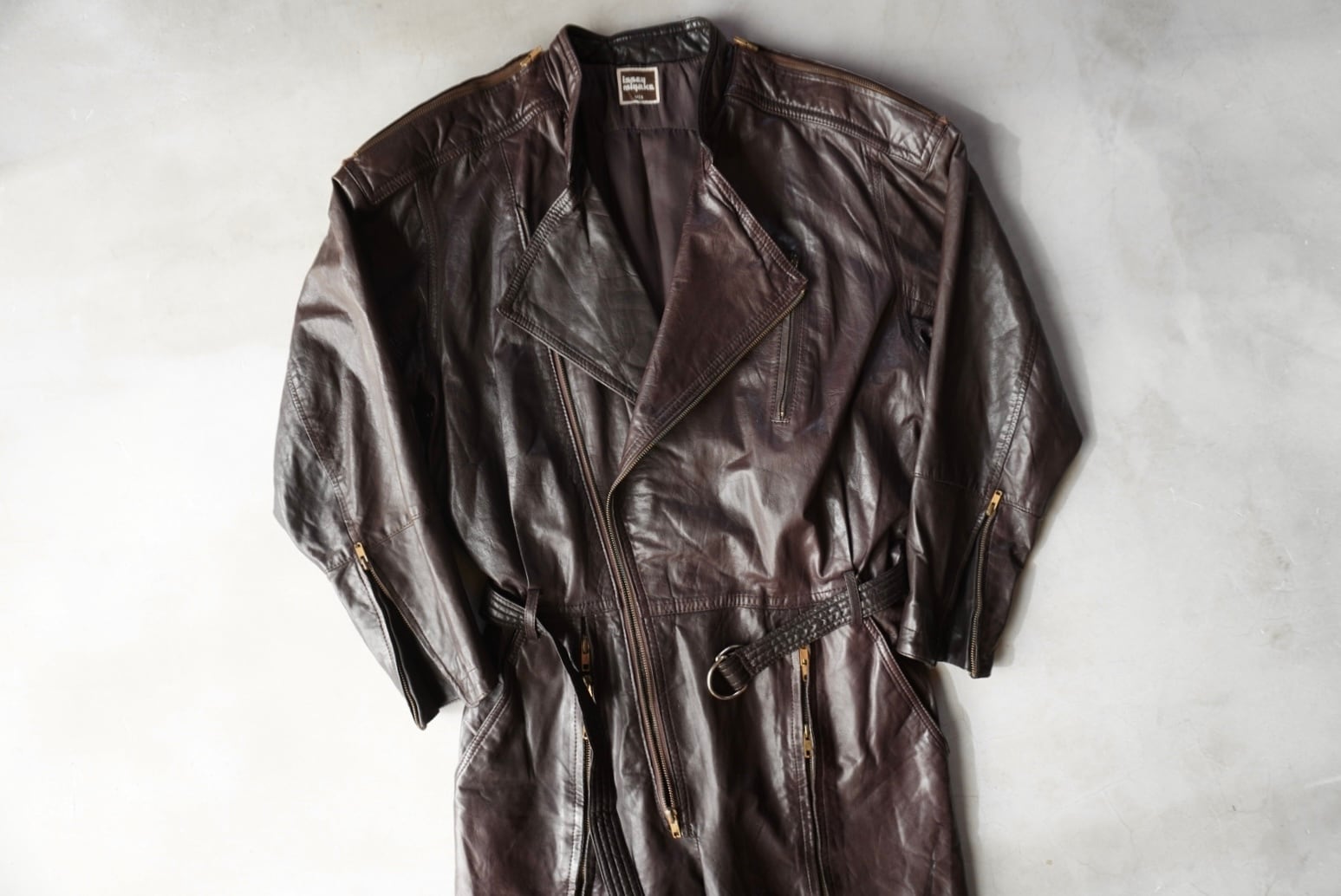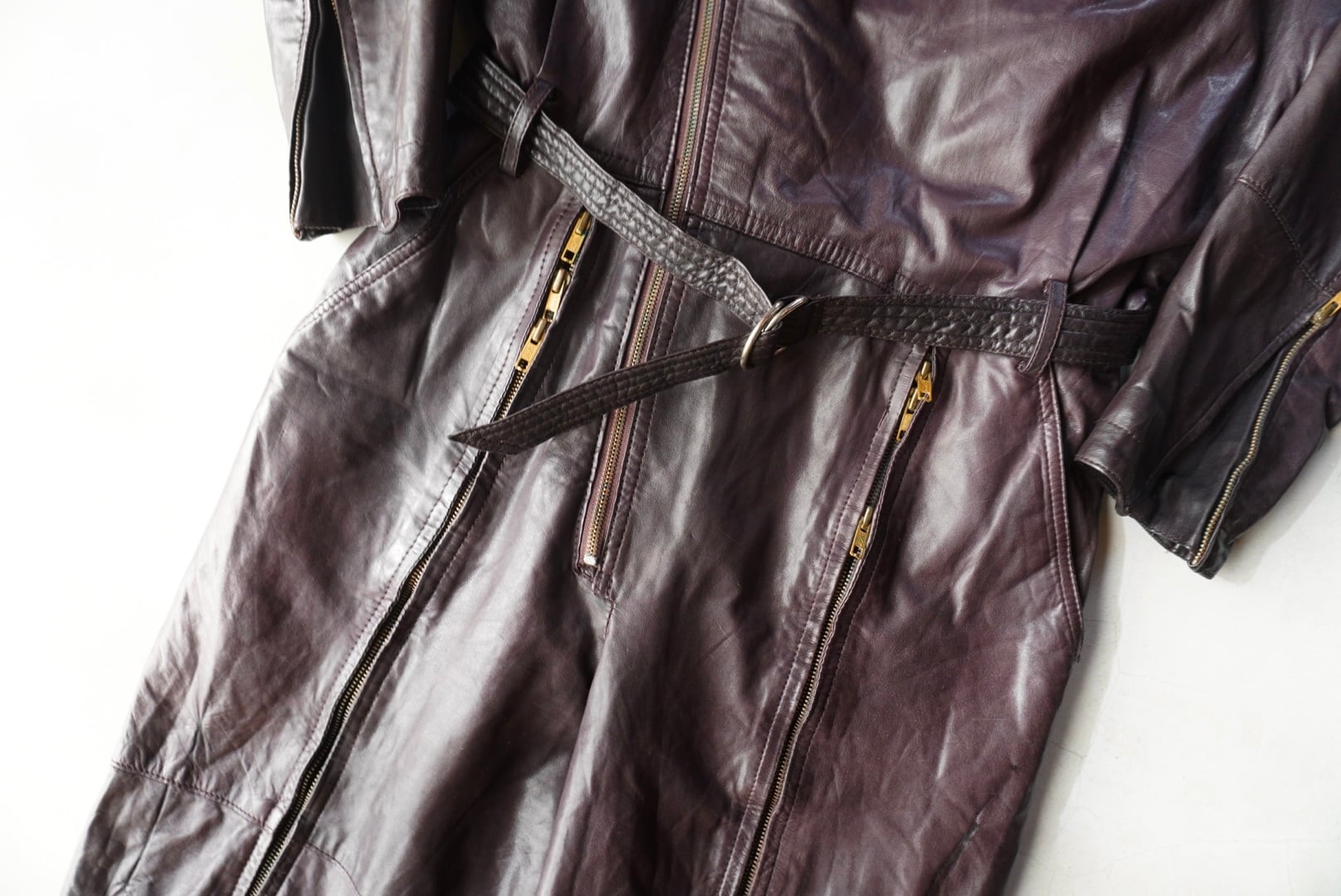 ほんのり赤みのあるブラウンレザーが使用された、ダブルのライダース仕様のスペシャルなジャンプスーツ。
