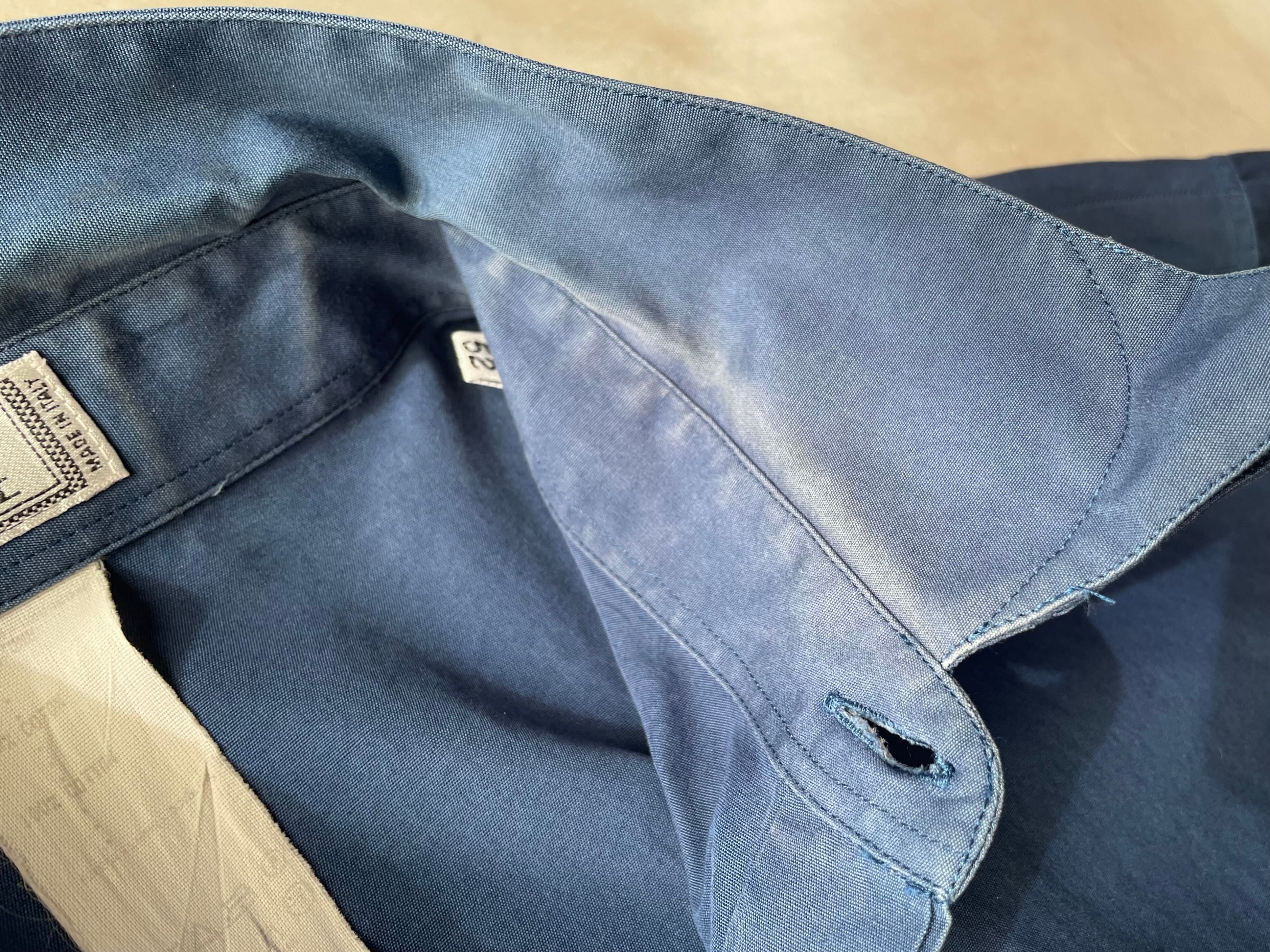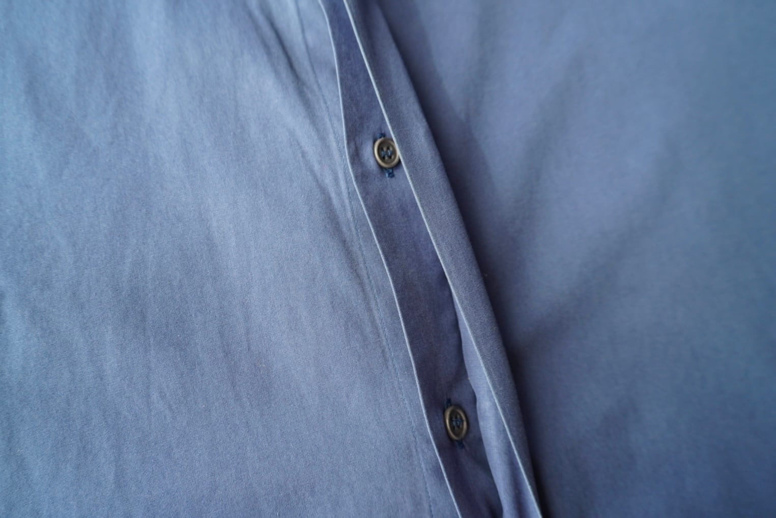 2枚の生地がステッチで隔てられた、特殊な隠しボタンダウン仕様。