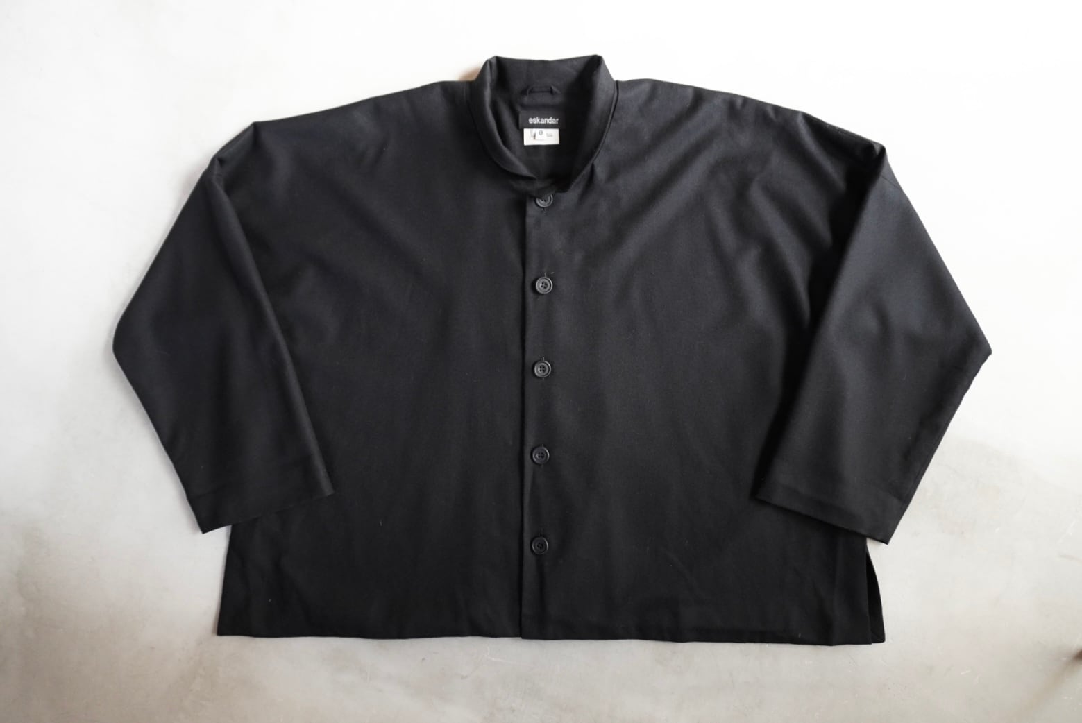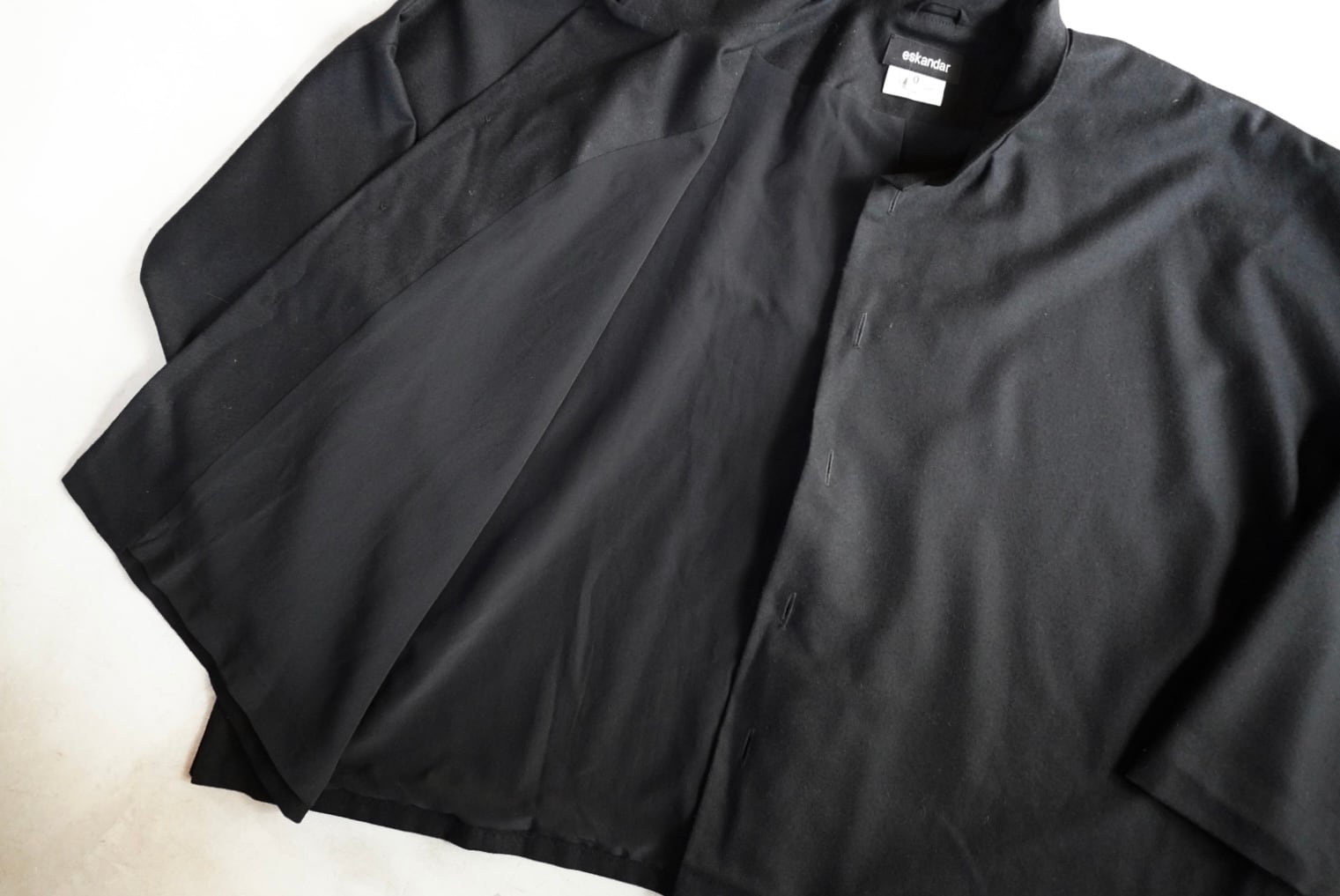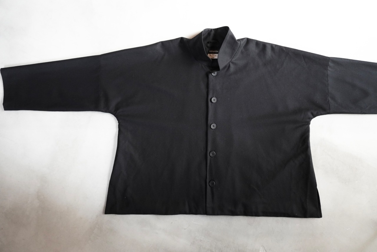 襟高のあるマオカラー、縦横が逆転した平面的なワイドシルエット。