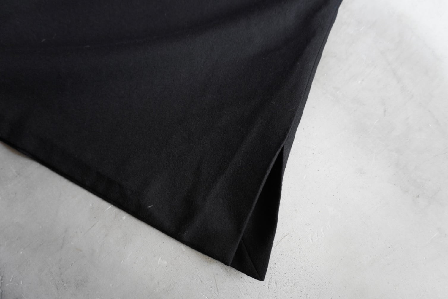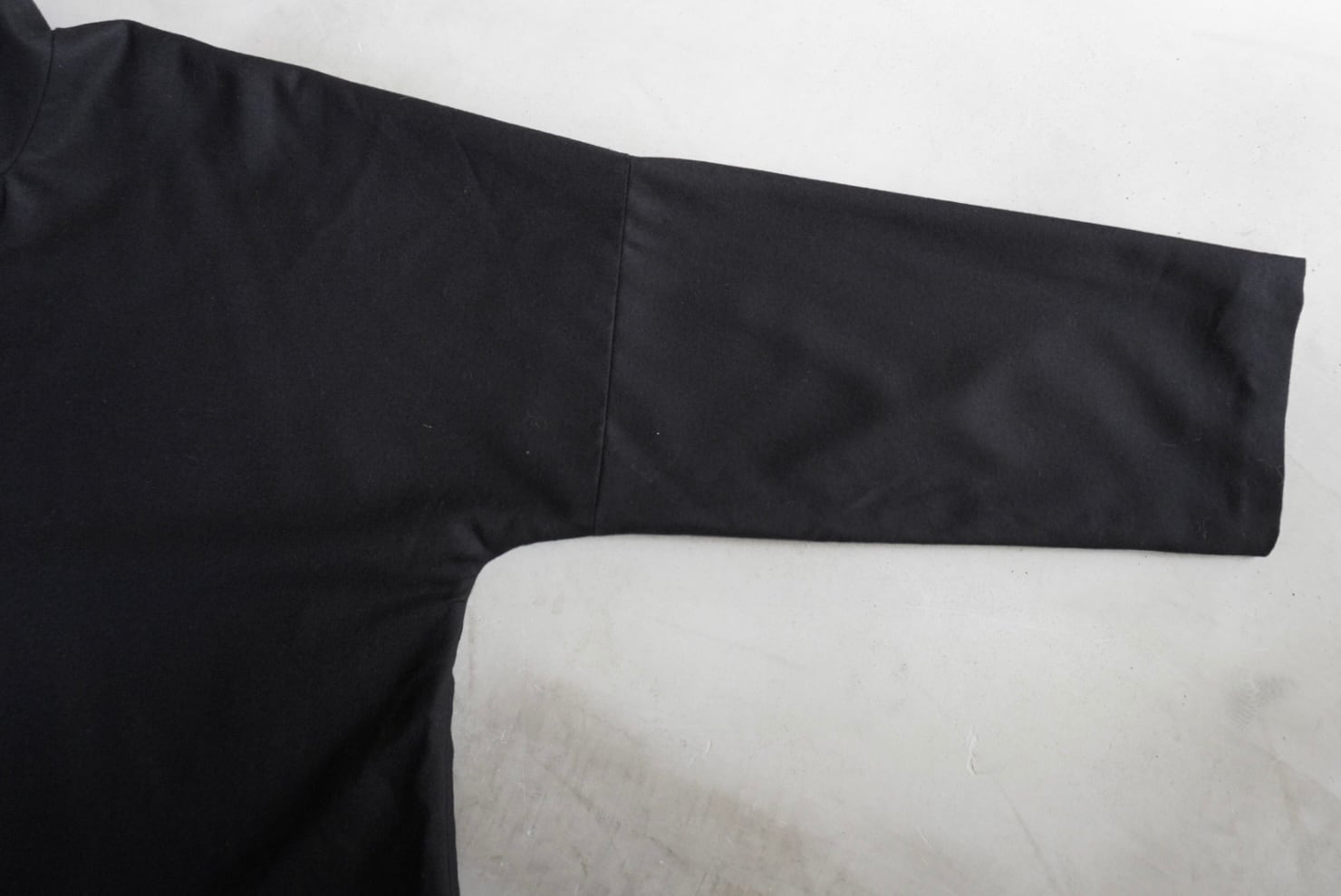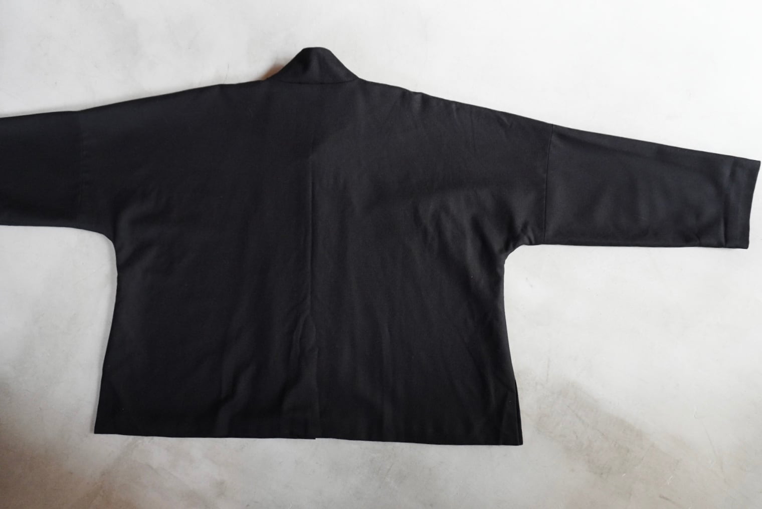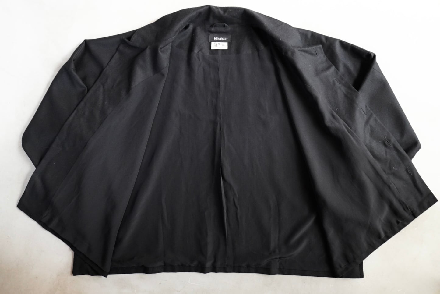 袖継ぎから少しえぐれて裾に向けて緩やかに広がる様な、変則的なチャイナジャケットの様なメリハリの強いワイドシルエット。