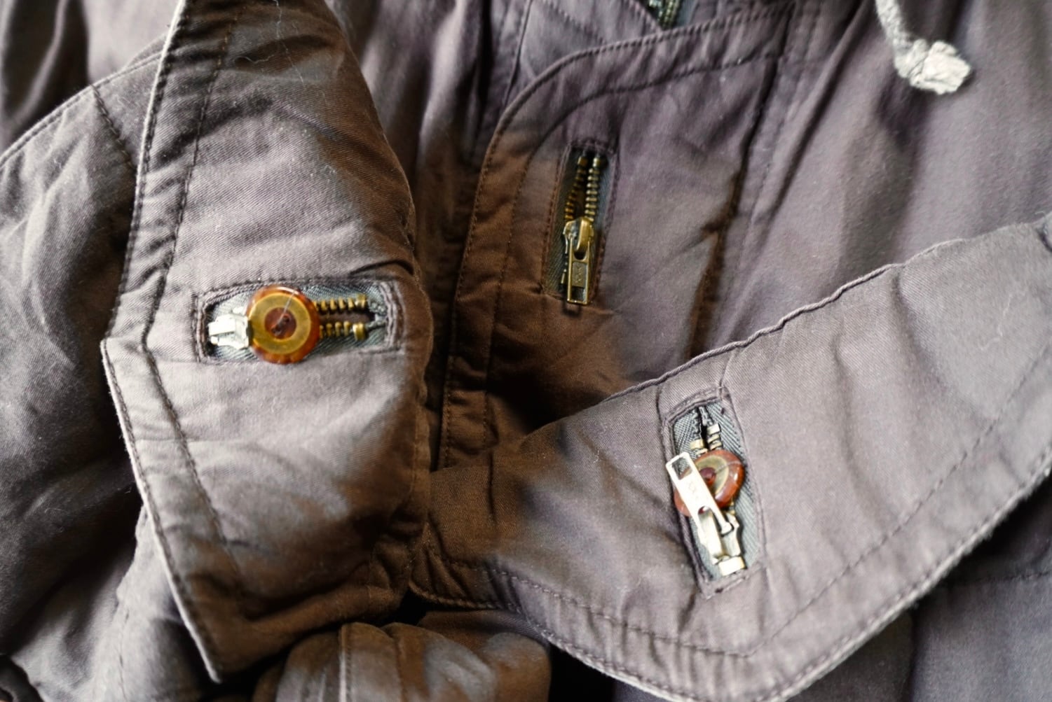 トップボタン/ポケットフラップ上の短すぎるジップで開閉可能な、この一着独自のボタンホール。