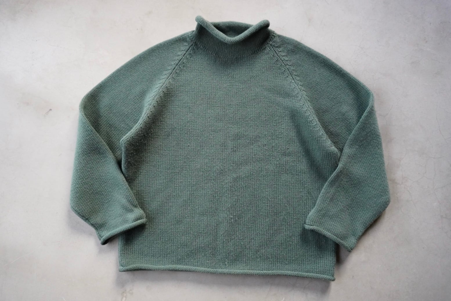 定番のロールネックニットの中でも特に珍しい、曇ったセージグリーンのボディカラー。