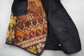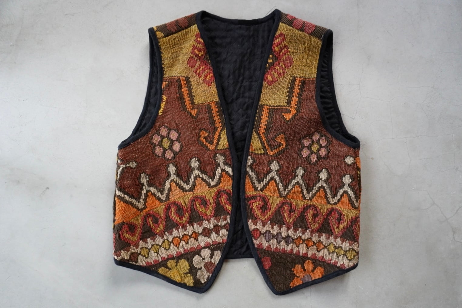 手織りのラグを洋服にした様な、原始的な雰囲気の羽織りベスト。