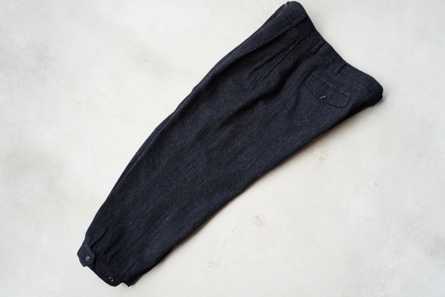 ボトムスにも同様の装飾が乗せられた、裾ボタン仕様のウールニッカポッカ。