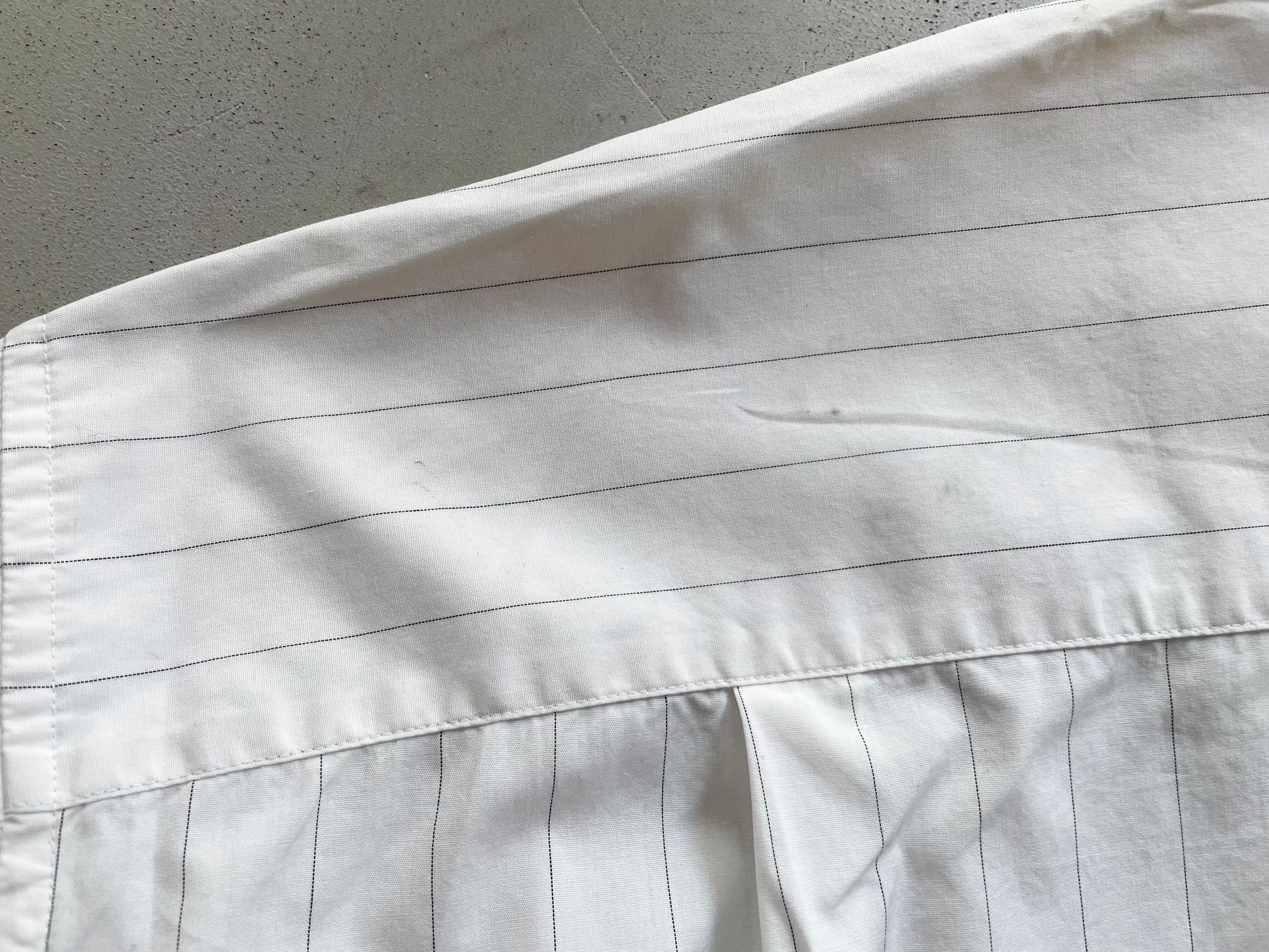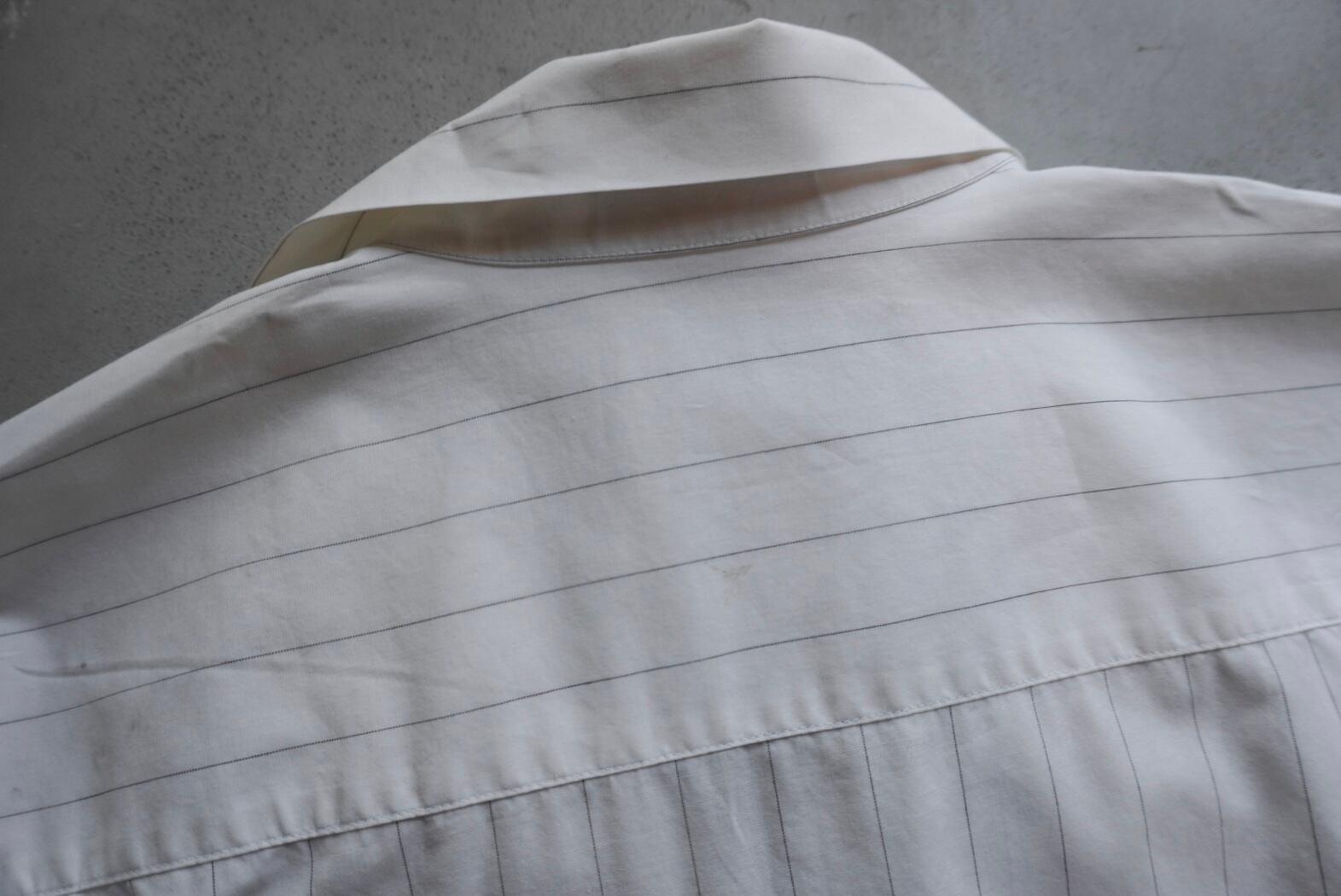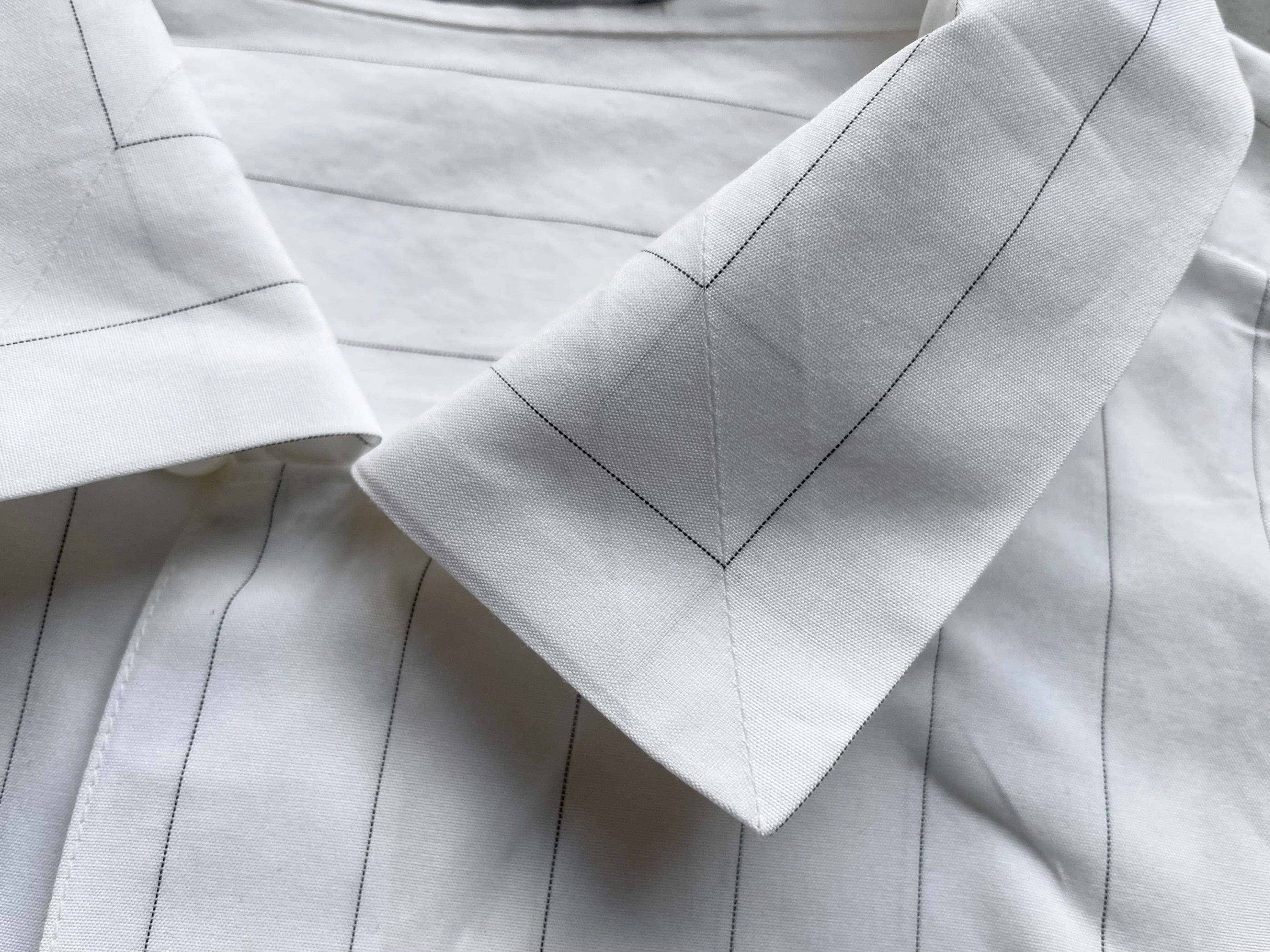 縞模様を襟上で直角に混じり合わせる様な、小ぶりなオープンカラーデザイン。