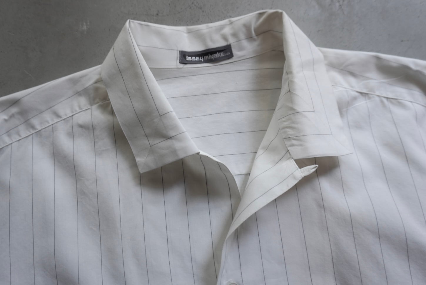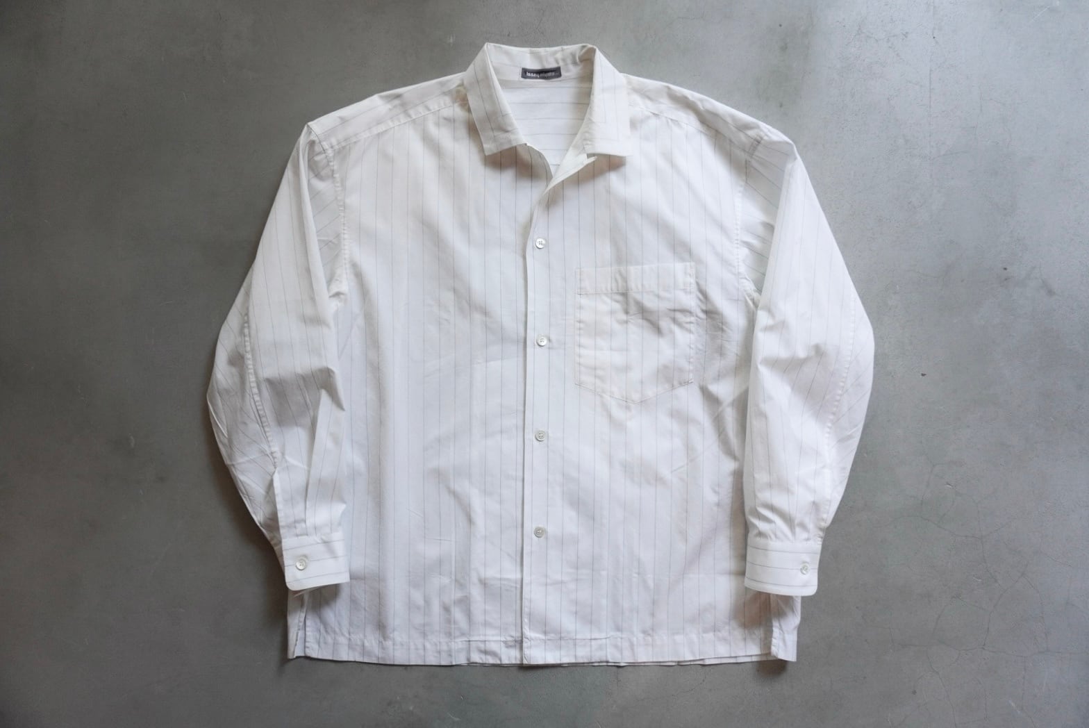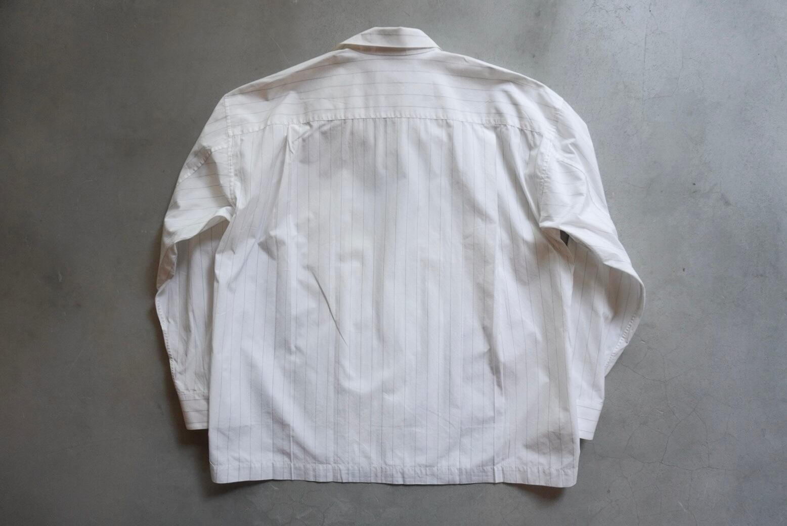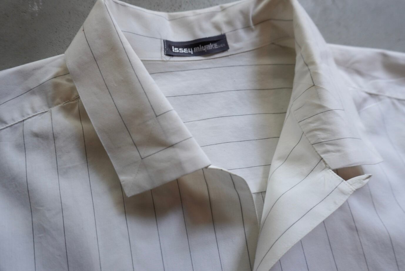 縞模様を襟上で直角に混じり合わせる様な、小ぶりなオープンカラーデザイン。