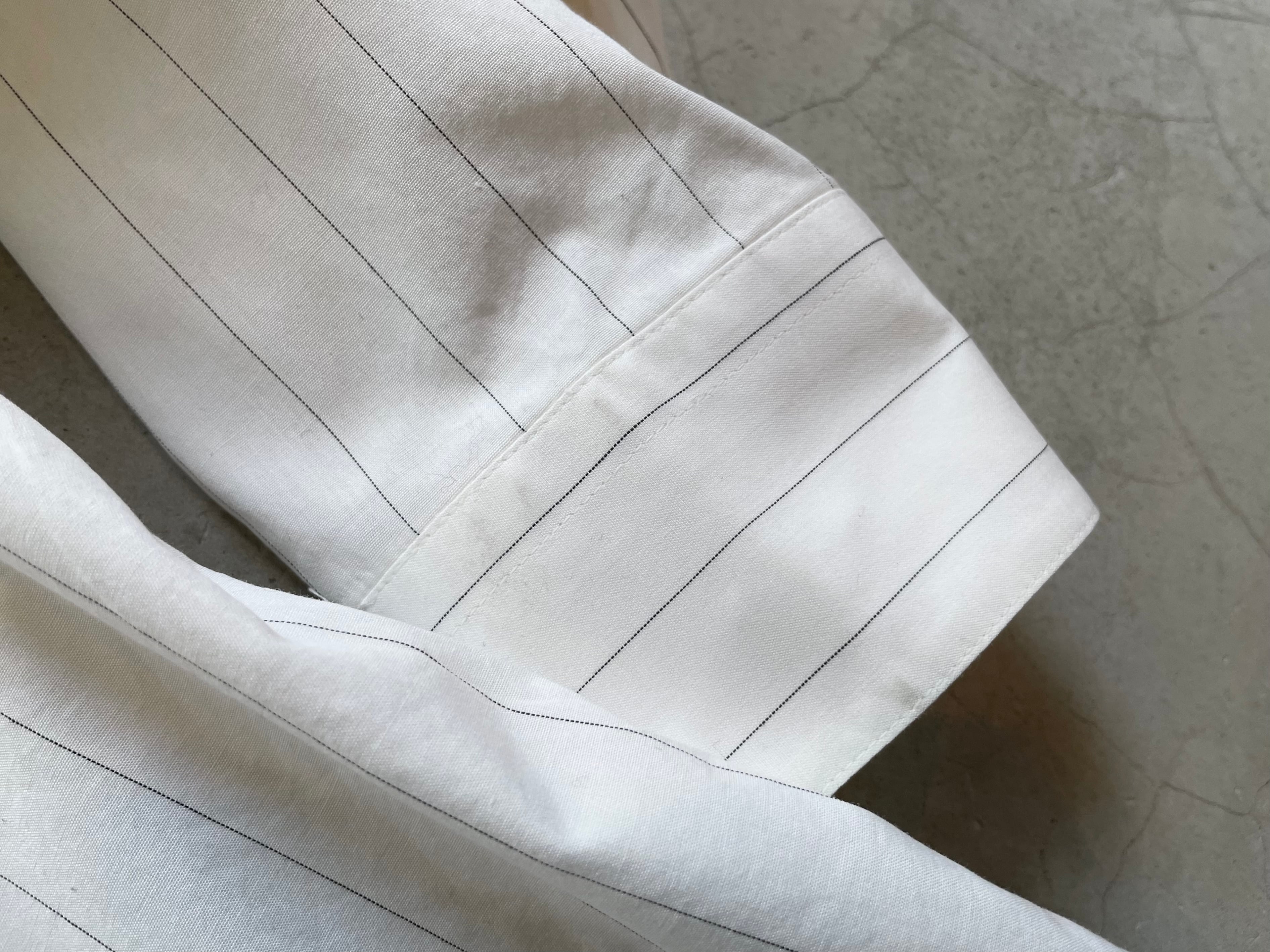白地に黒の細糸が乗った、線の細いストライプパターン。