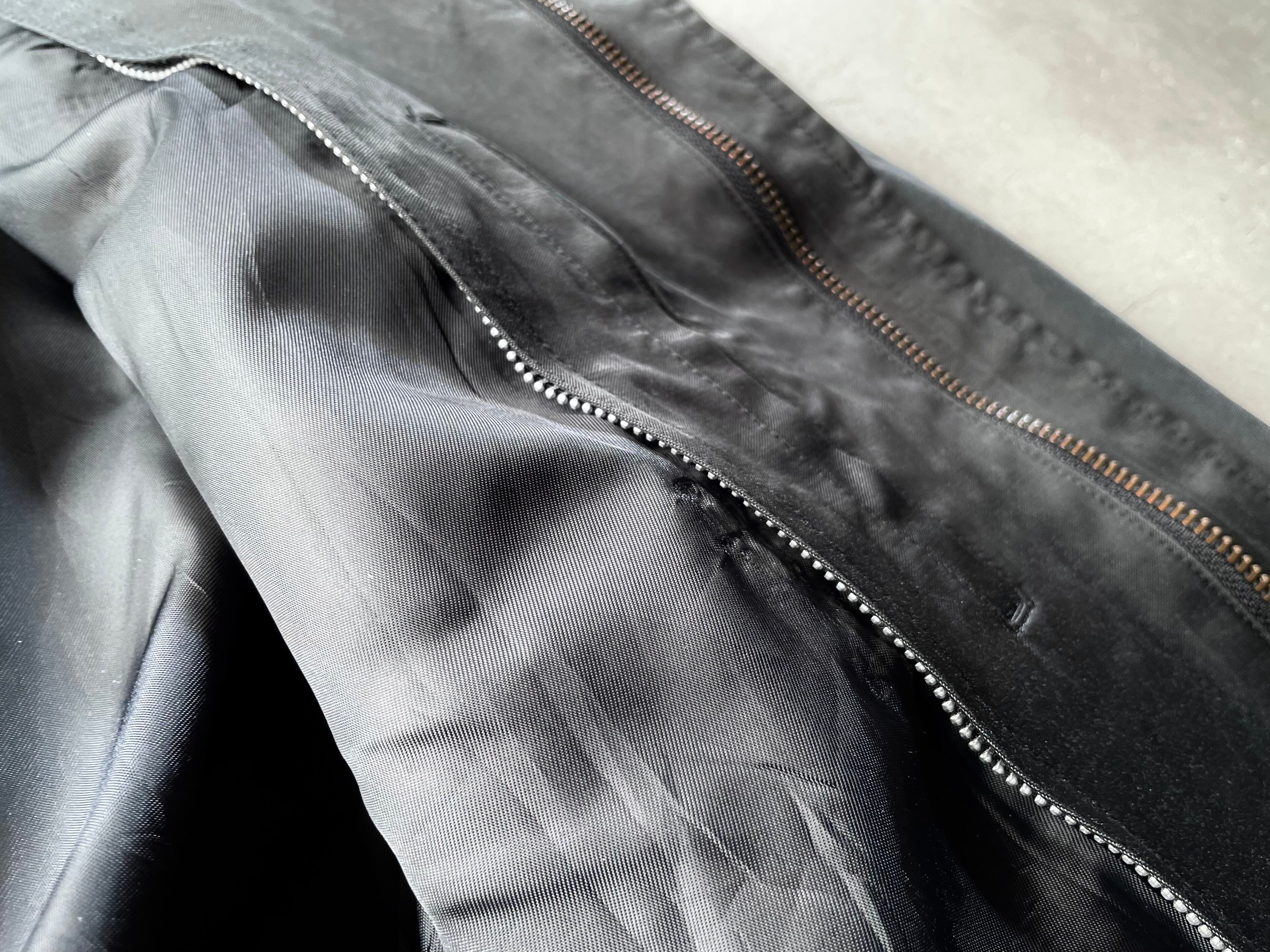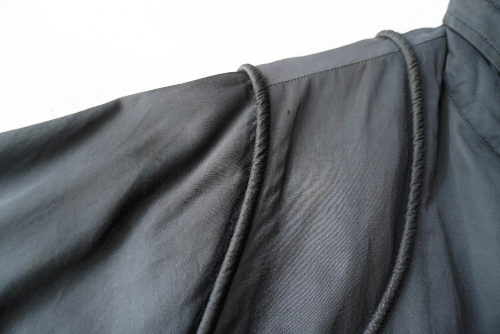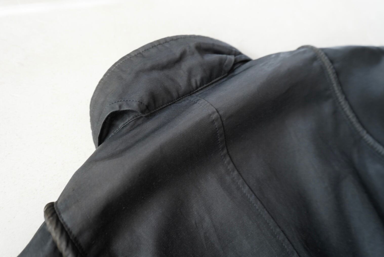 両裾のボタンアジャスター、2枚の生地が重なり合う特殊なパターンのスタンドカラーも見所です。