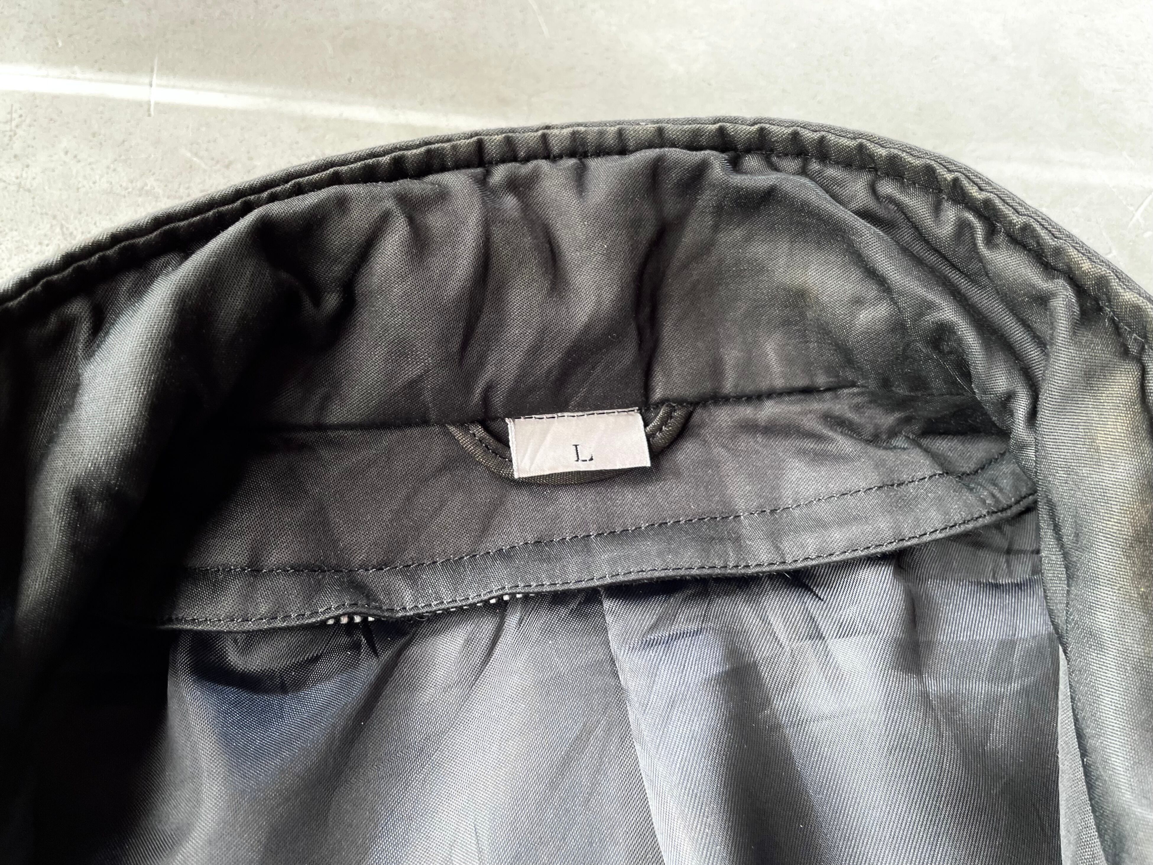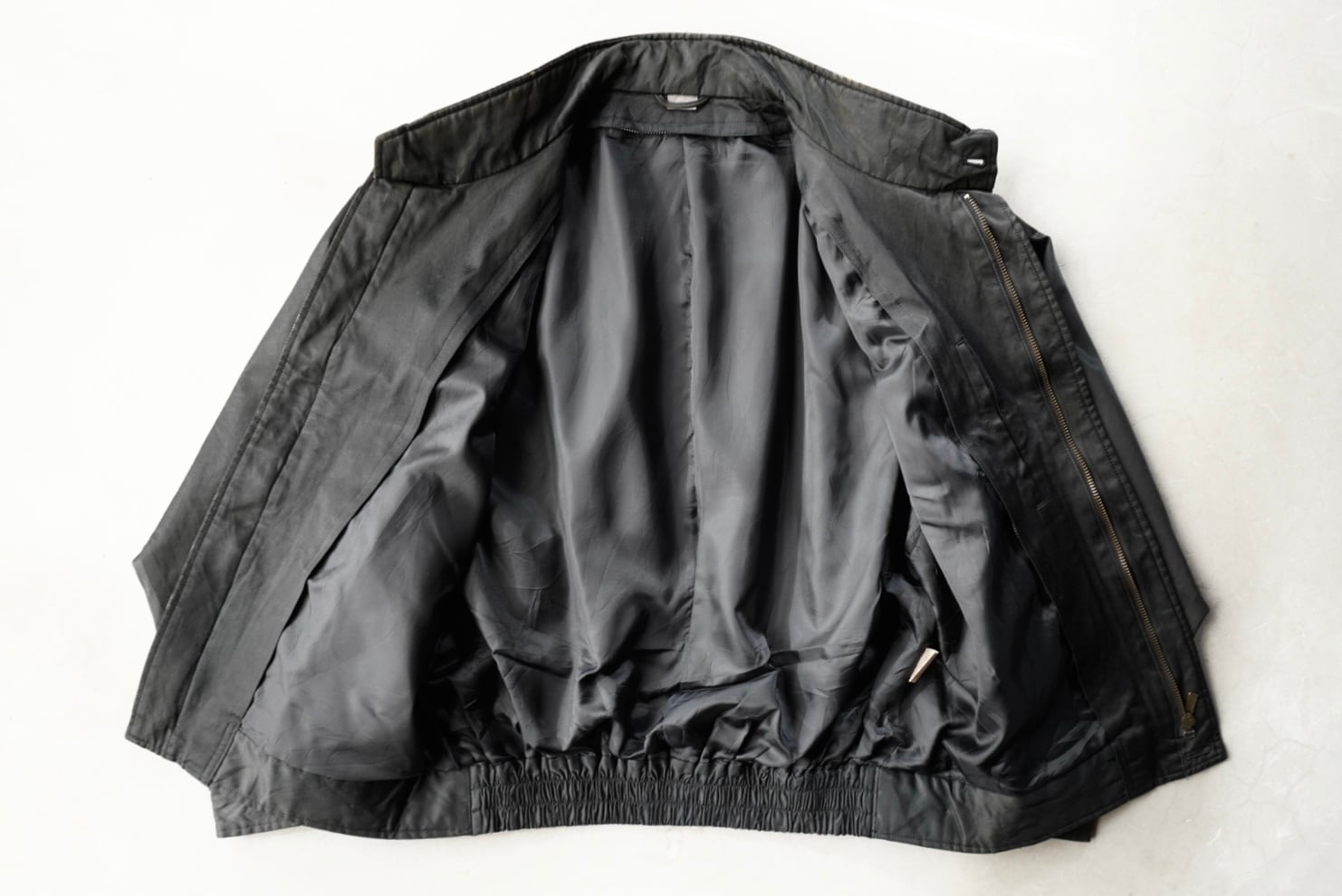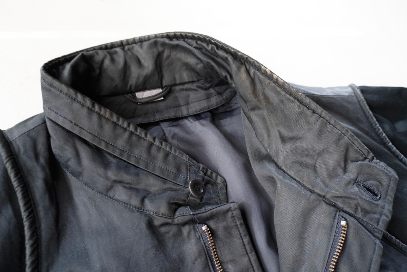 両裾のボタンアジャスター、2枚の生地が重なり合う特殊なパターンのスタンドカラーも見所です。