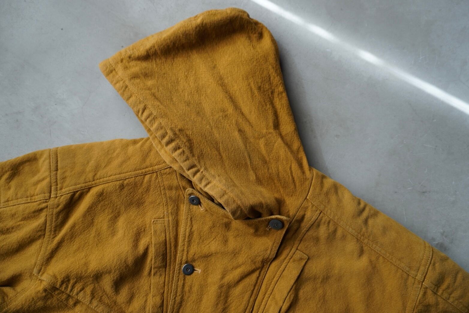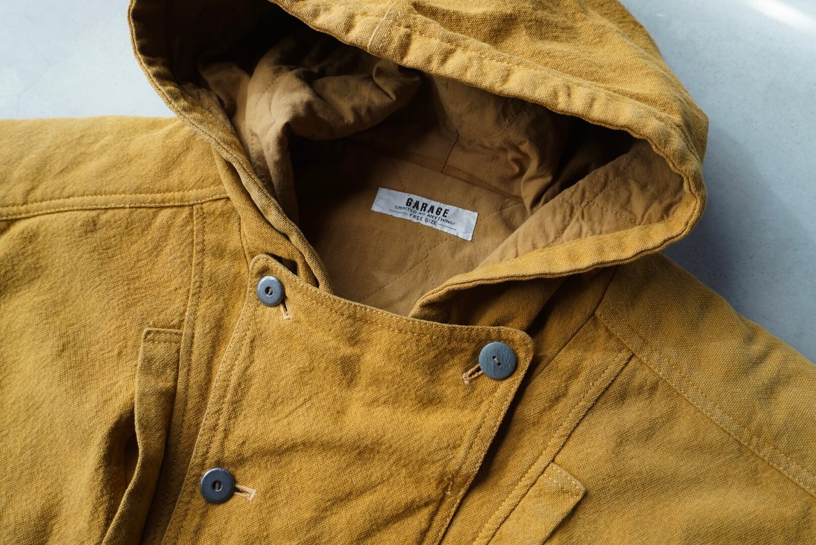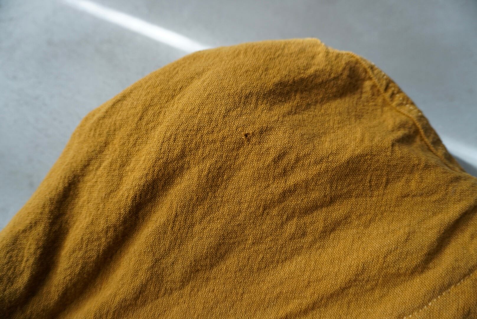 艶消しのメタルボタンが映える、柔らかなマスタードイエローのボディカラー。