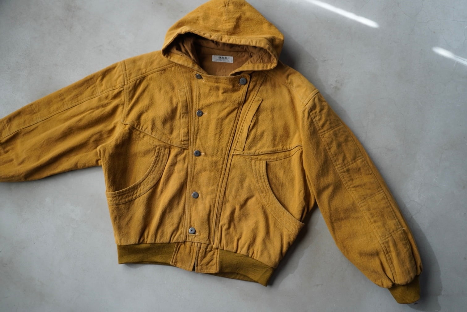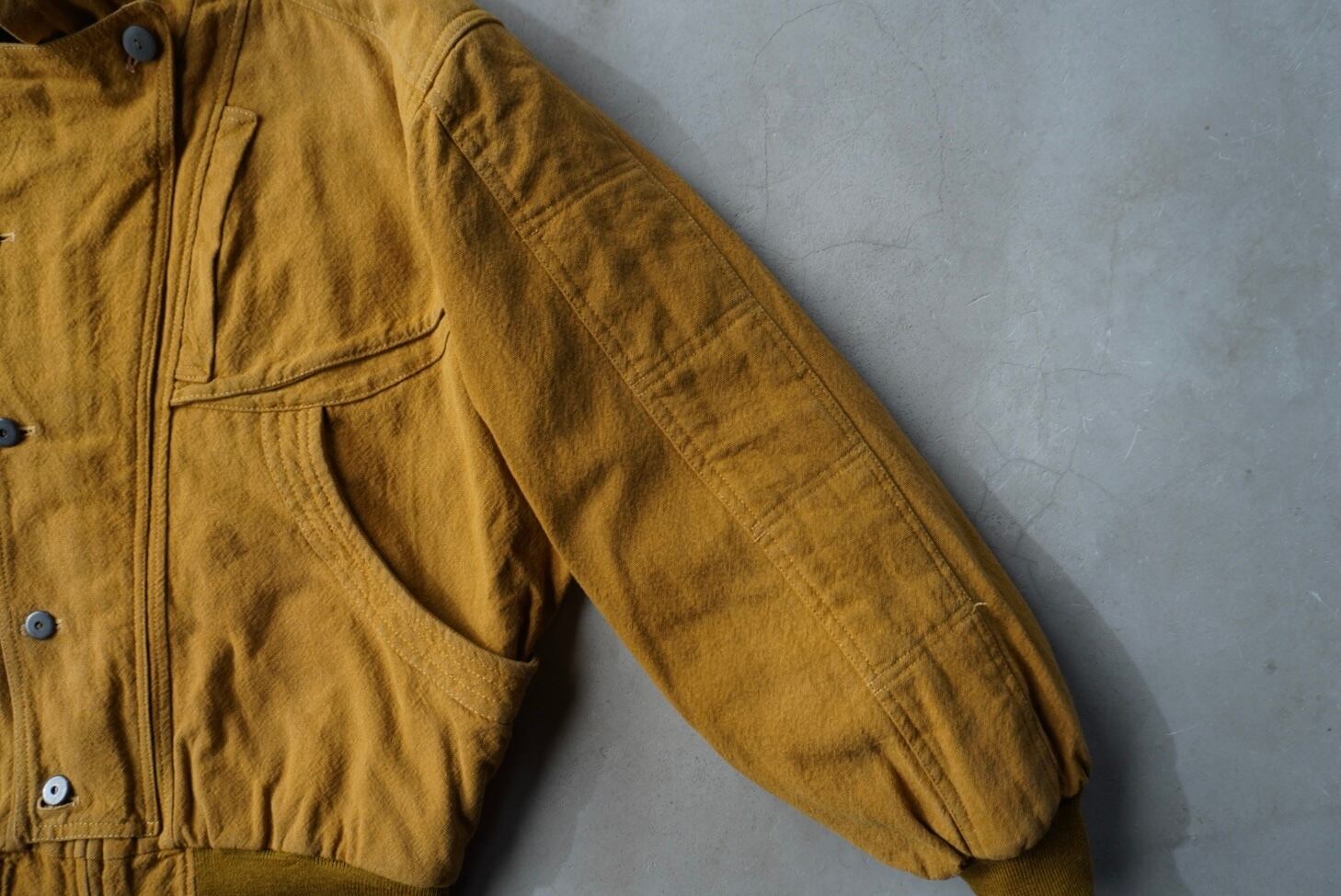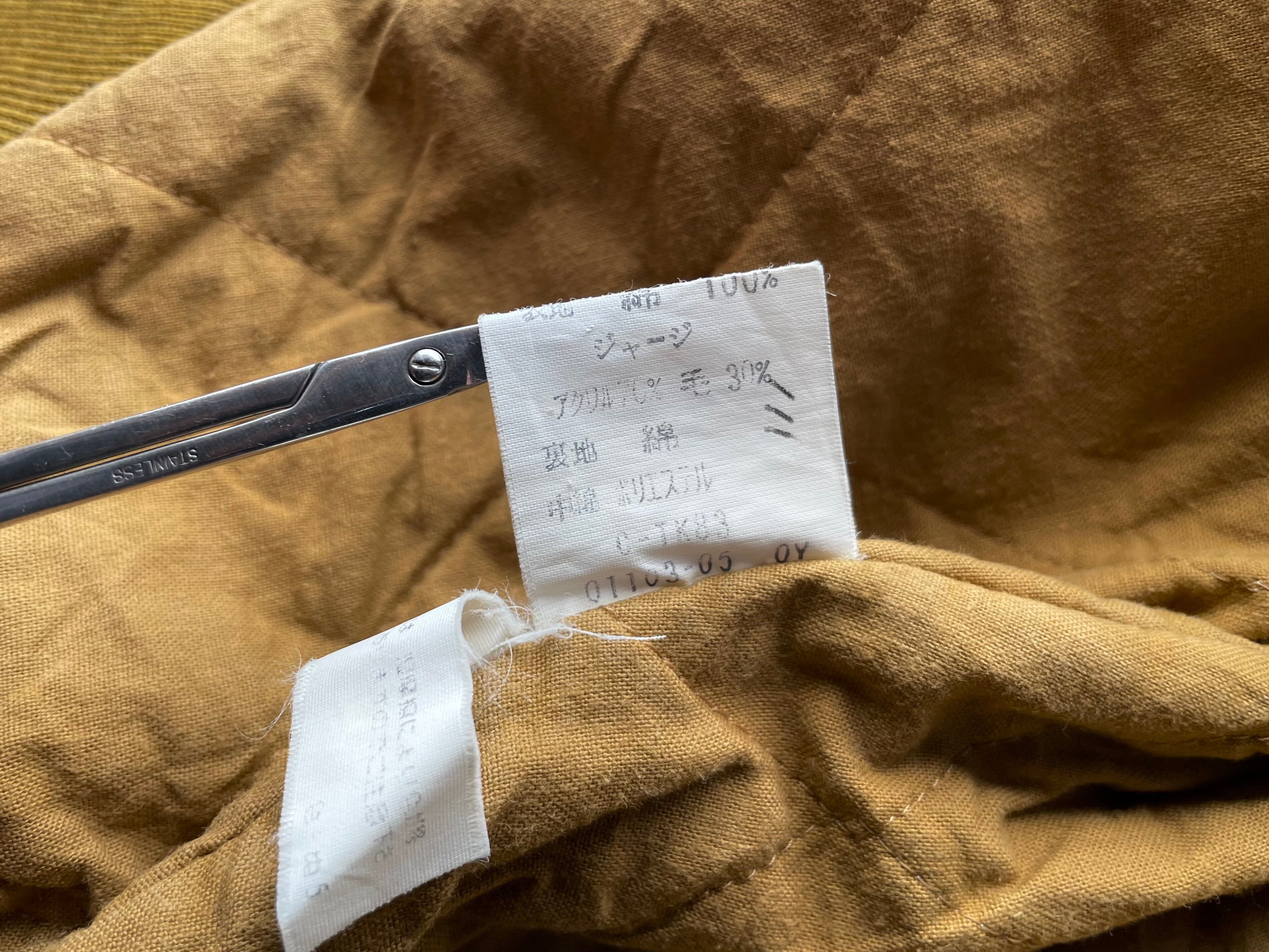 艶消しのメタルボタンが映える、柔らかなマスタードイエローのボディカラー。