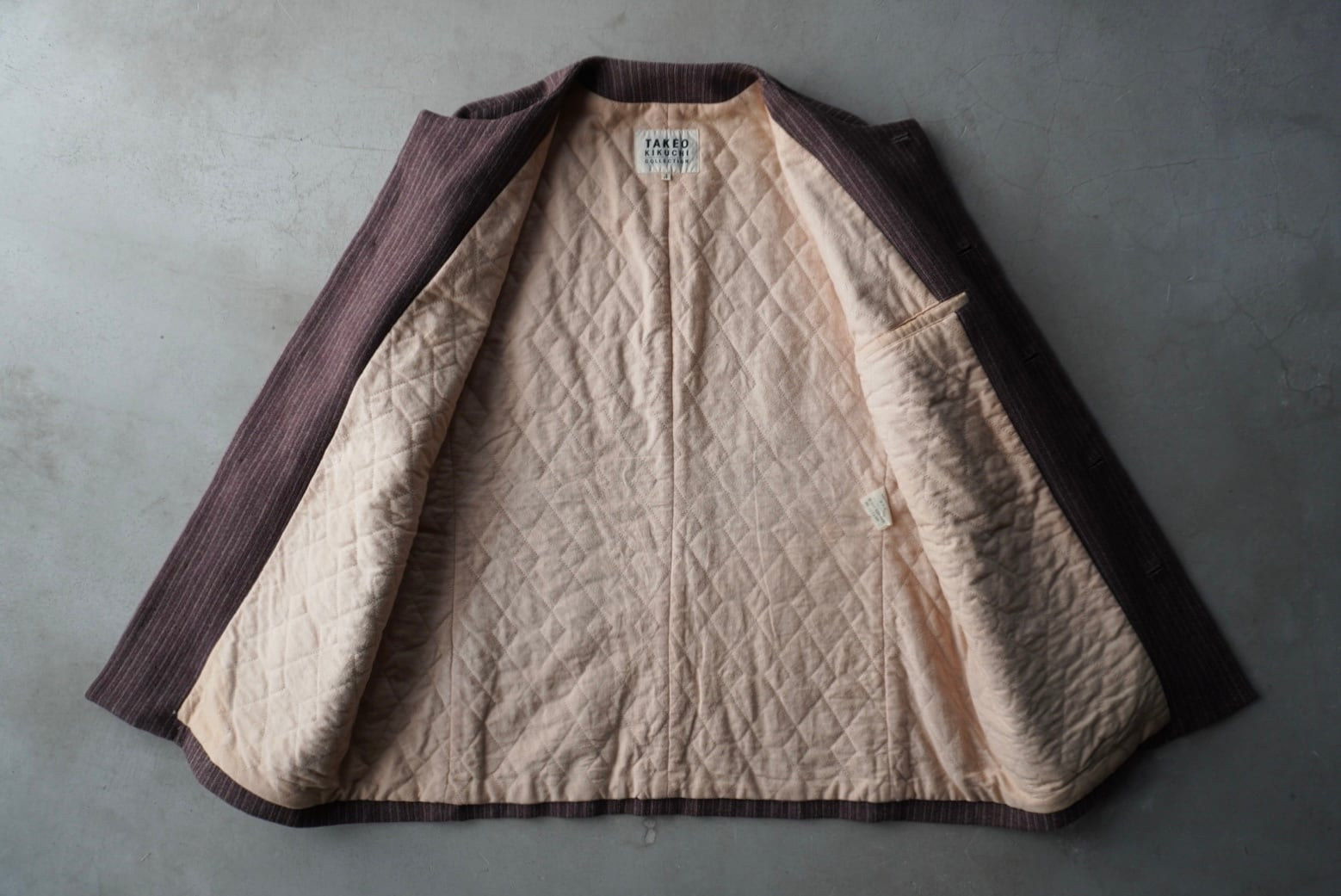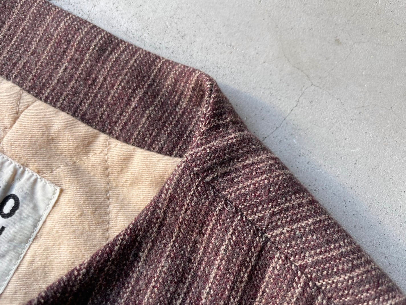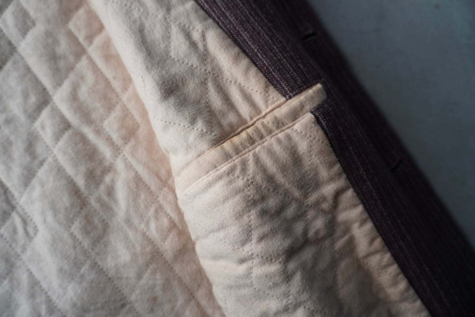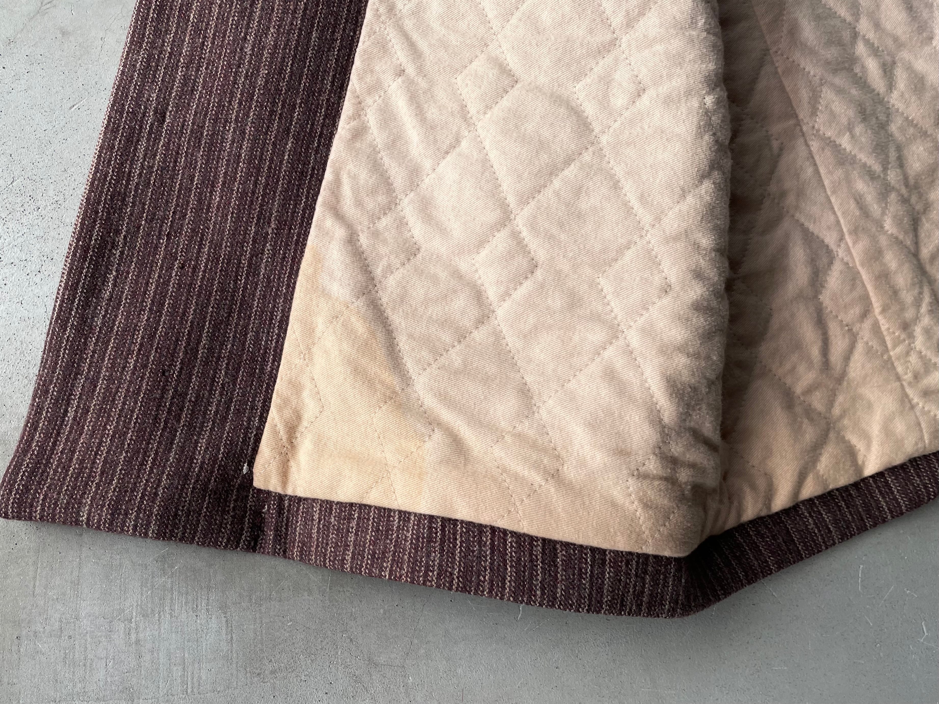赤みのあるブラウンのウールシェルに、薄い中綿入りの柔らかなコットンのキルトライニング。
