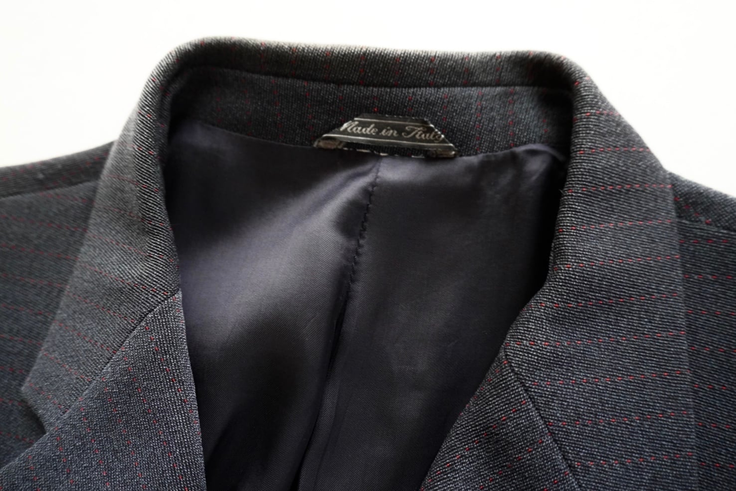 黒にも近いチャコールベースに赤のステッチが乗せられた、静かな主張のあるファブリックデザイン。