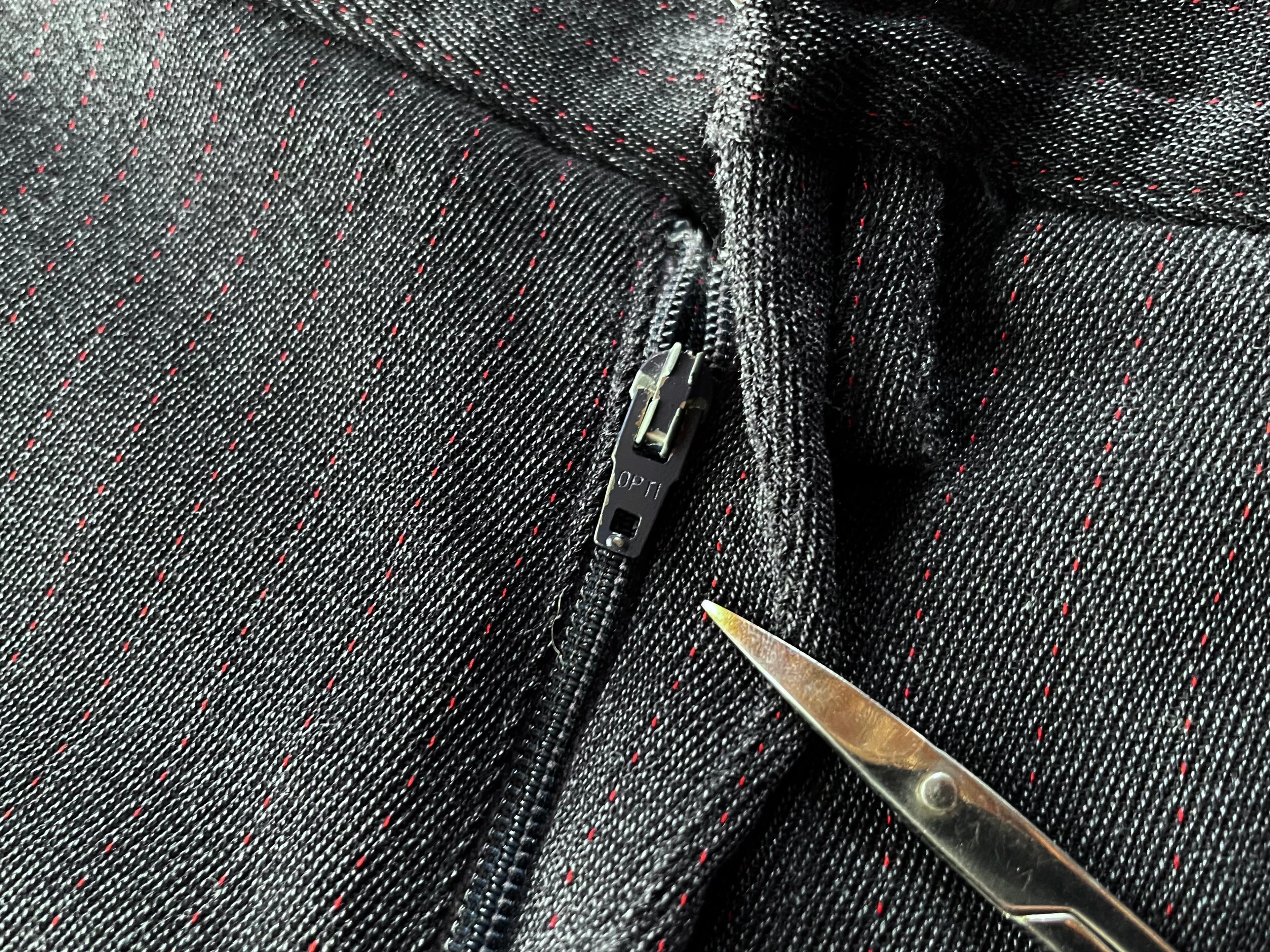 There is a small scratch on the lining as shown in the image, and the front zip of the bottoms is slightly distorted, but it functions without any problems.
