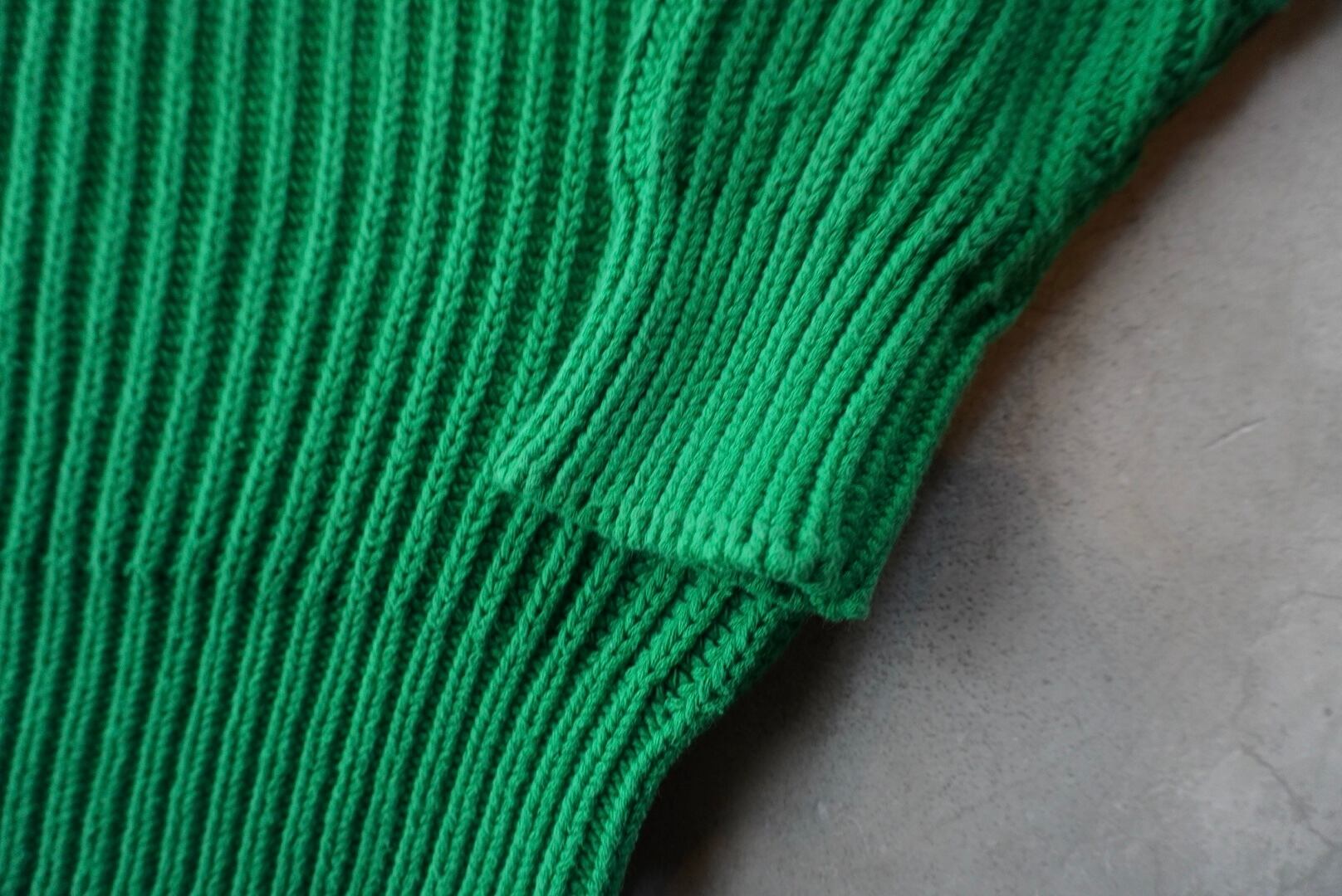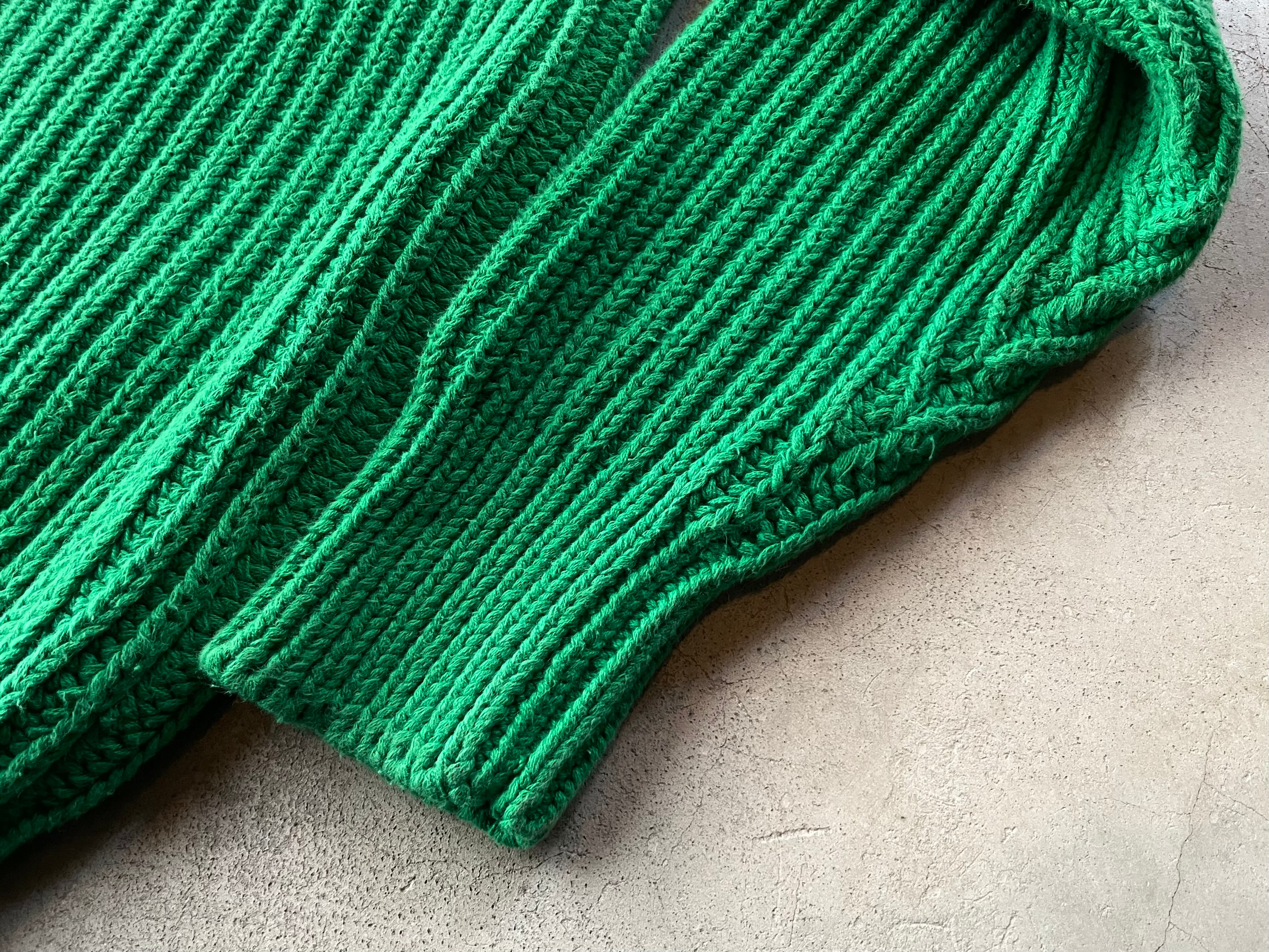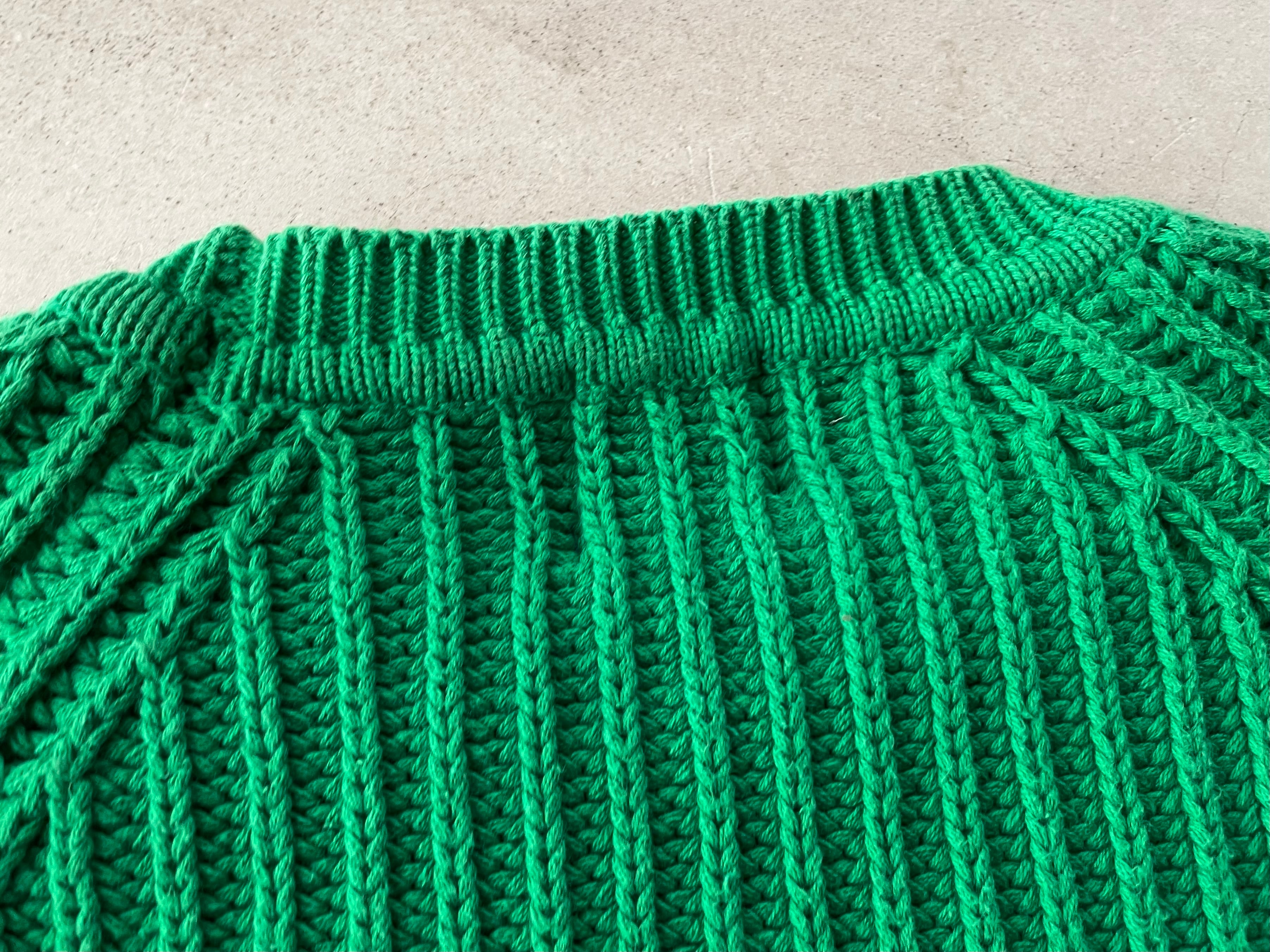 柔らかな手触りのたっぷり肉厚なコットンニットによる、発色の良いグリーンのボディカラー。