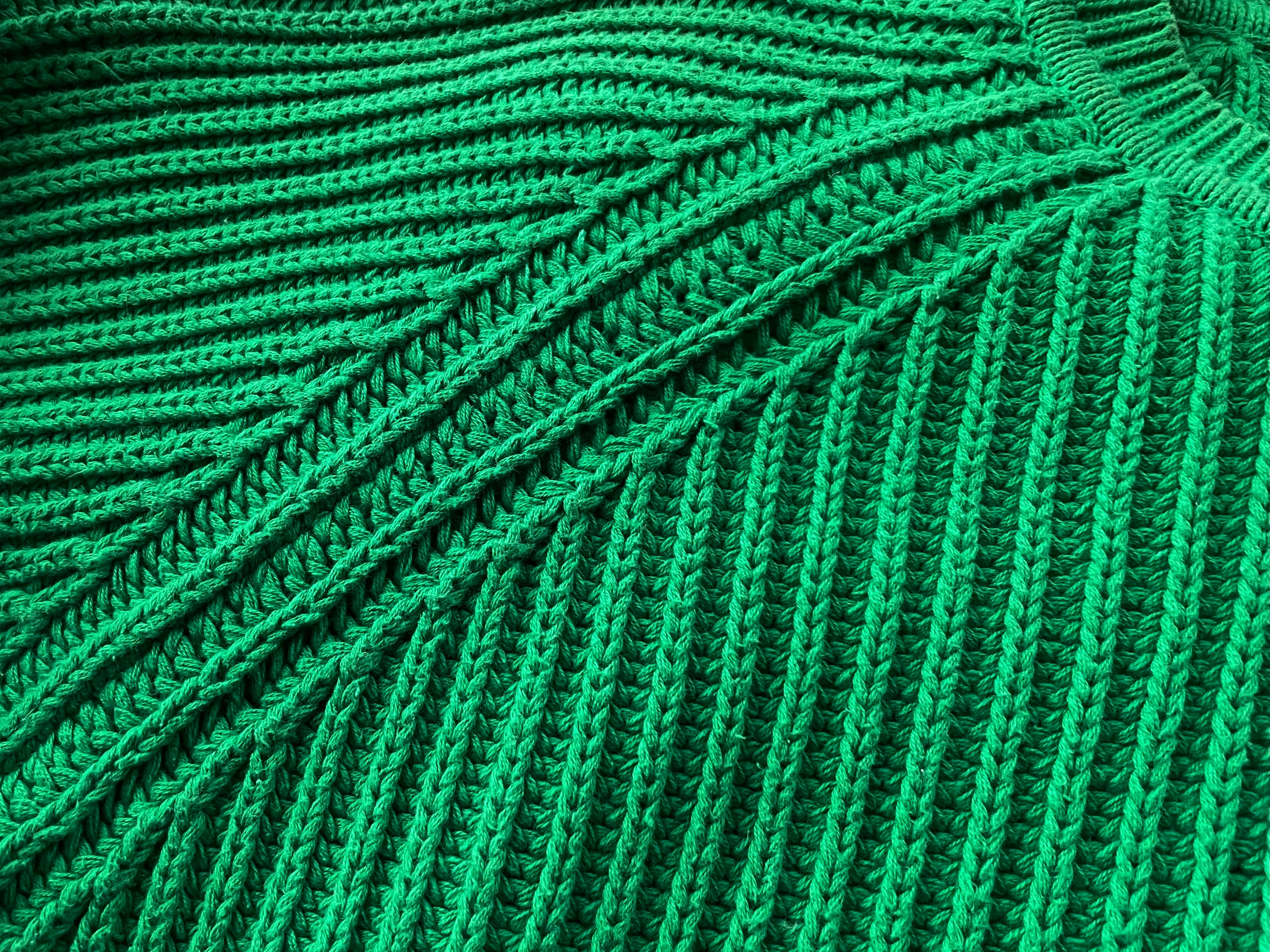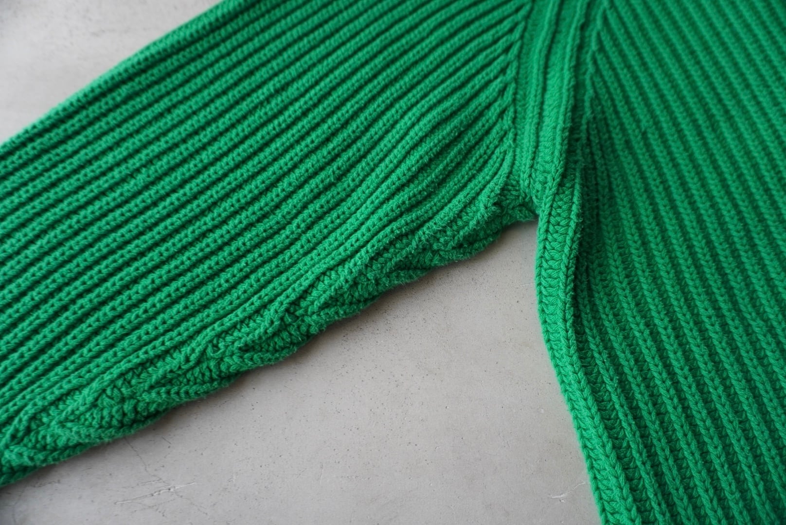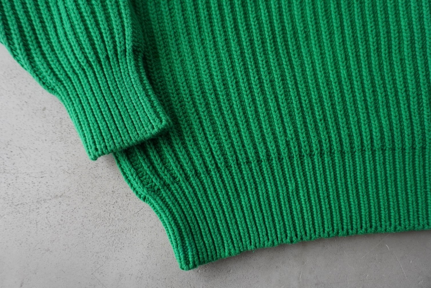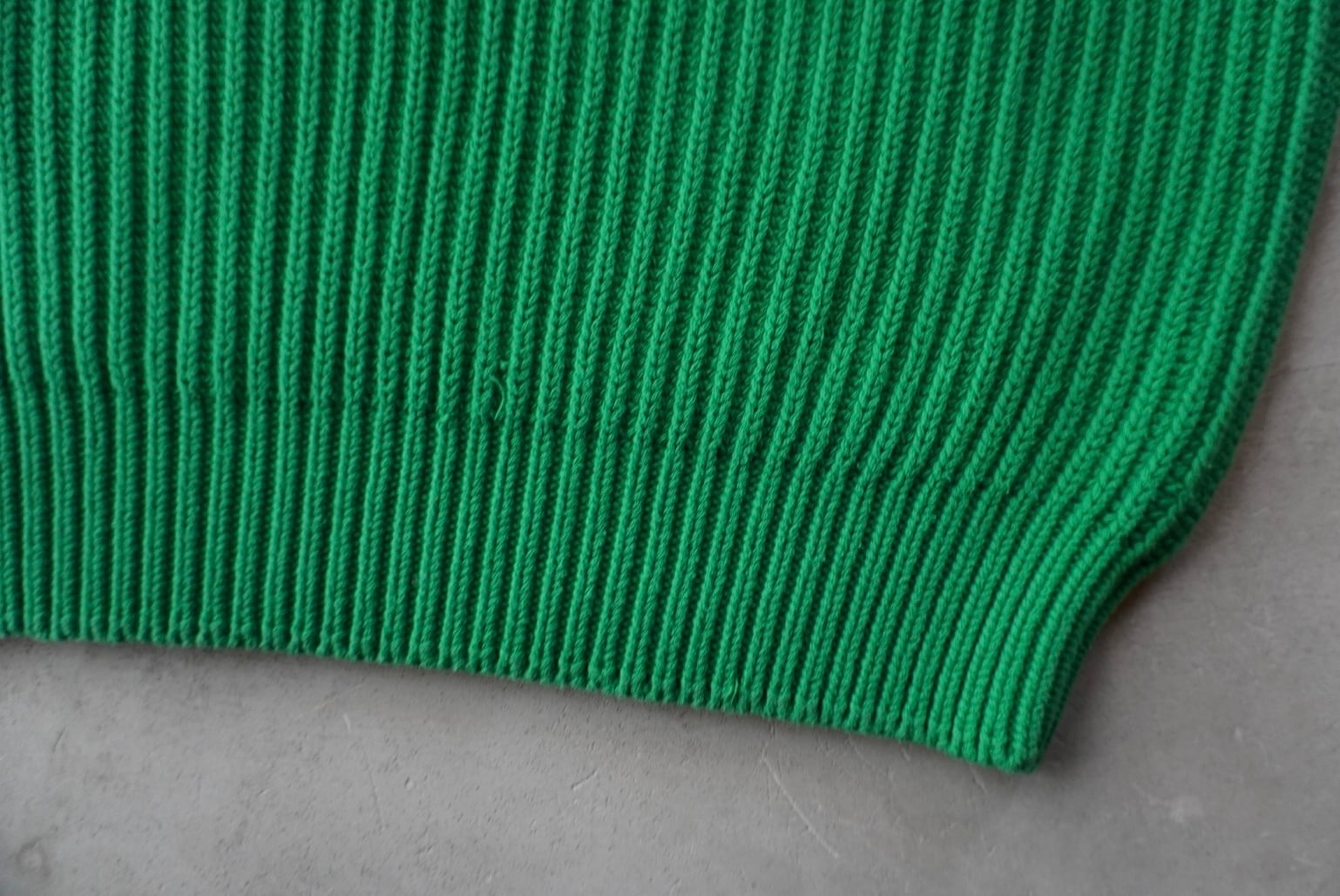 柔らかな手触りのたっぷり肉厚なコットンニットによる、発色の良いグリーンのボディカラー。