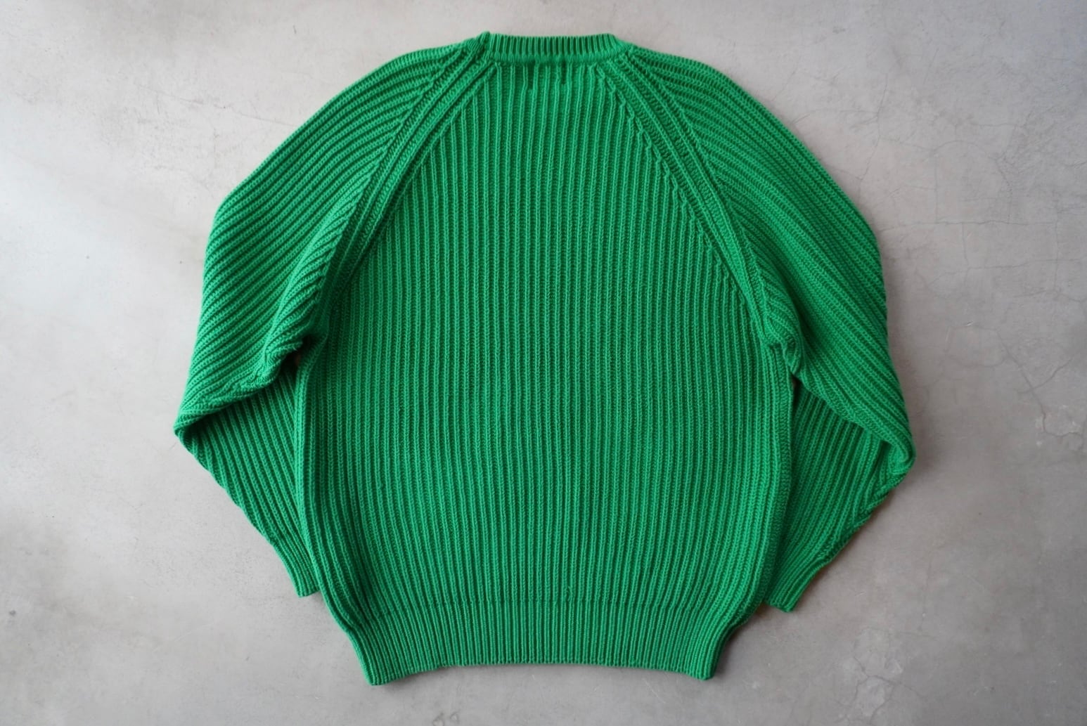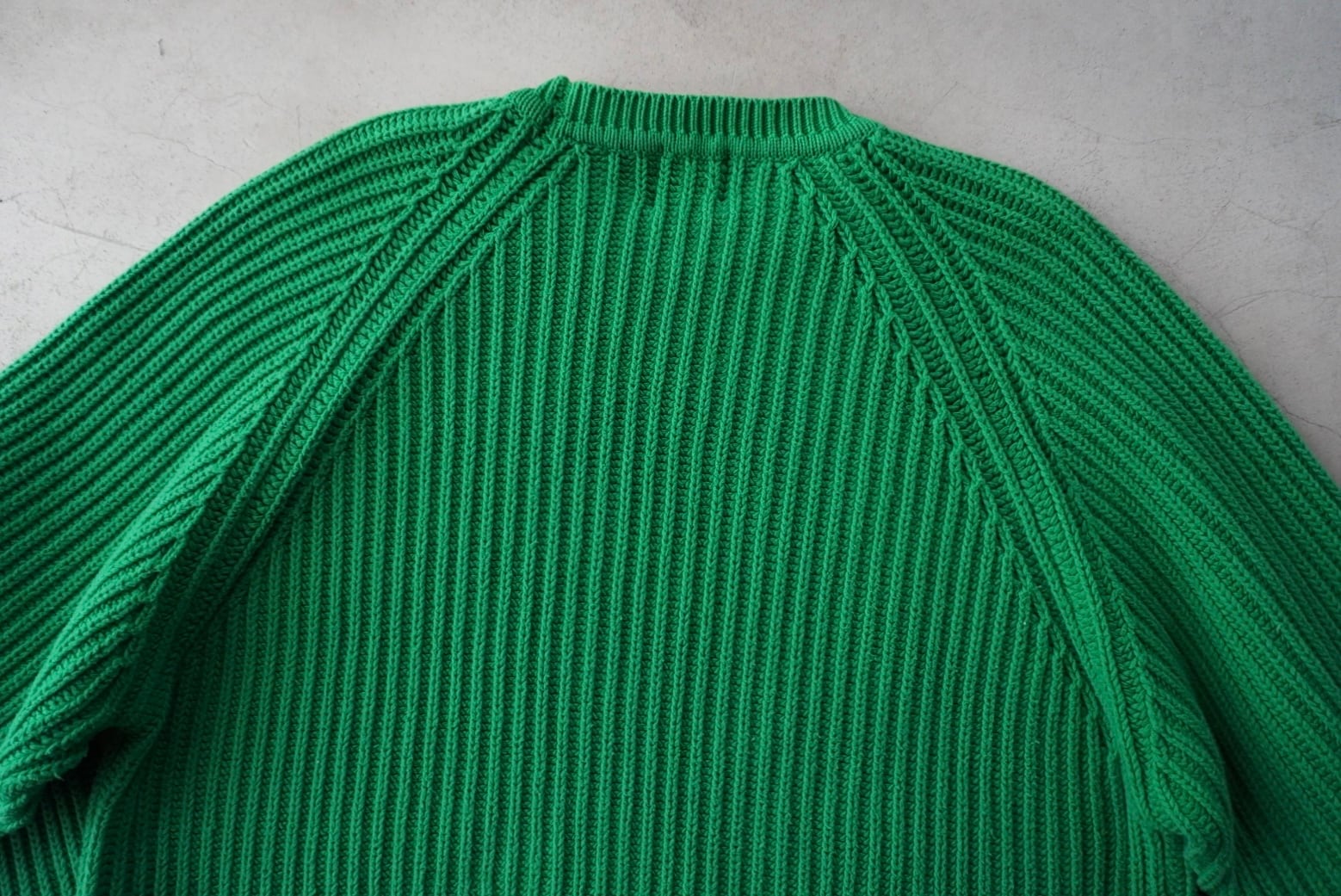凹凸のあるリブ編み、形の良いラグランスリーブ仕様。