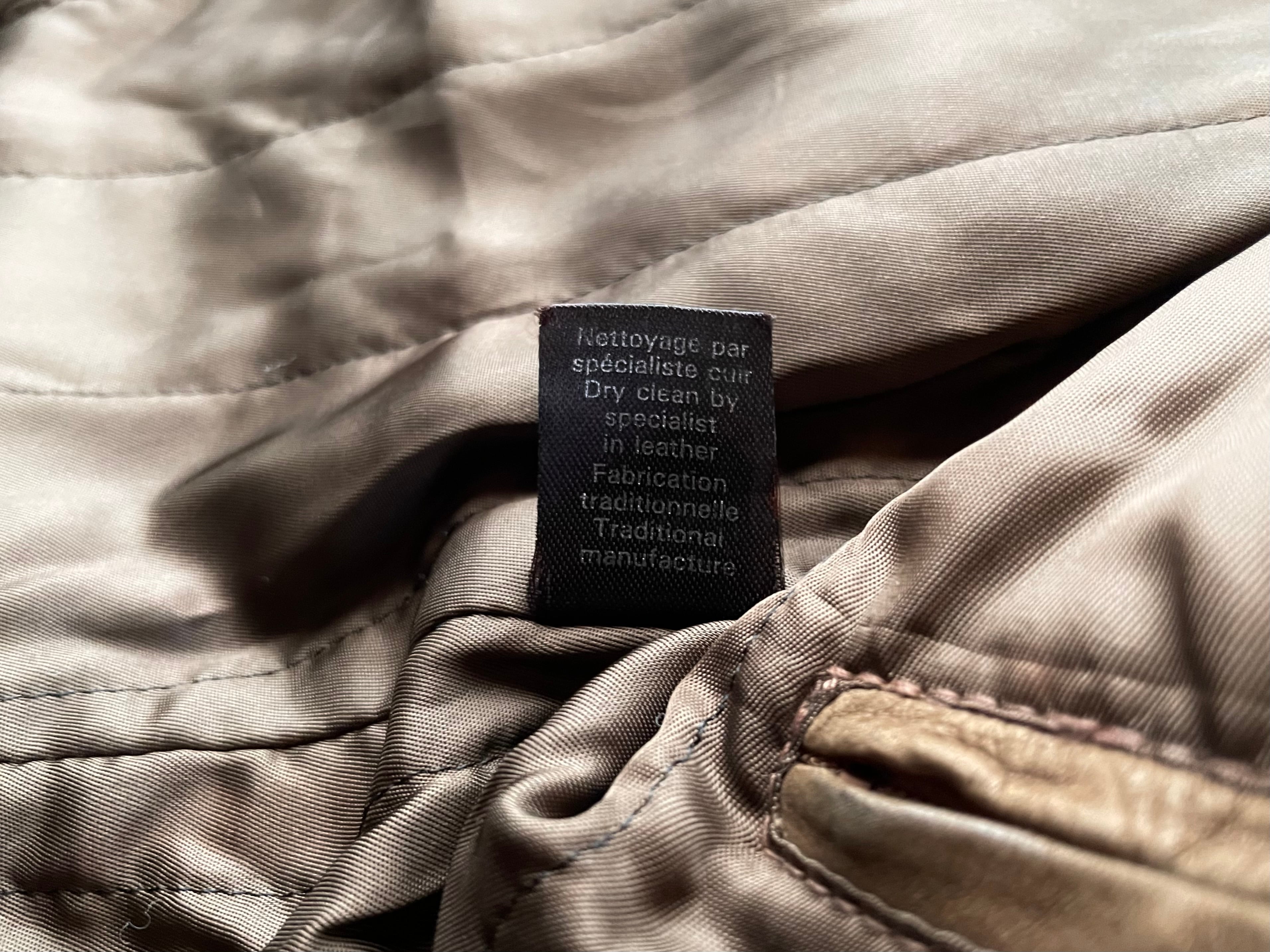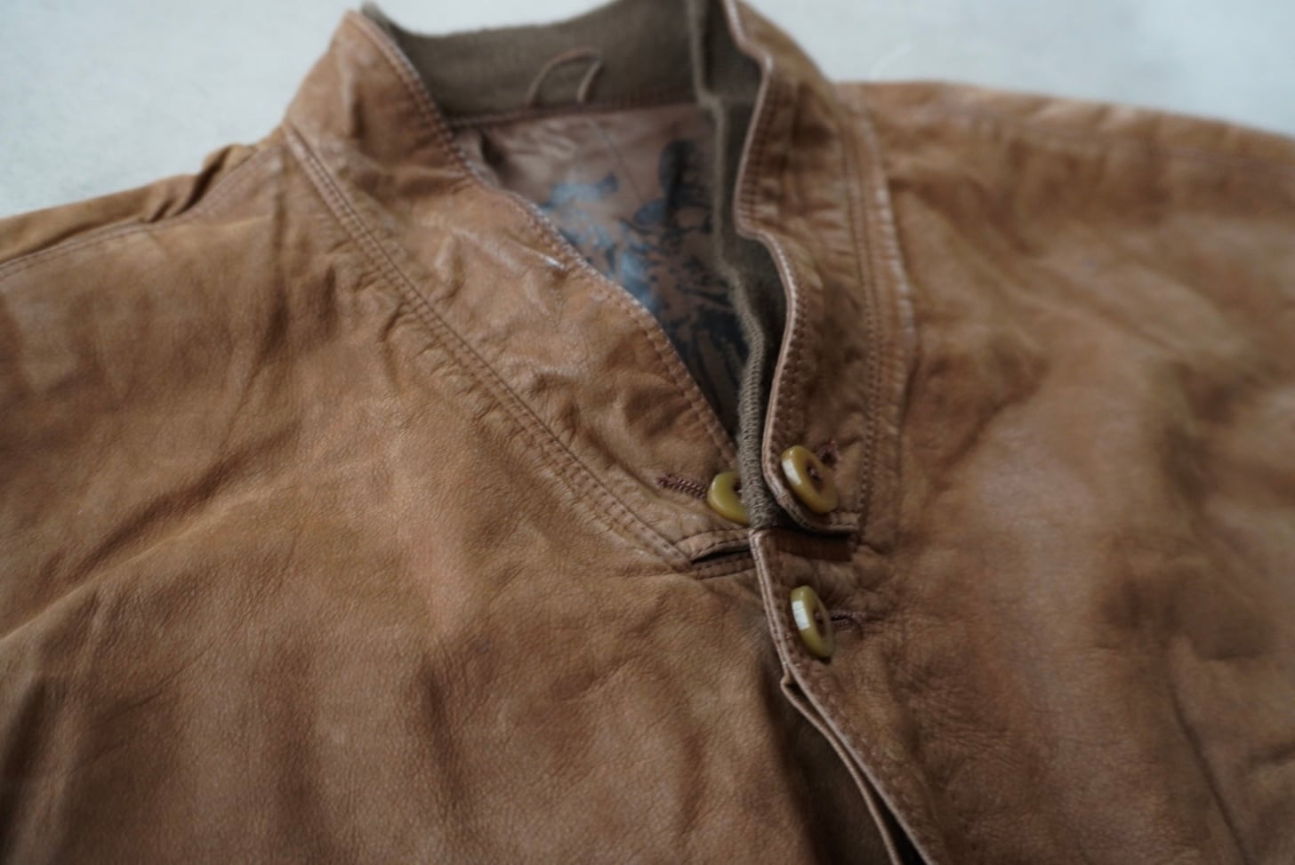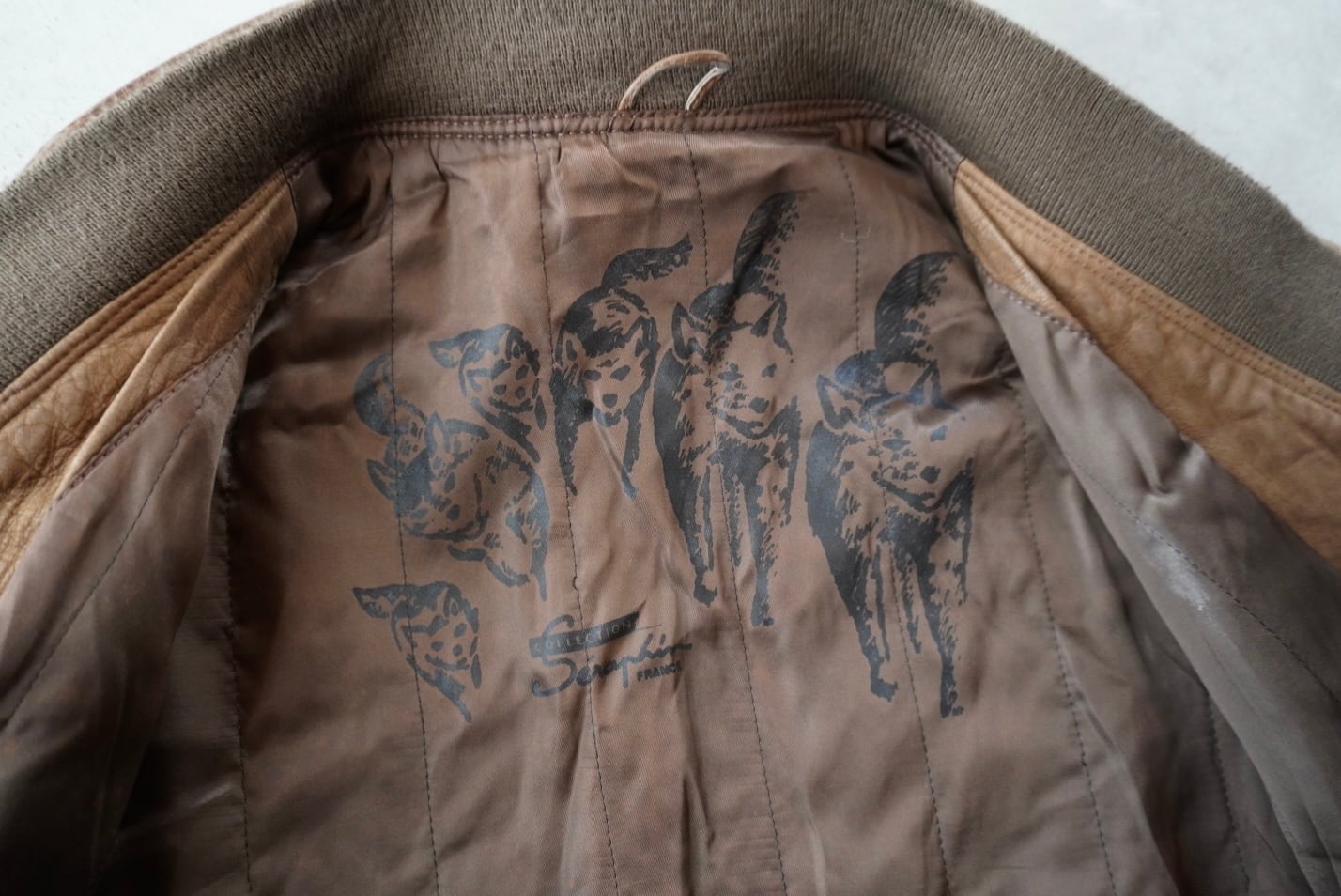 カーキのリブニットに革生地が重なる、小ぶりで特殊な形状の襟。