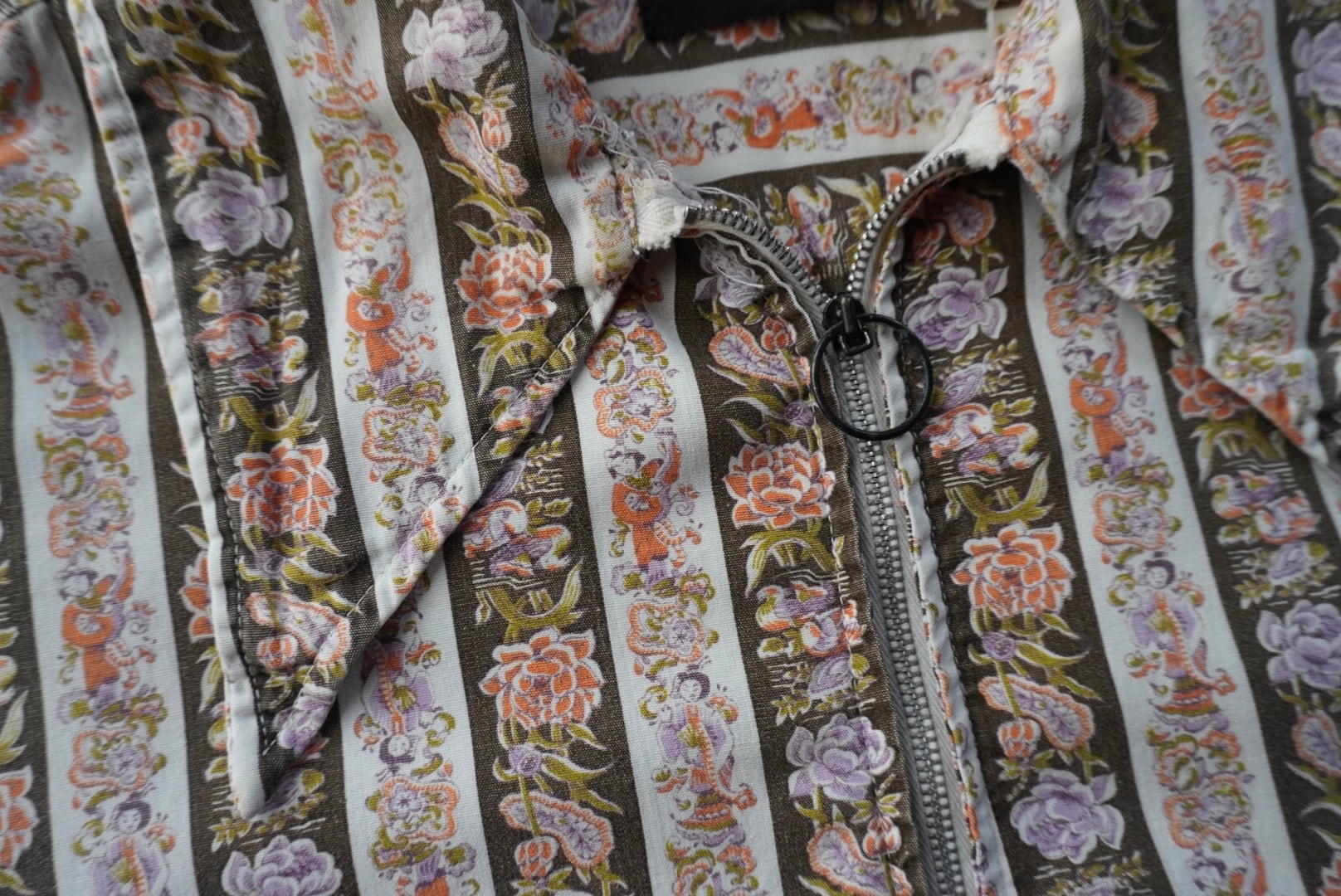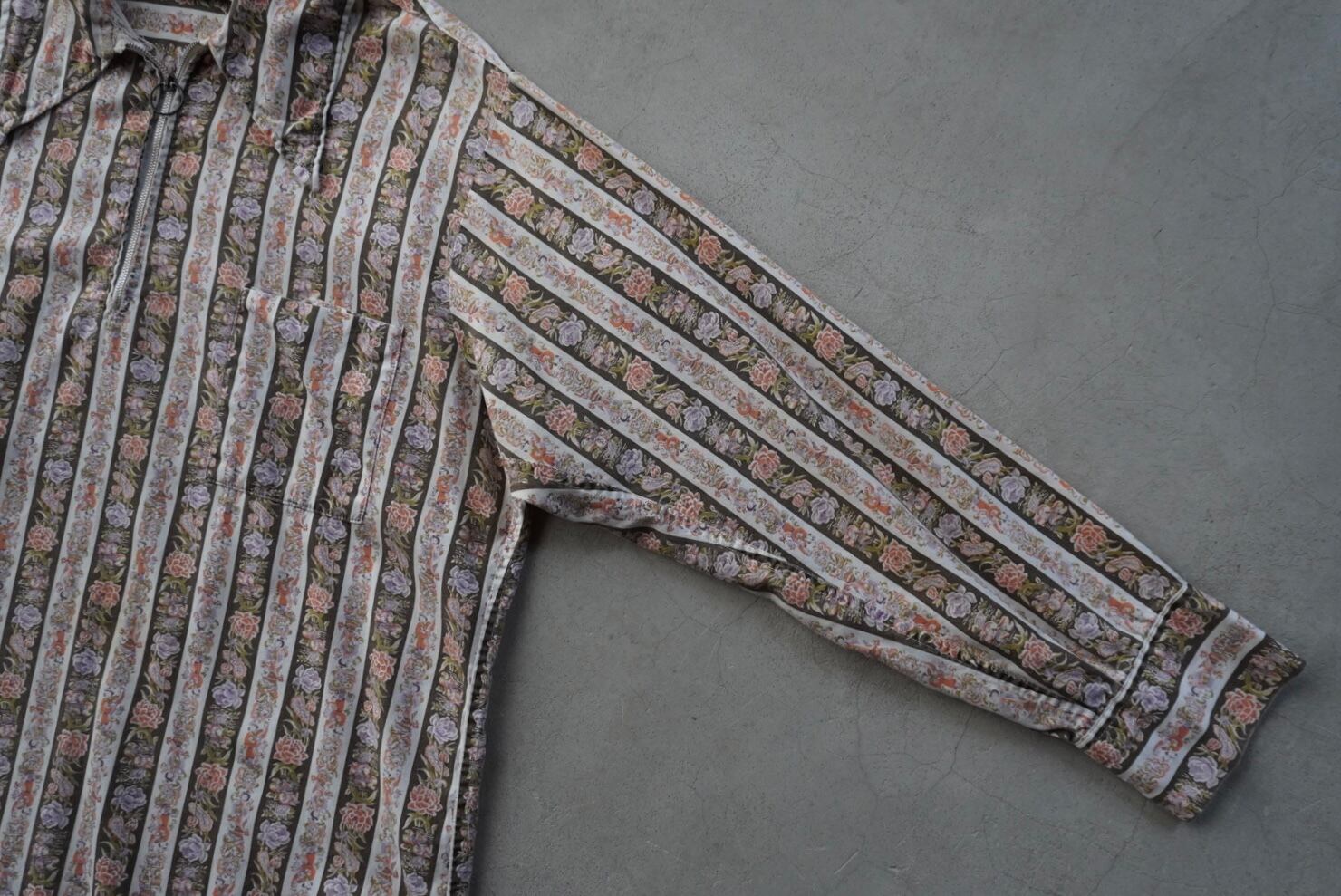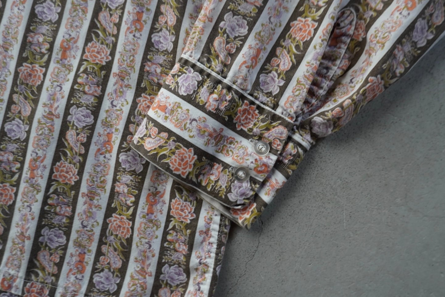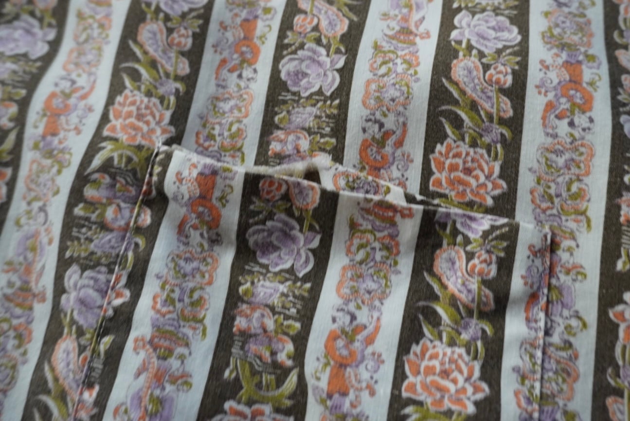 華やかな色使いの細かな総柄が、着古され良い雰囲気に仕上がった綿生地により心地良く中和されている様に感じます。
