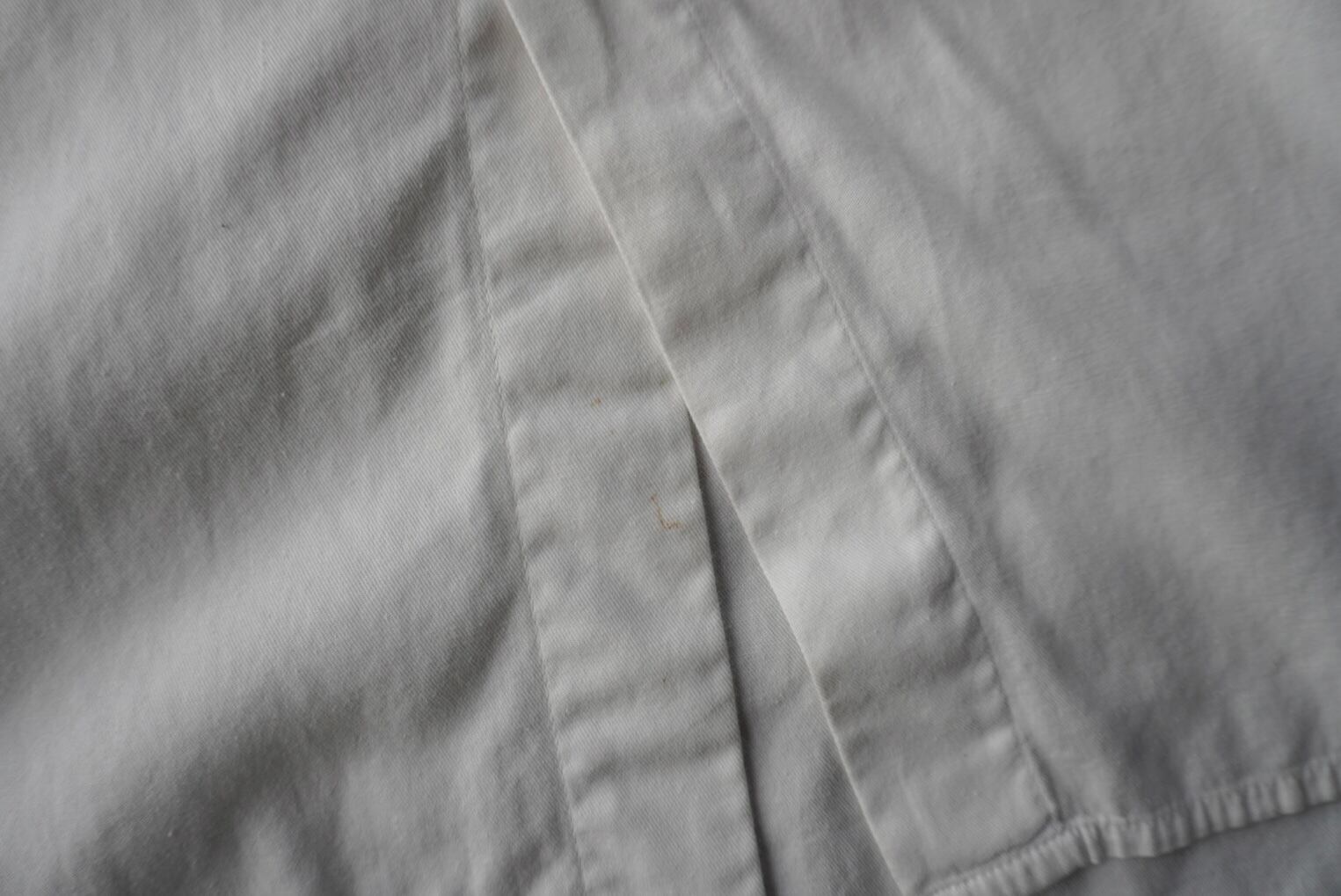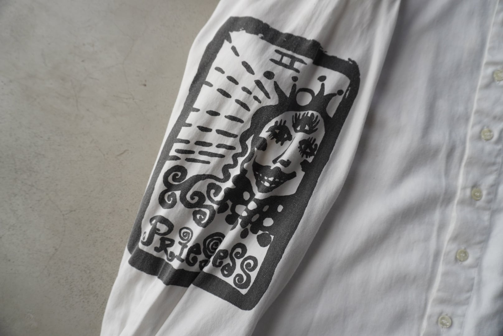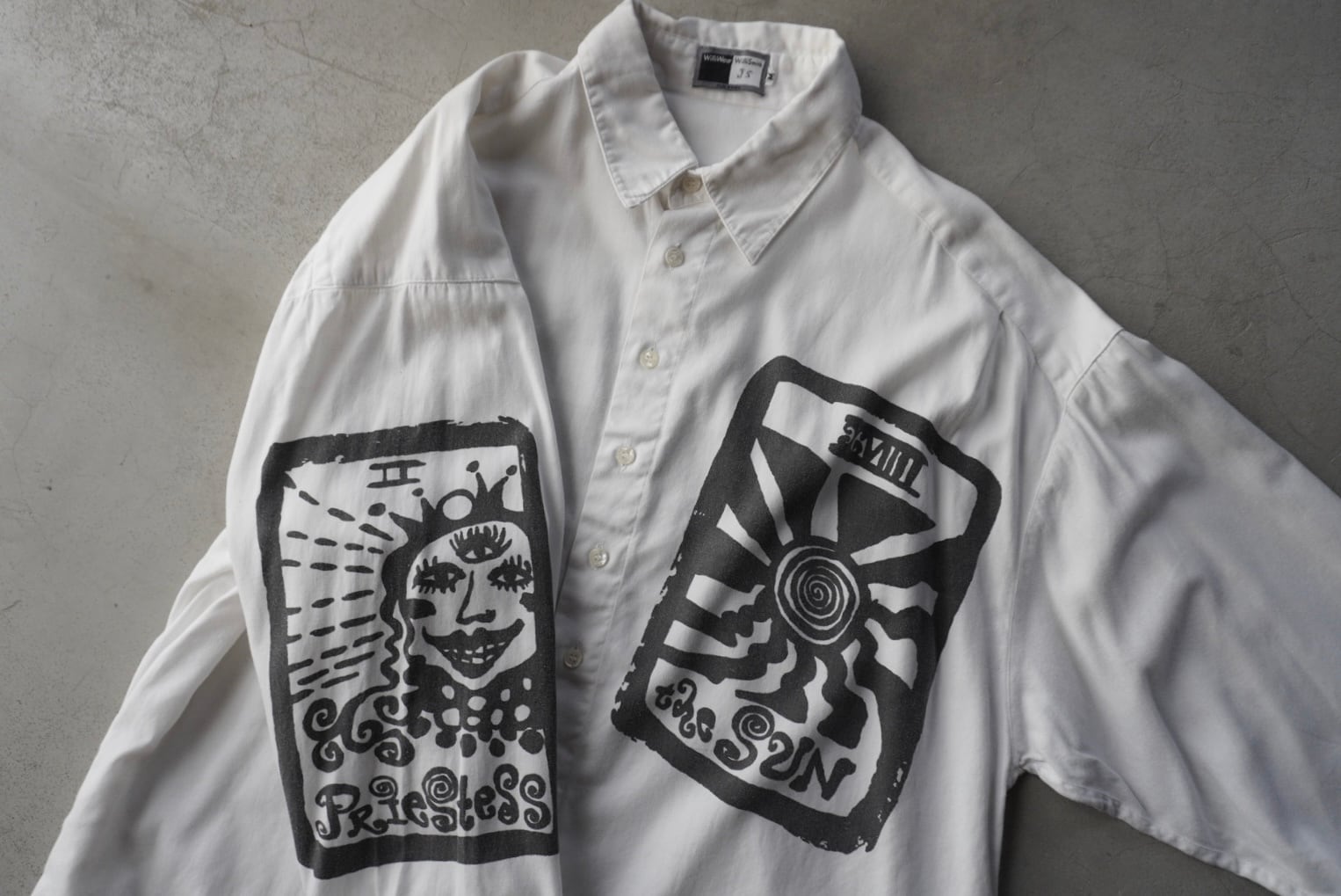 フロント9つボタン、前後差のあるオーバーサイズの白シャツに、
