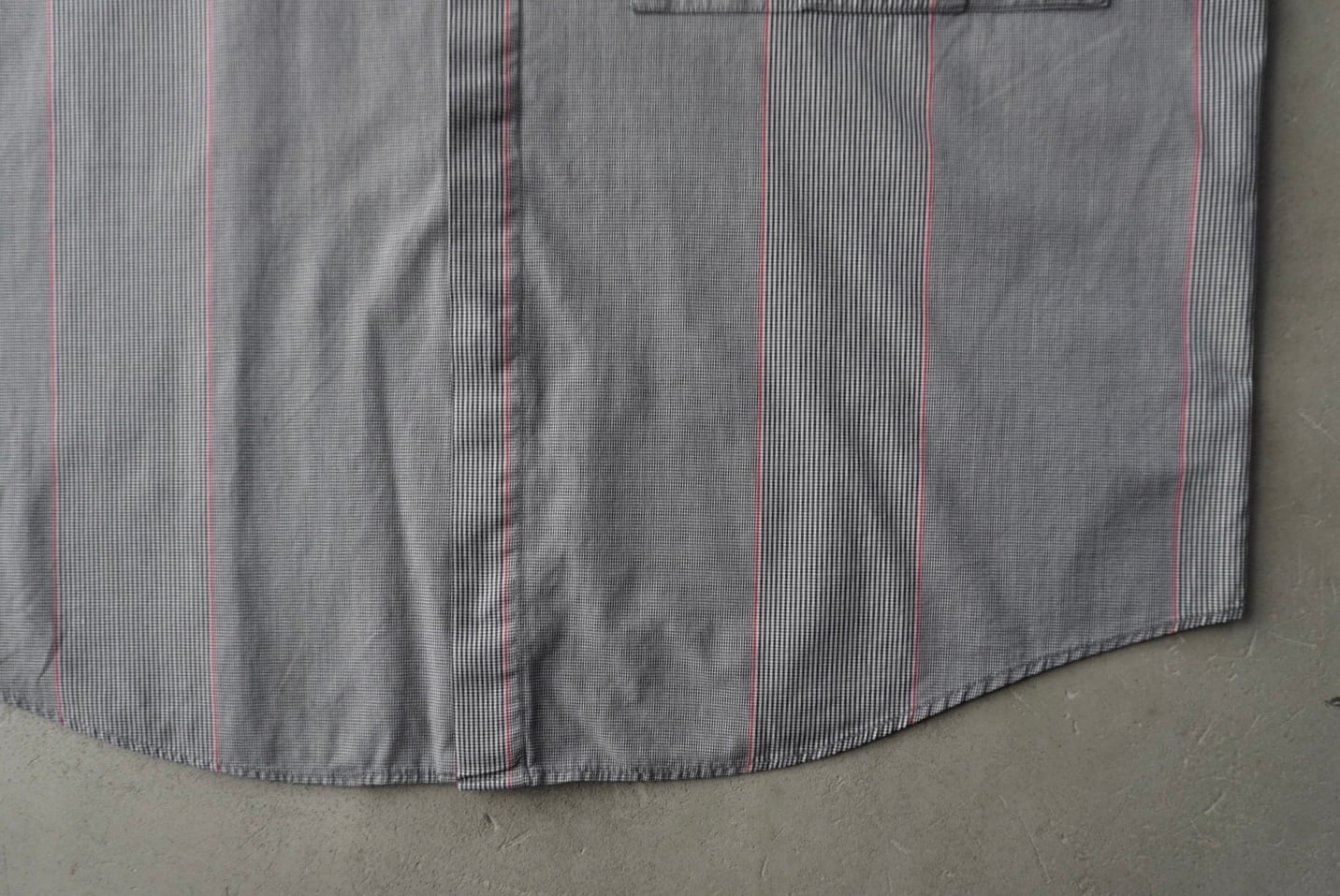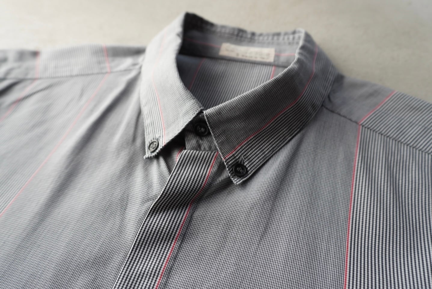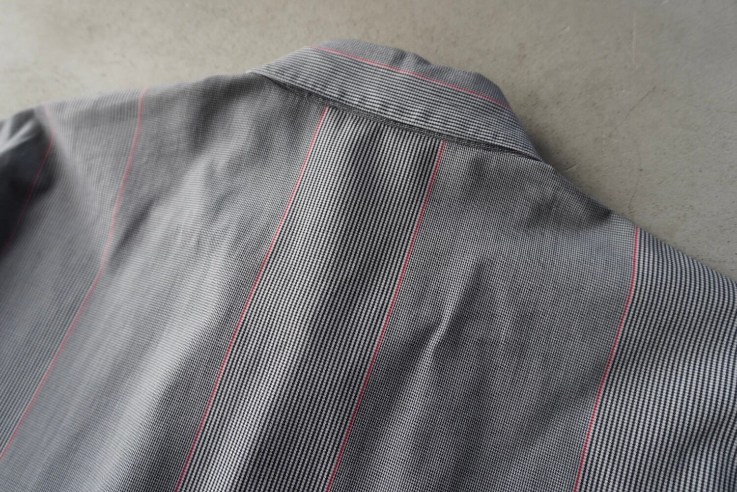 ライトグレー2種の細かな織柄に赤のラインが混じる、特徴的なストライプパターン。