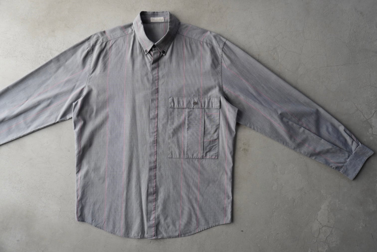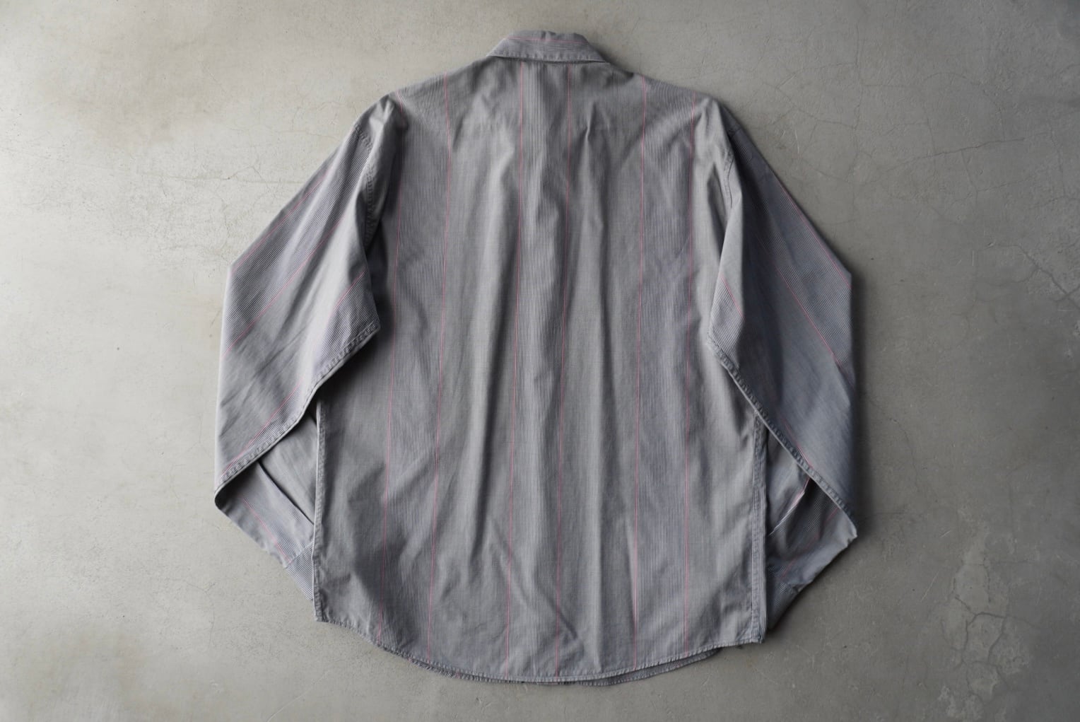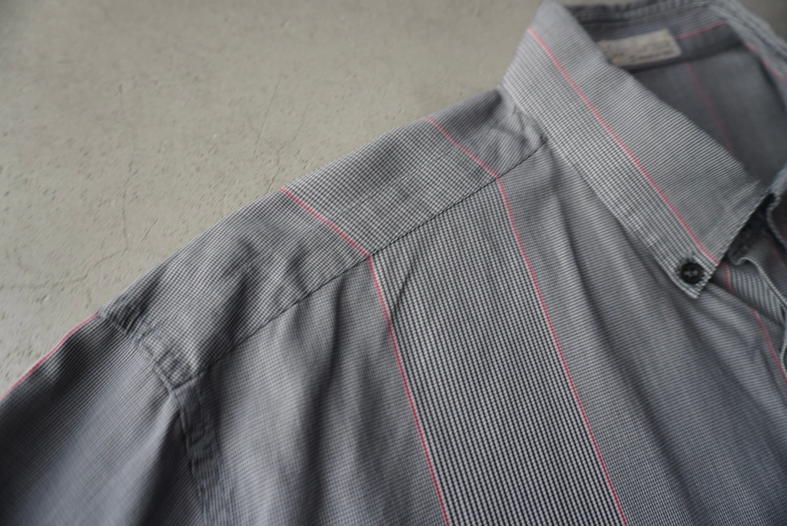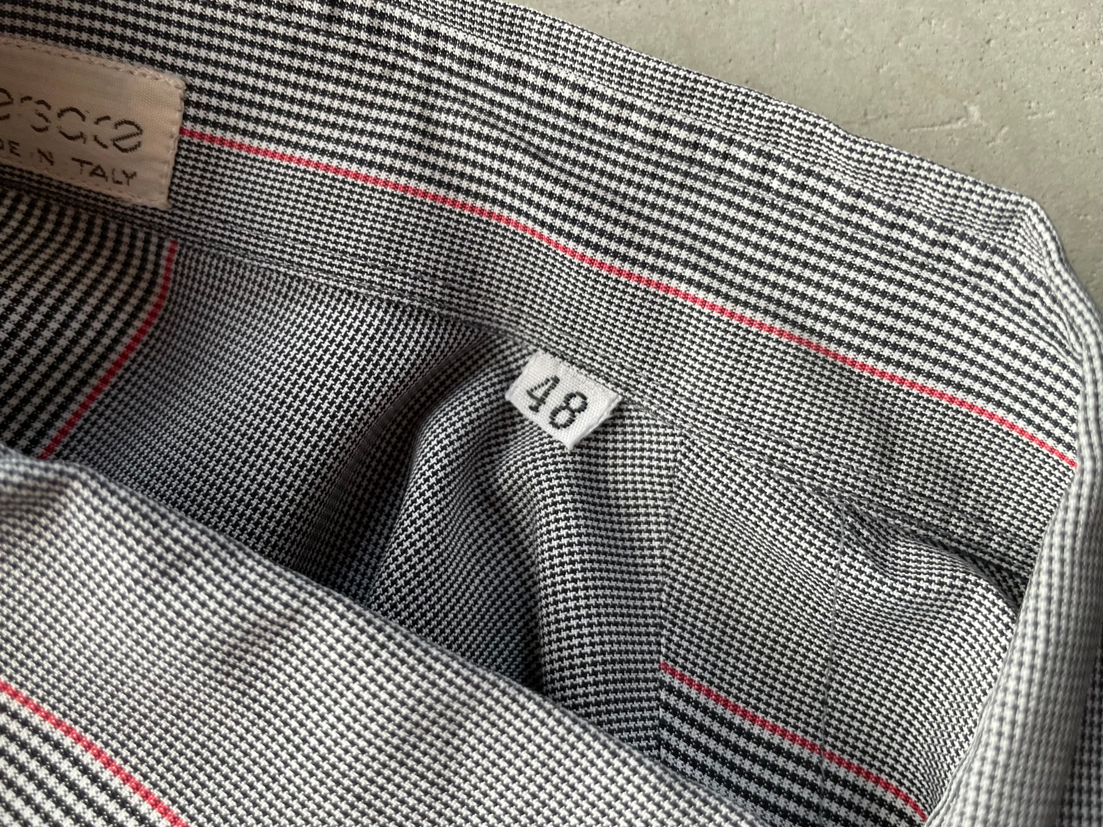 ライトグレー2種の細かな織柄に赤のラインが混じる、特徴的なストライプパターン。