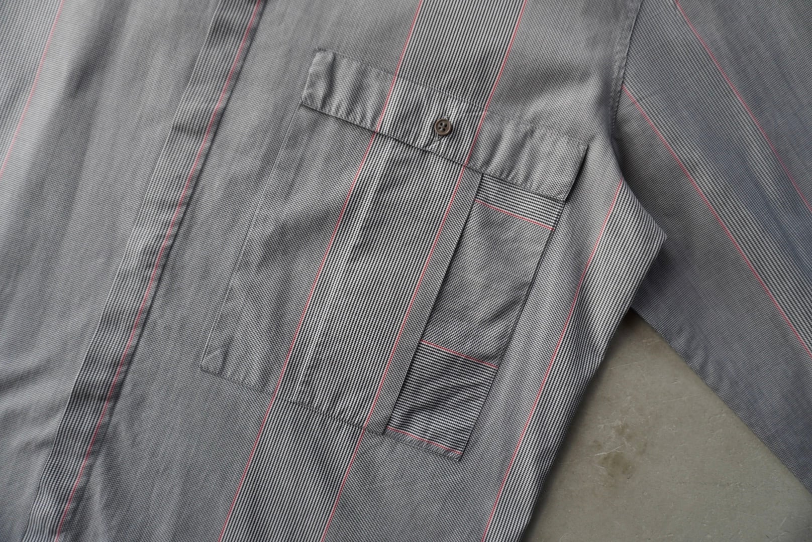 柄合わせも完璧な胸ポケットは、タック位置でワンパネルのみ縦横が変えられた、遊びのある生地使い。