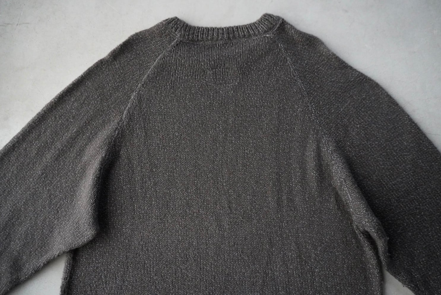 彩度を抑えたカーキグレーに白糸が混じる、奥行きのある編み地。