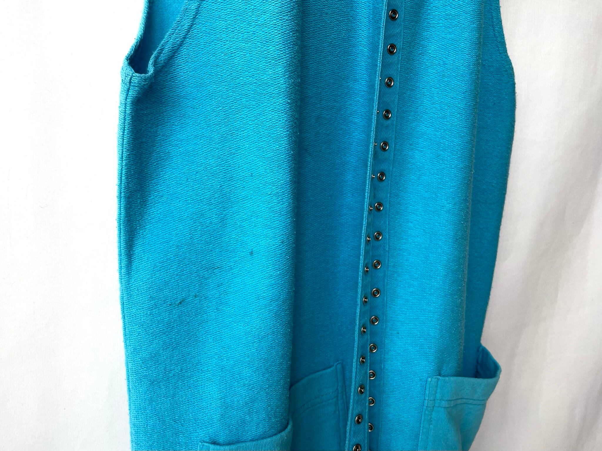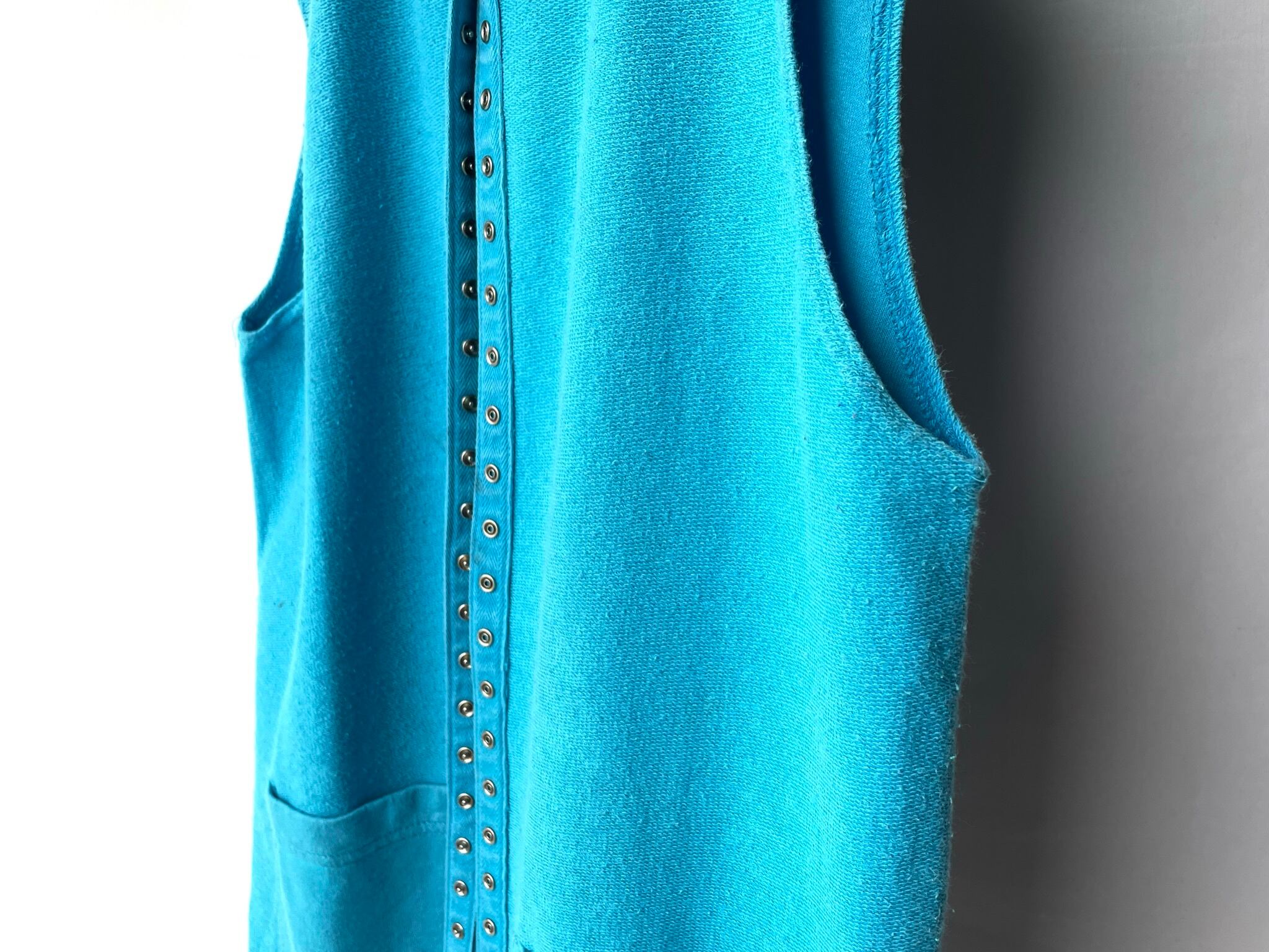 Metal snaps arranged heavily from the neck to the hem.