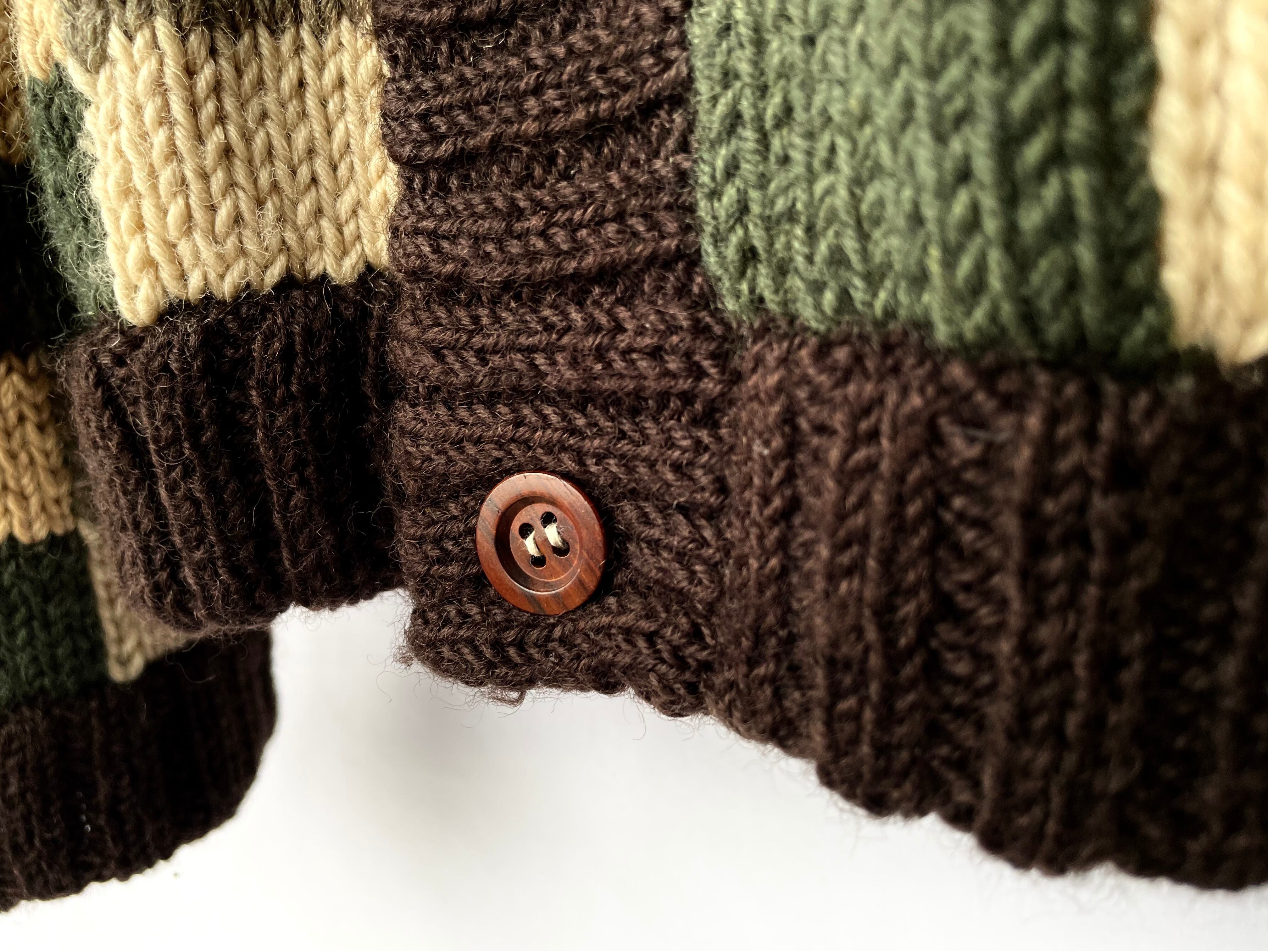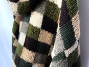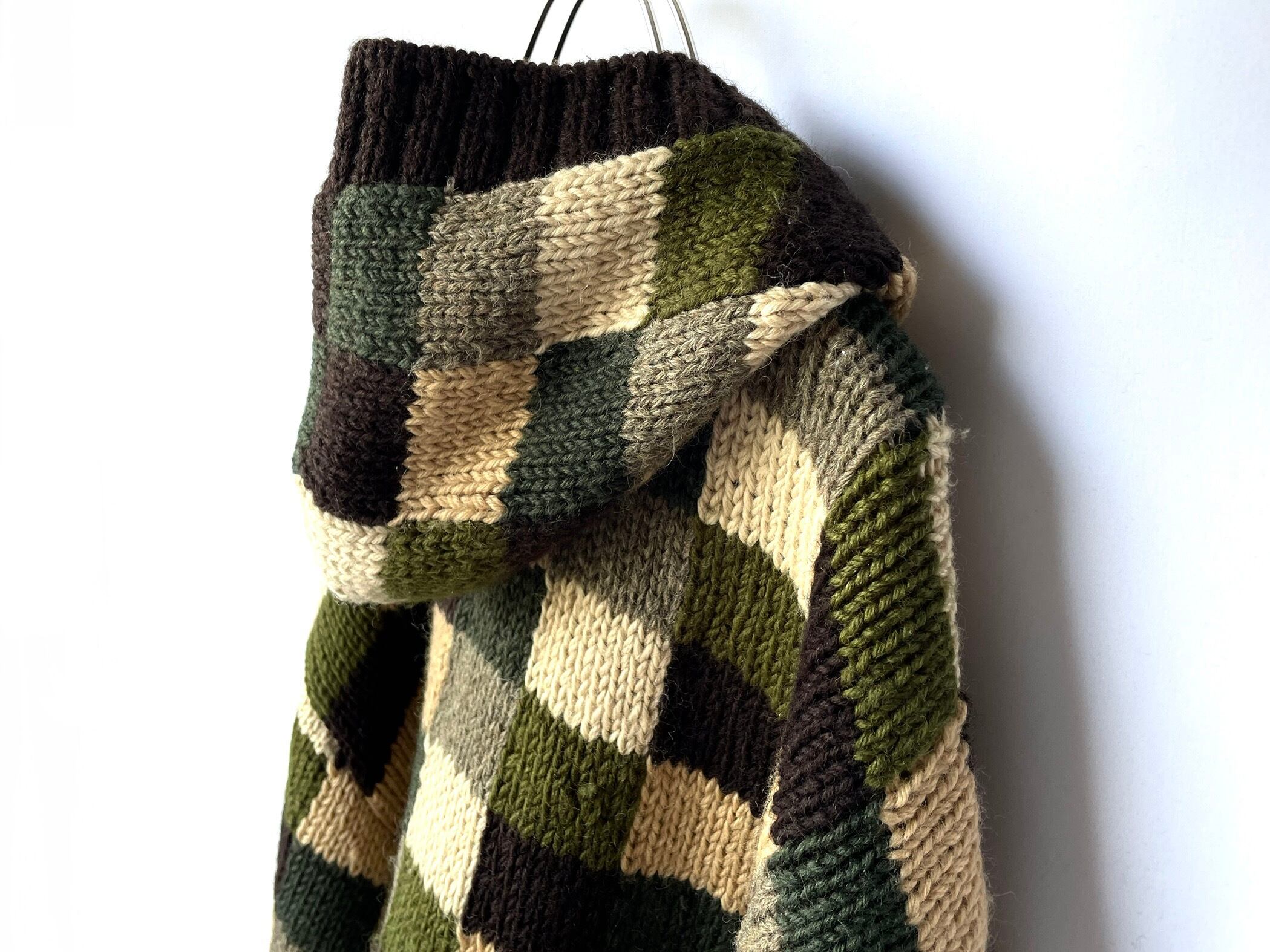 濃淡のグリーン、カーキを含む計6色の毛糸がスクエア型に編み込まれ、