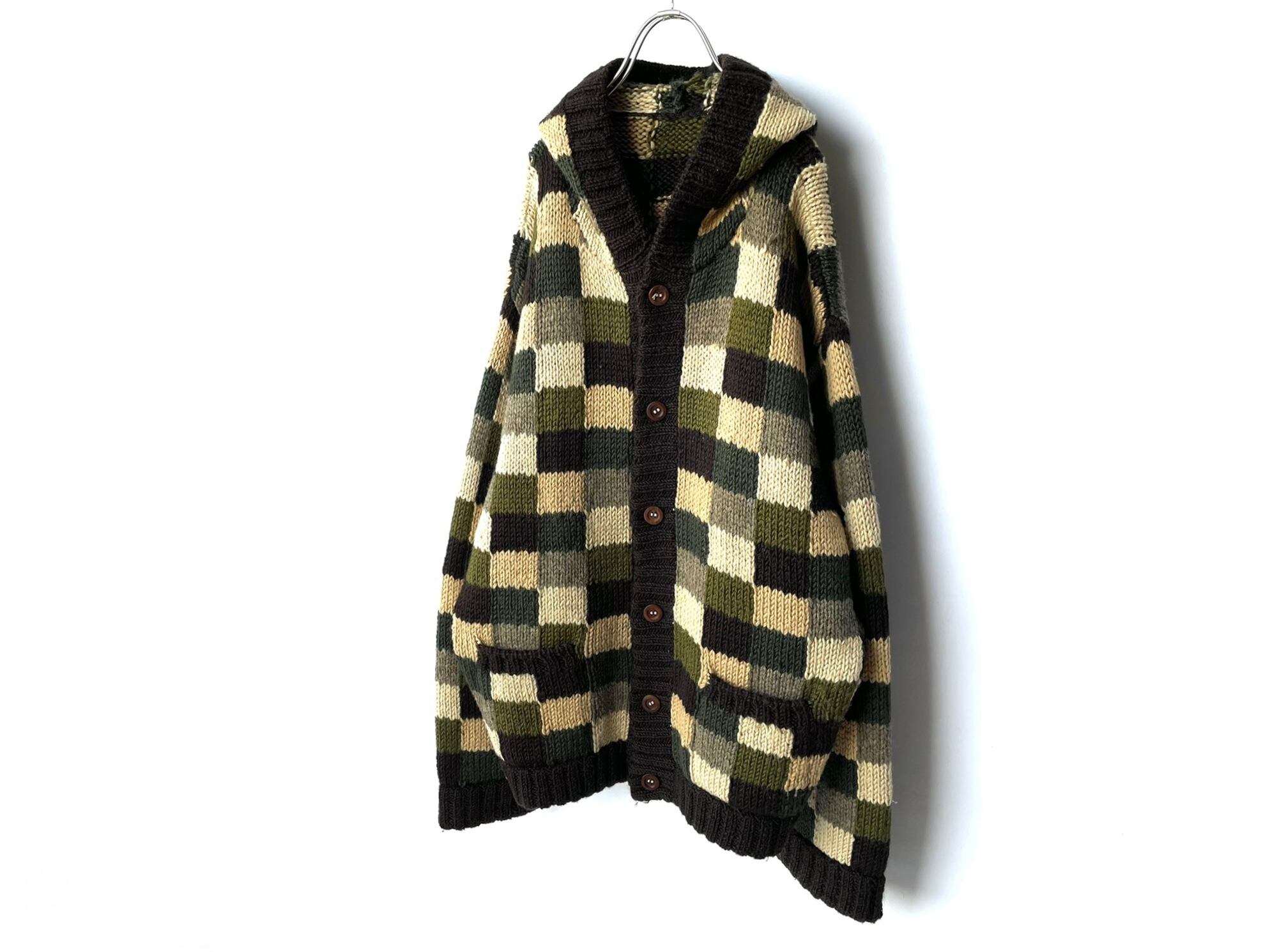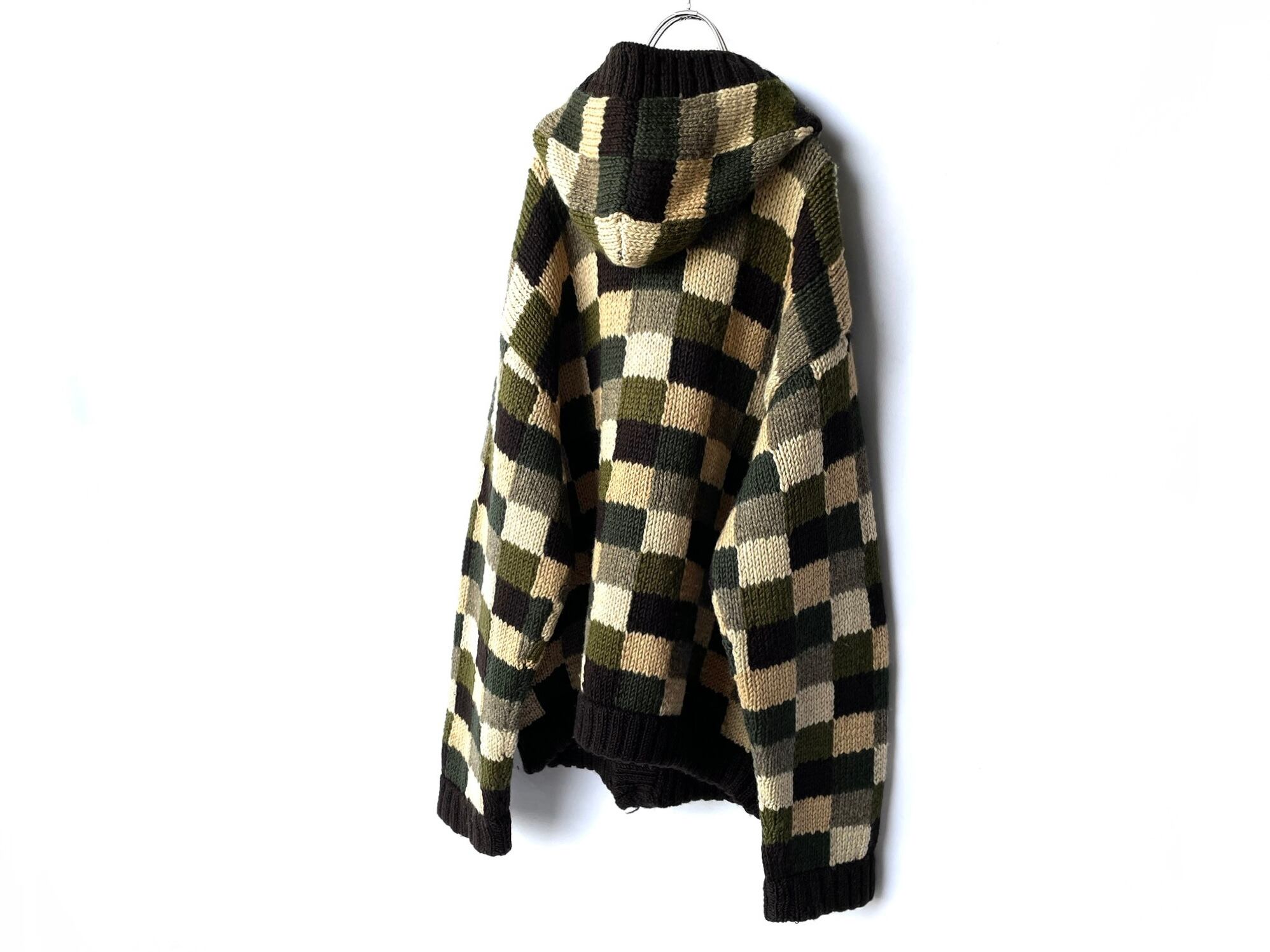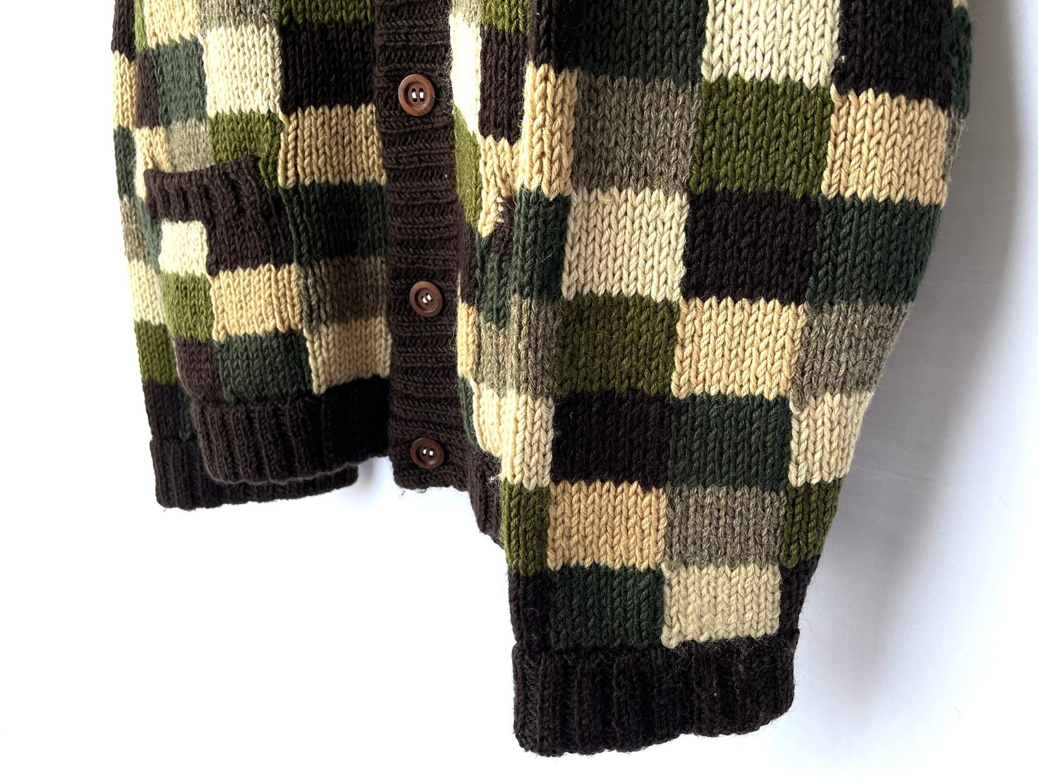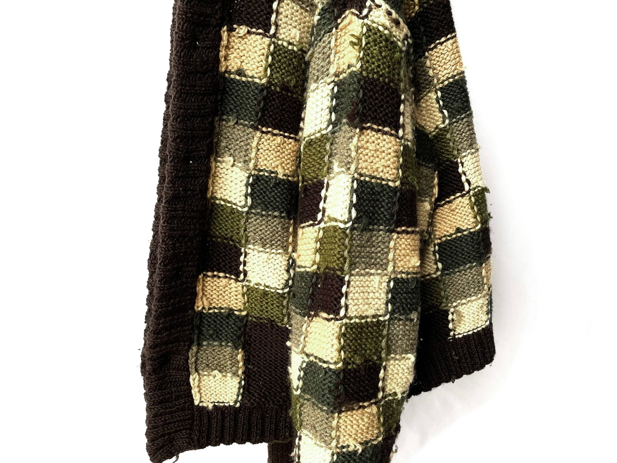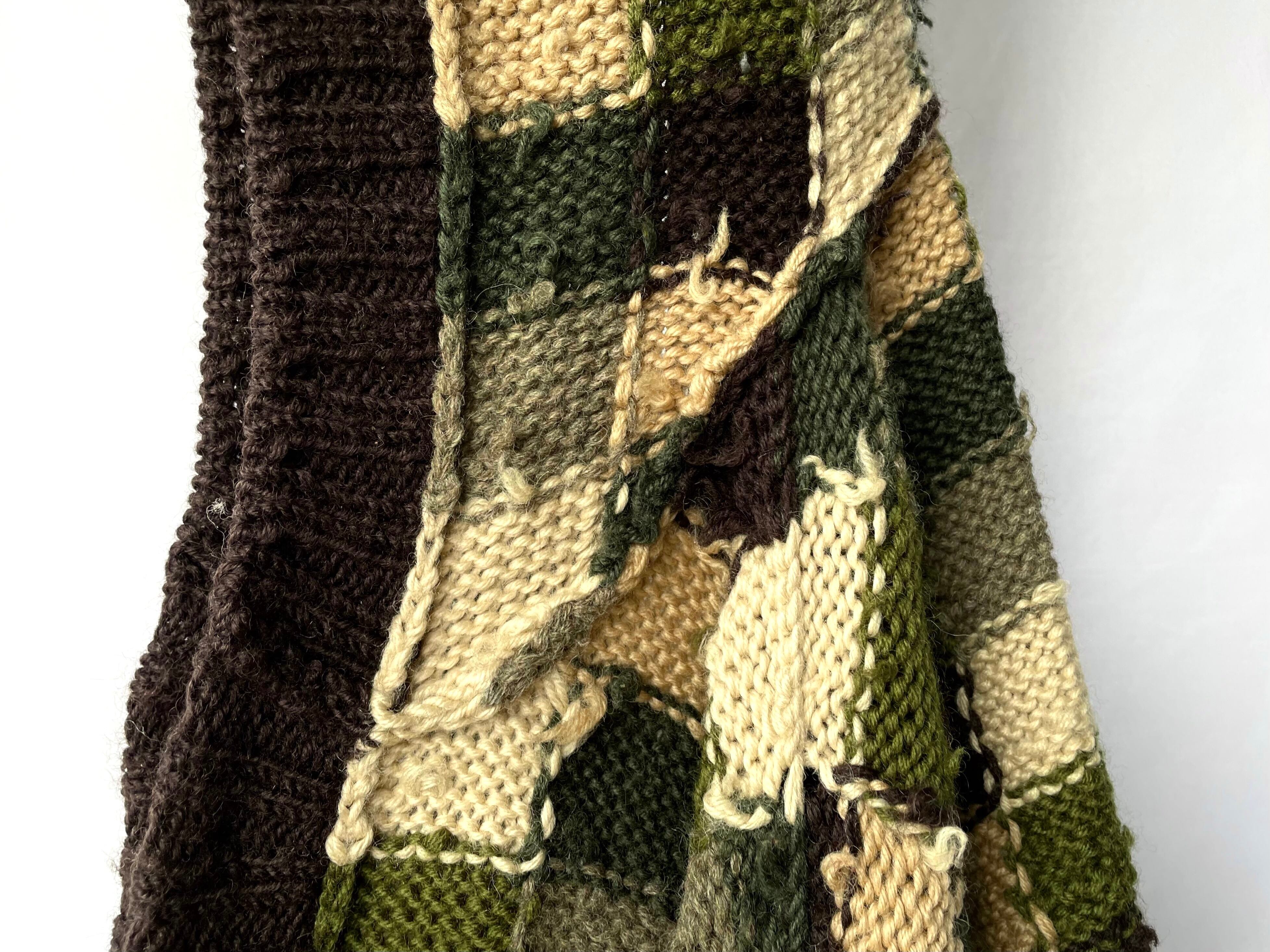 A block check made by knitting yarns in a total of six colors, from ivory to dark brown, shades of green, and khaki, into a square shape and piecing them together.