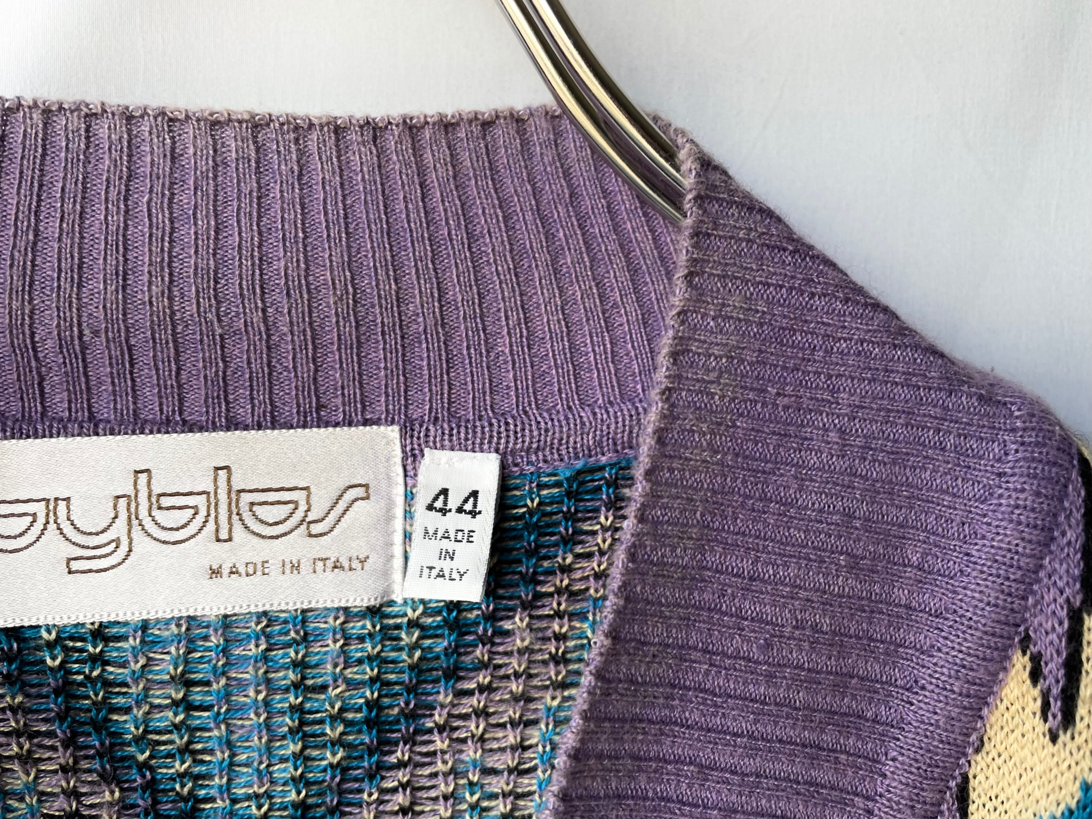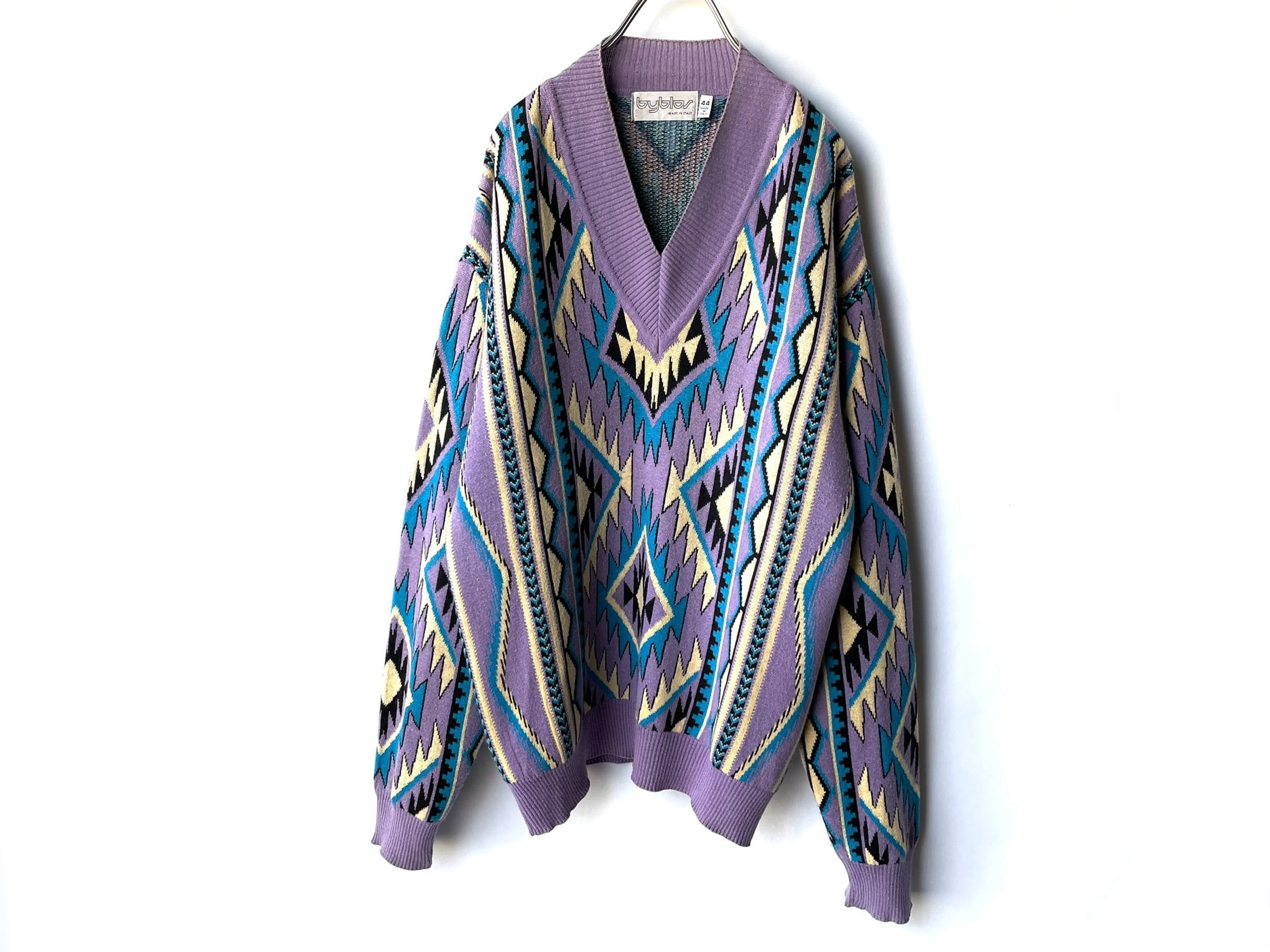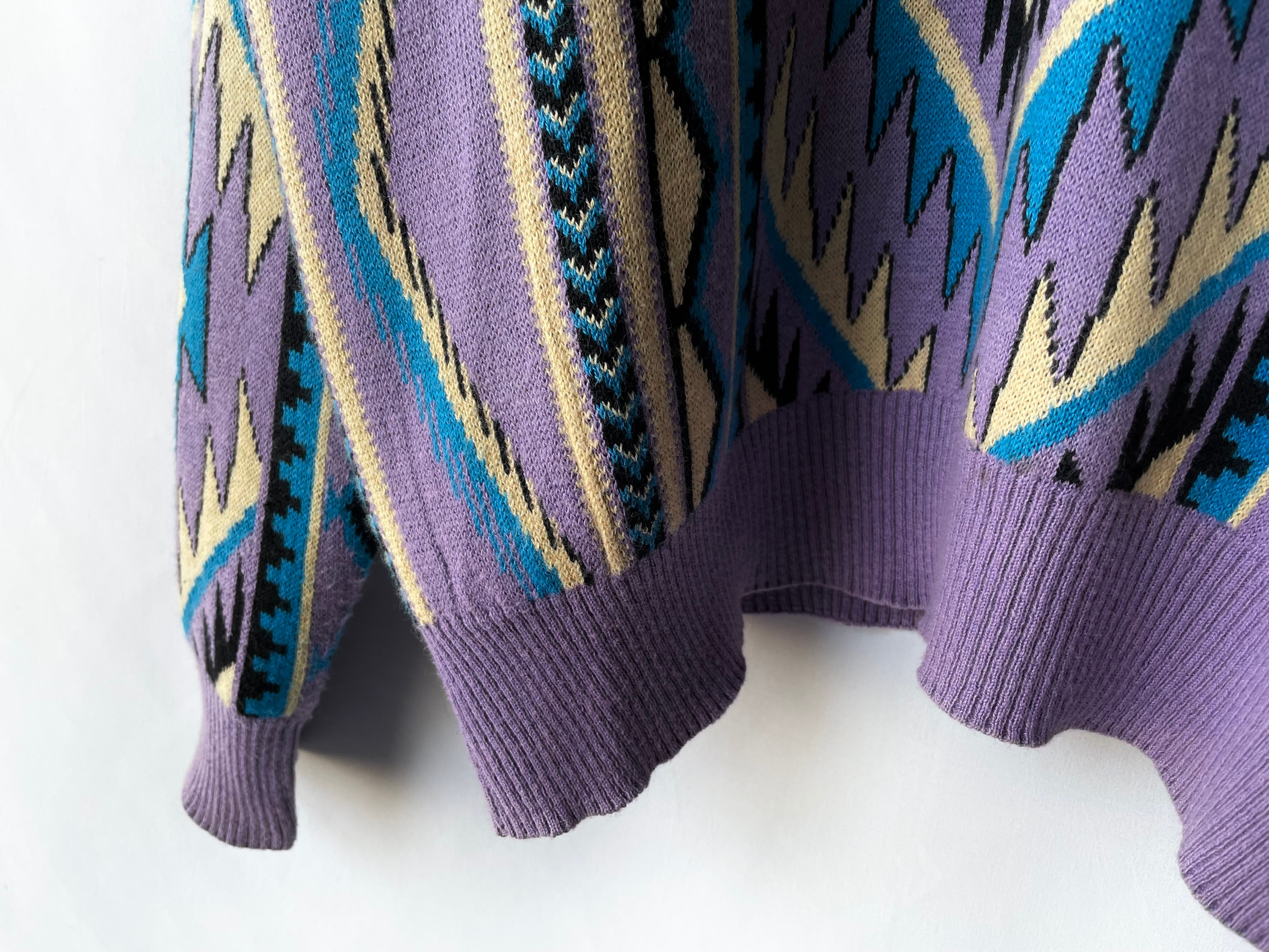淡いパープルベースに青/黒/イエローベージュが混じるネイティブパターン