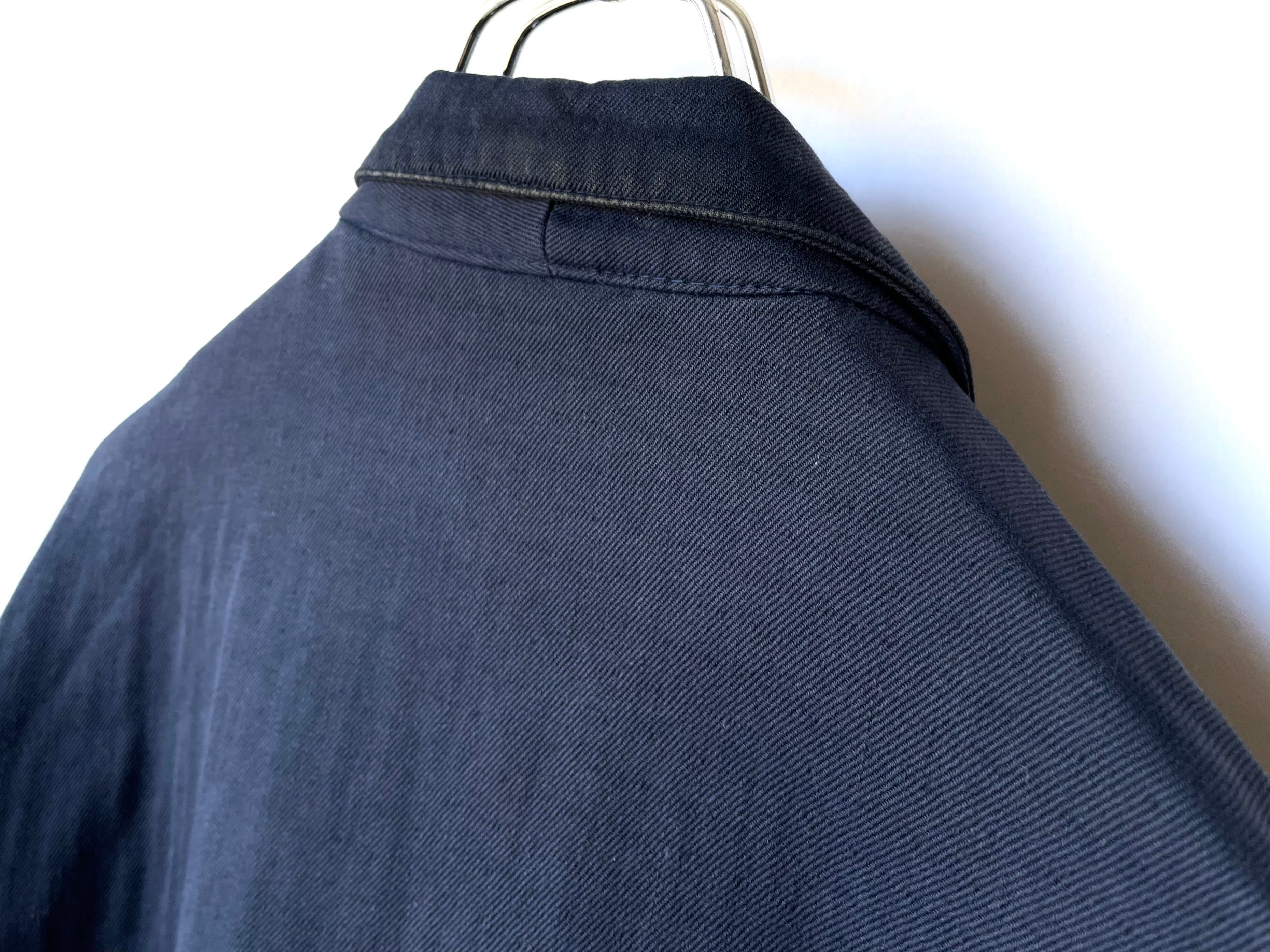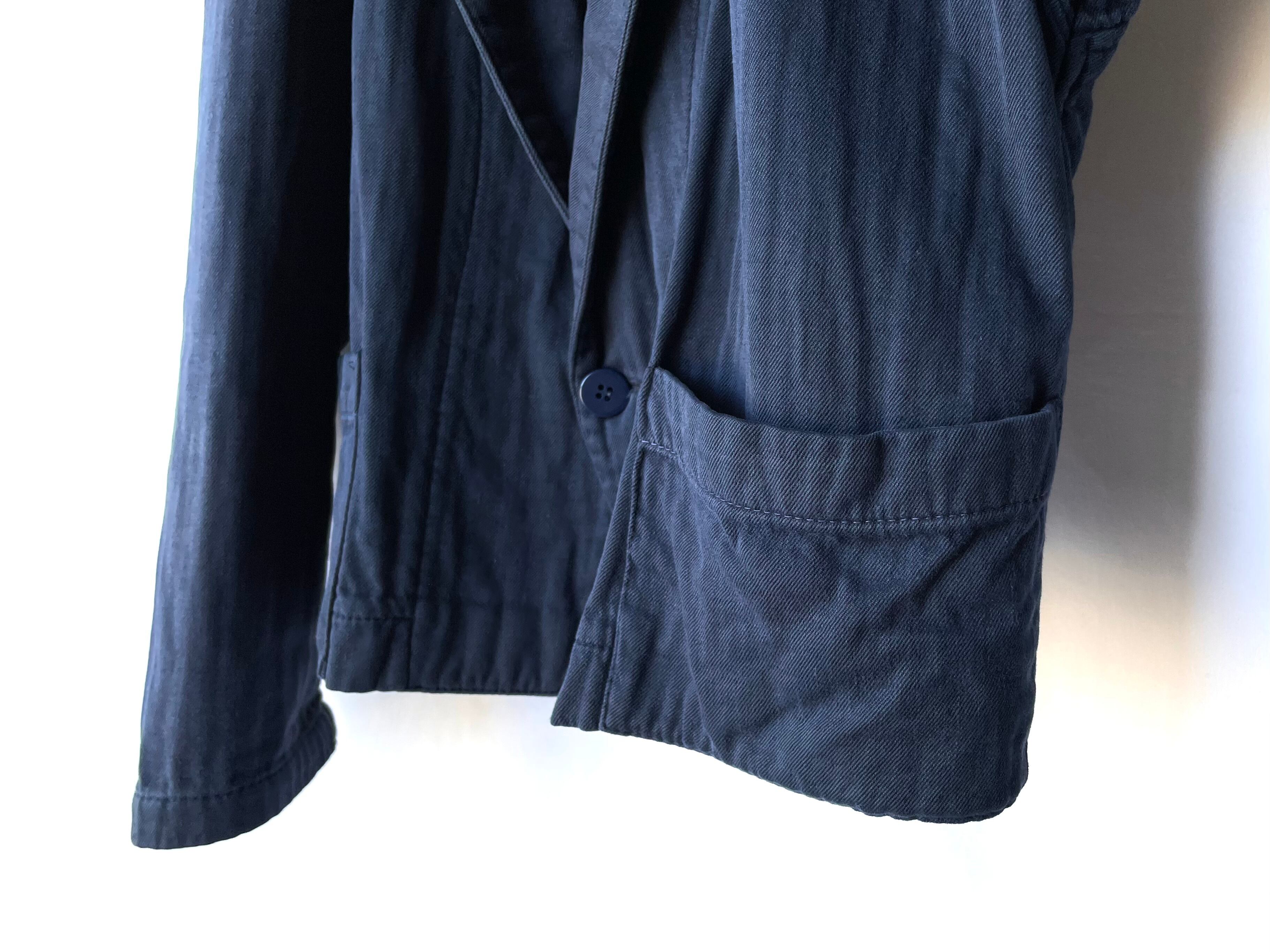裾ポケットの半分程で裁ち切った様な、裾一点留め/やや短丈のカジュアルテーラード。