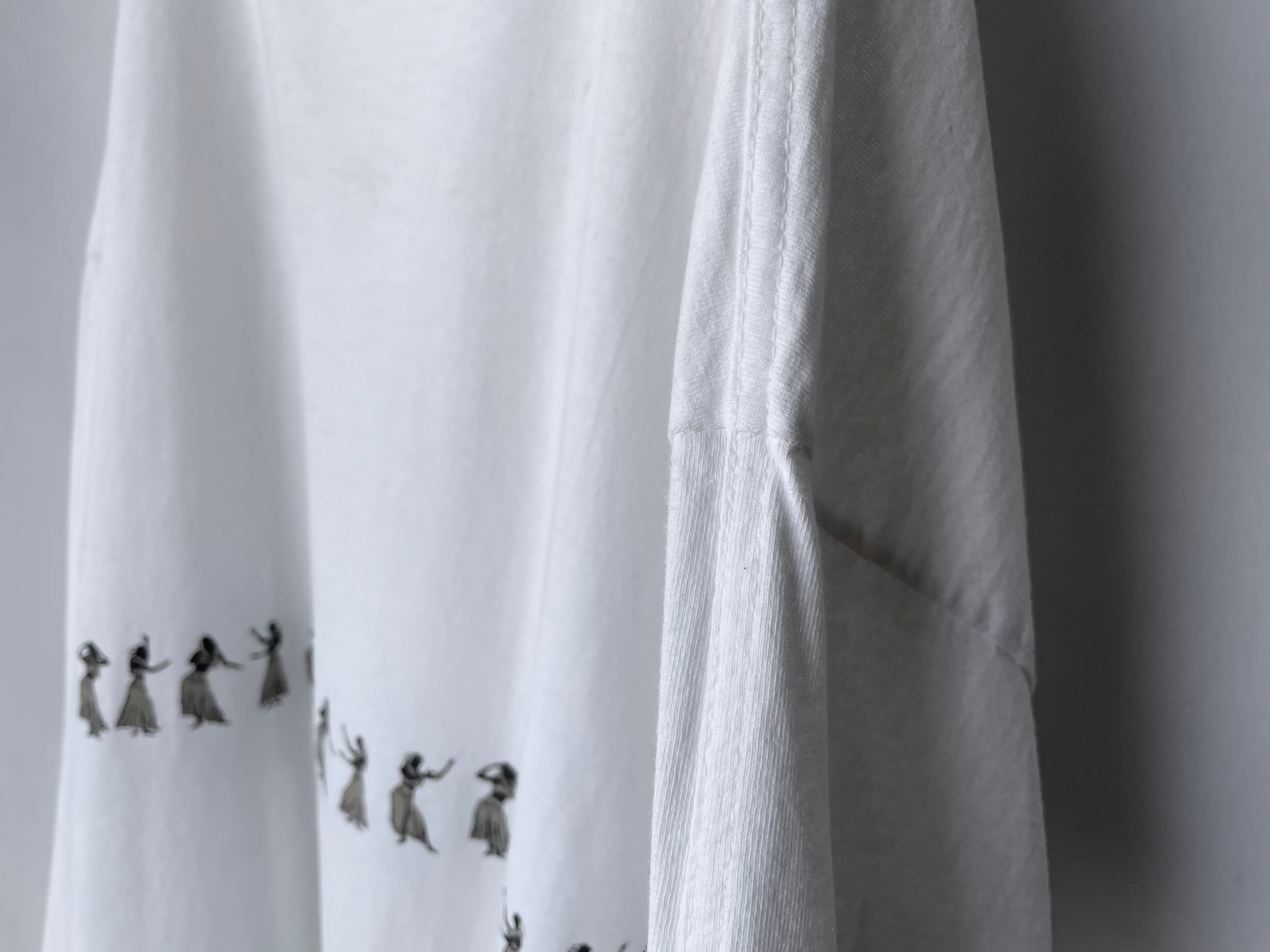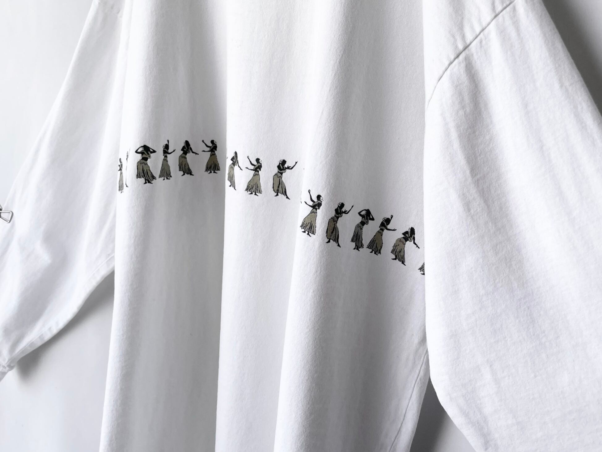 A detailed print of hula dancers performing various choreographies lined up all around the torso on a plain white background.