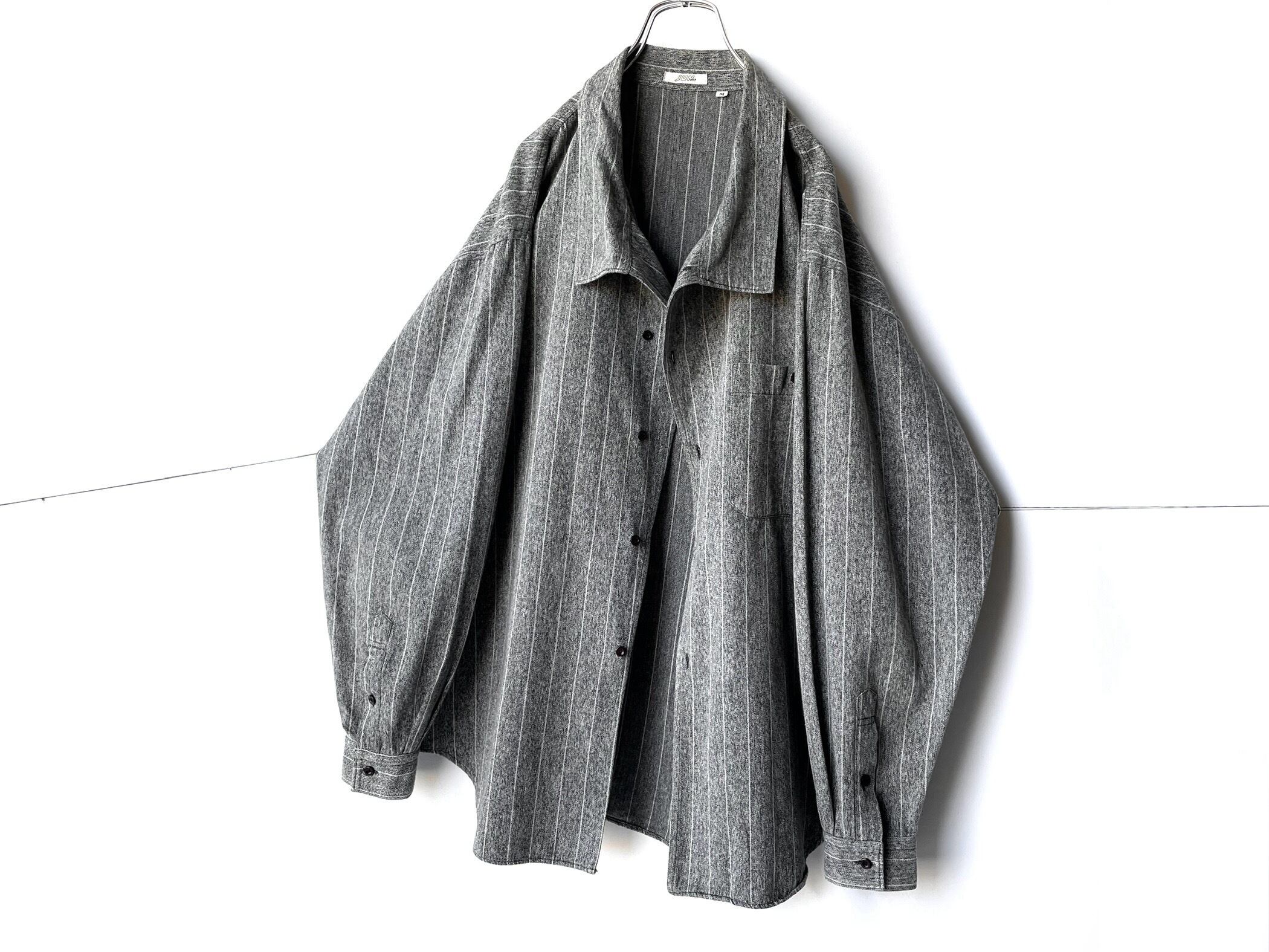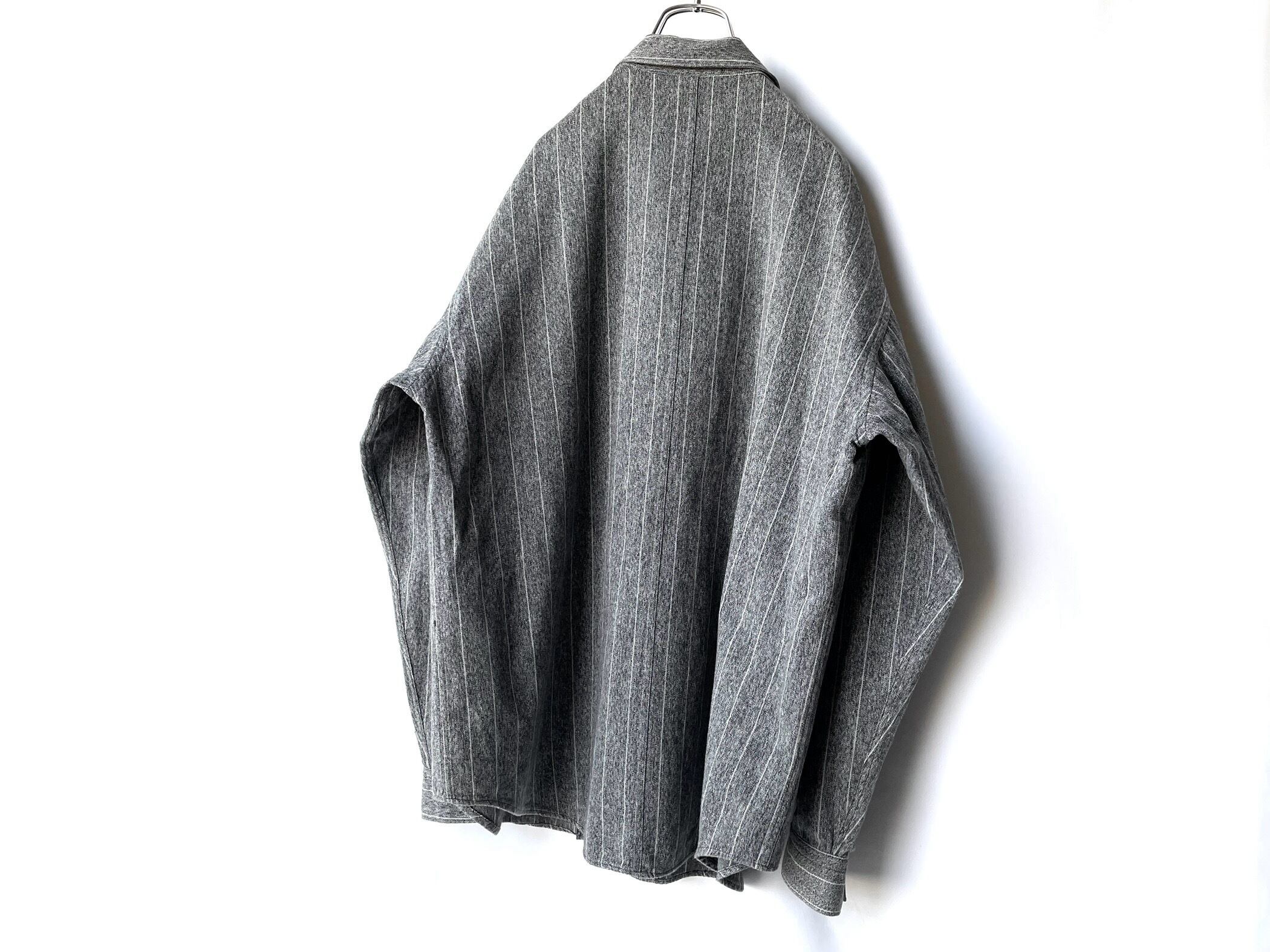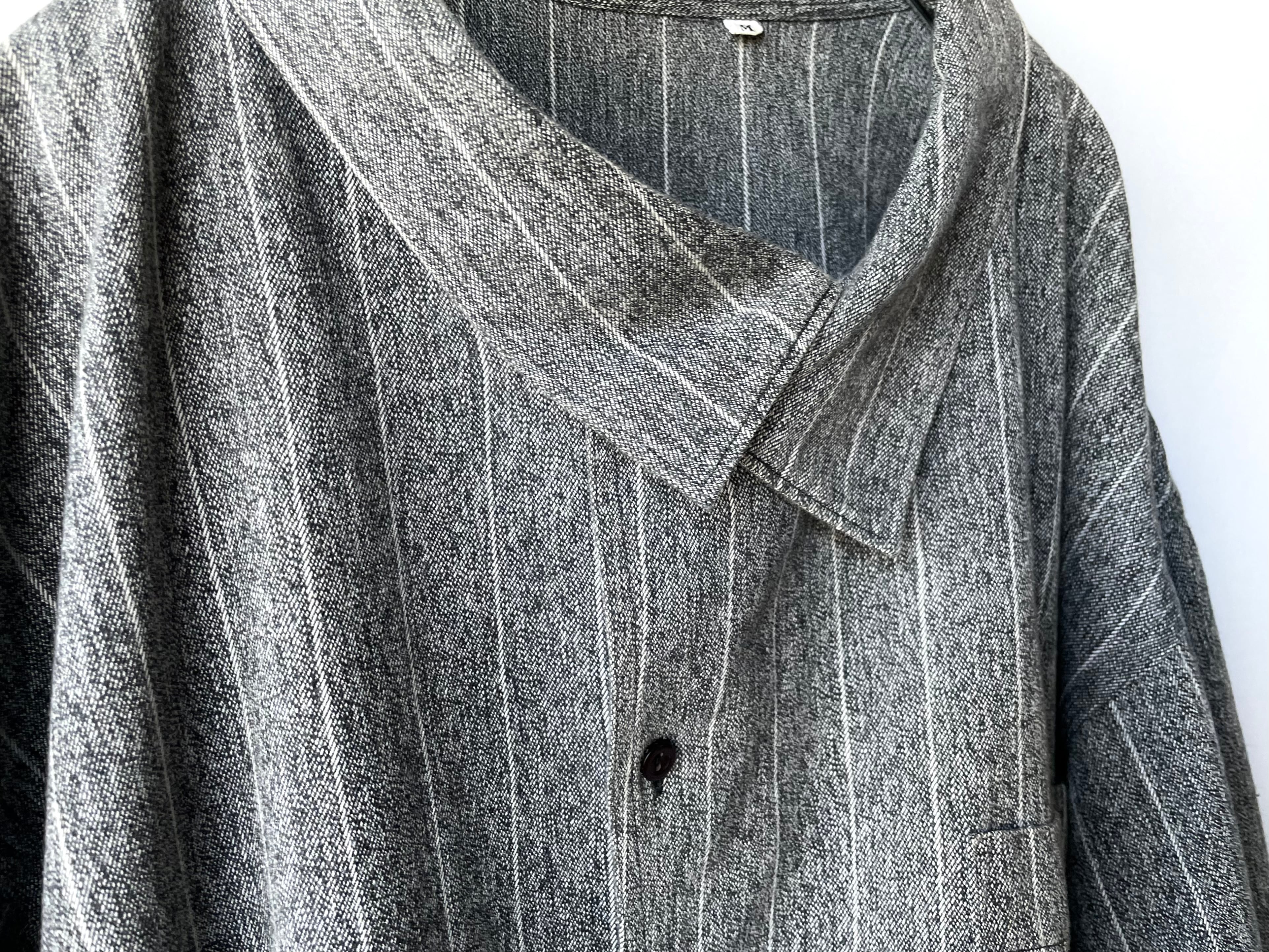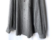 広い首周りに大判な襟が深く重なり合います。