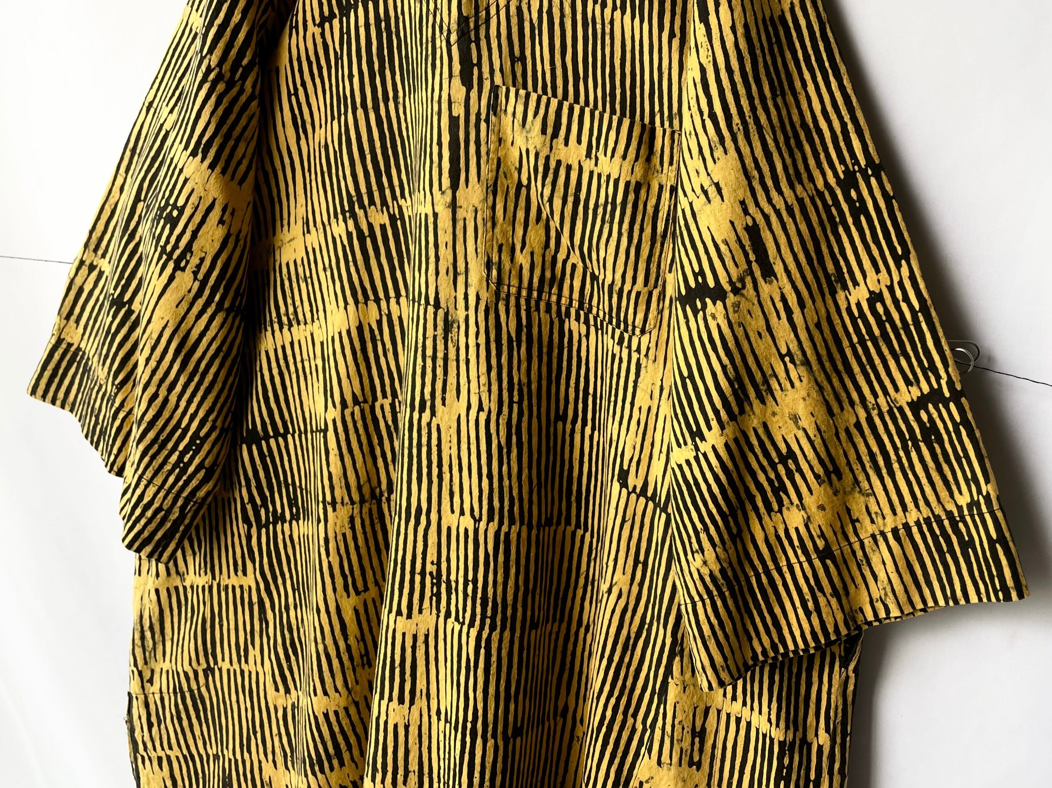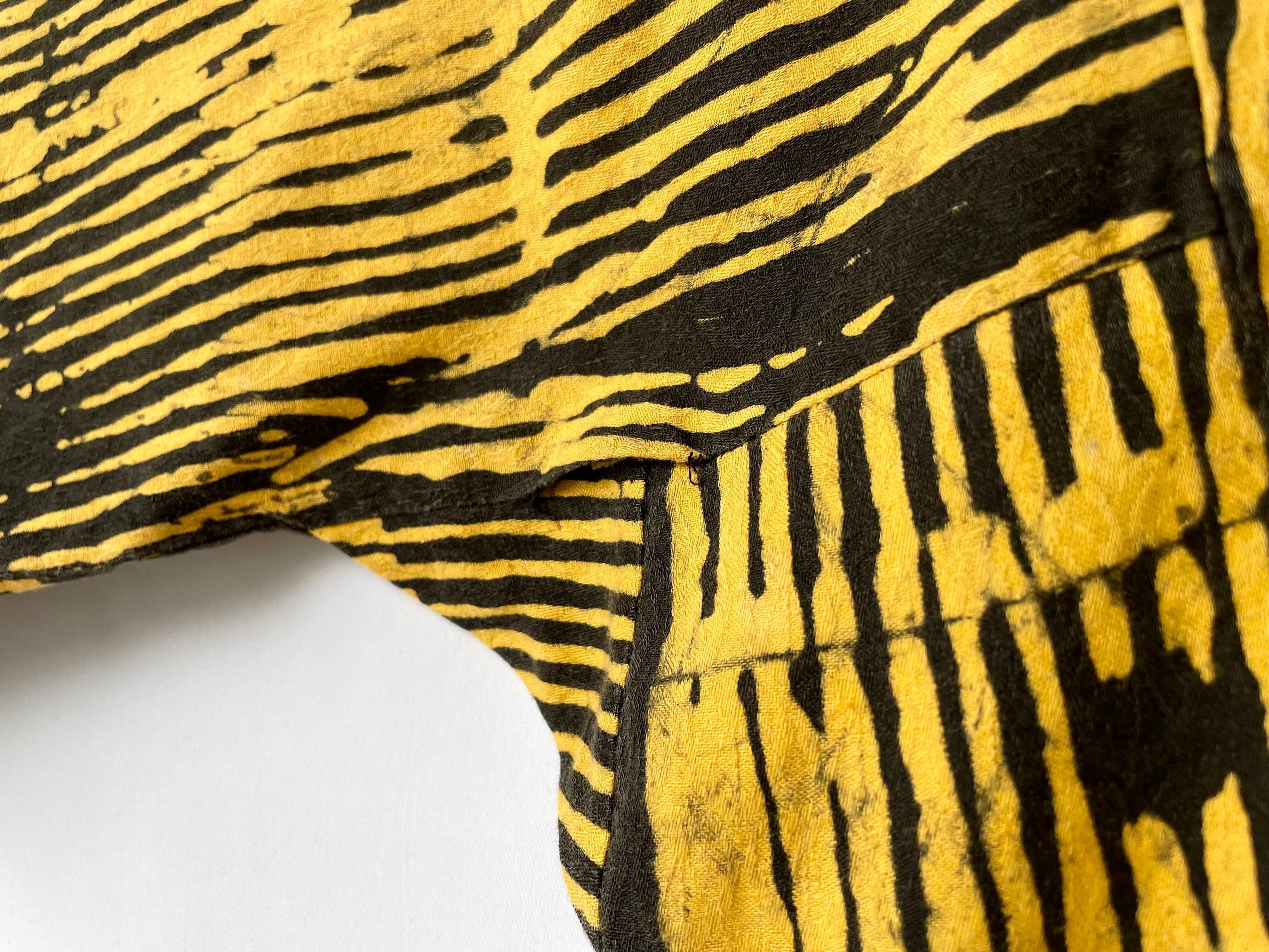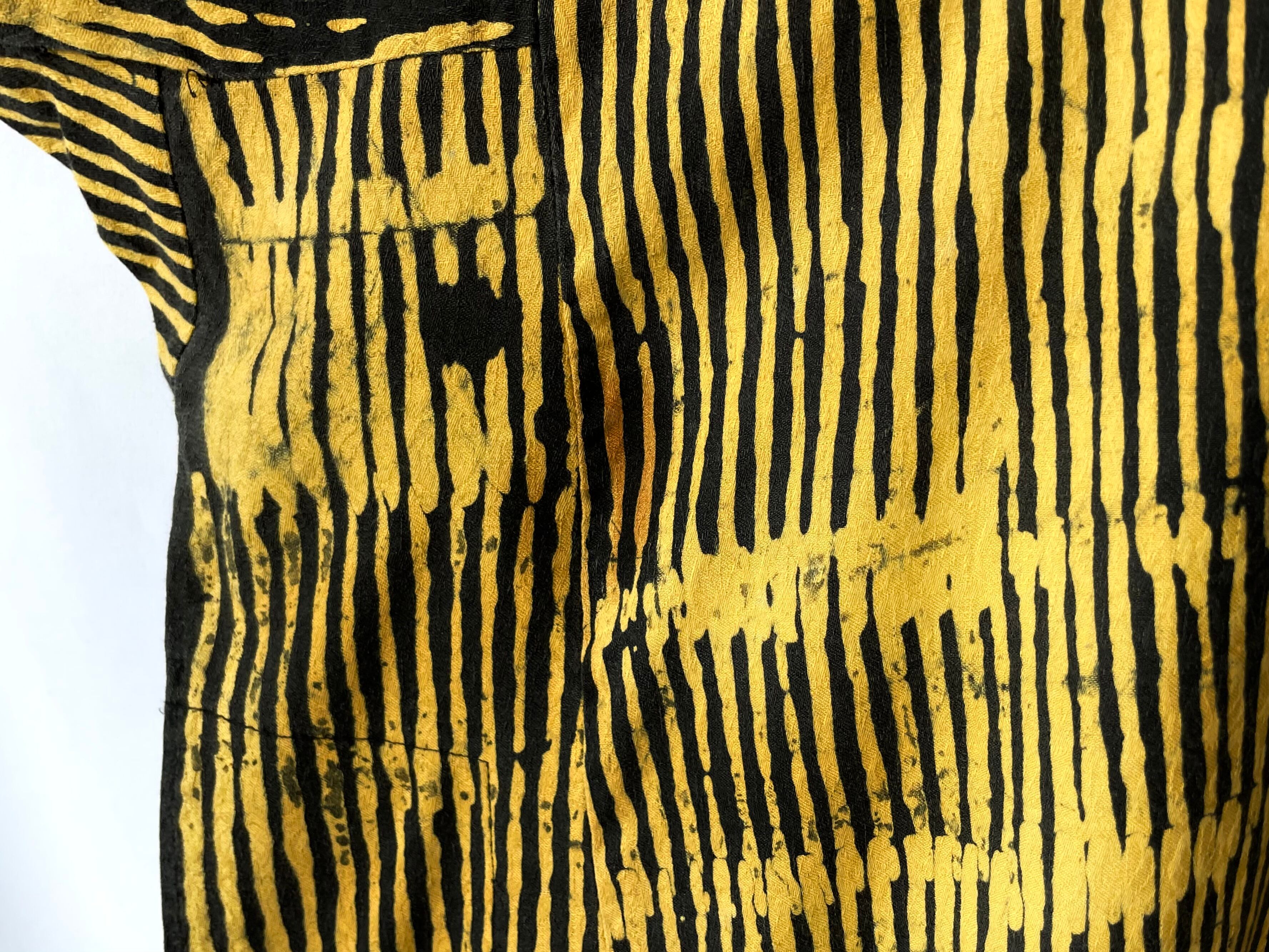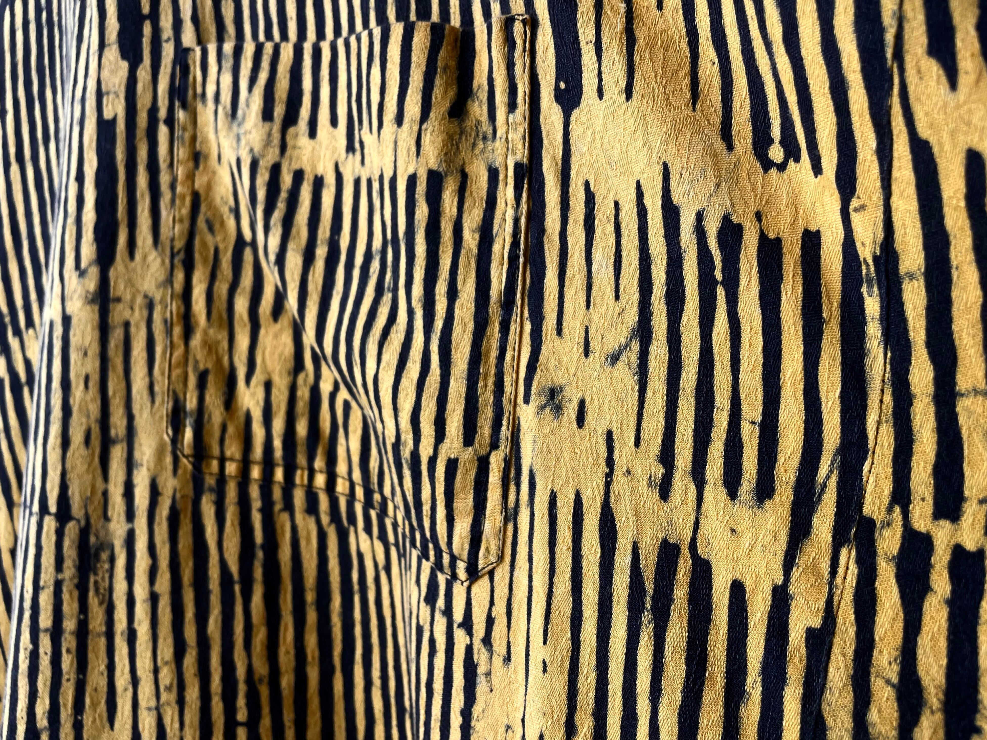 樹木の様な細かな織柄の上に、むらのある黒の染料が乗せられた独自の総柄。